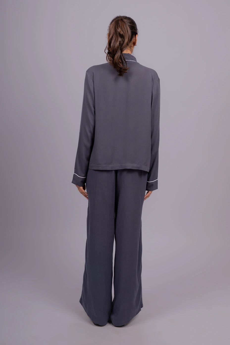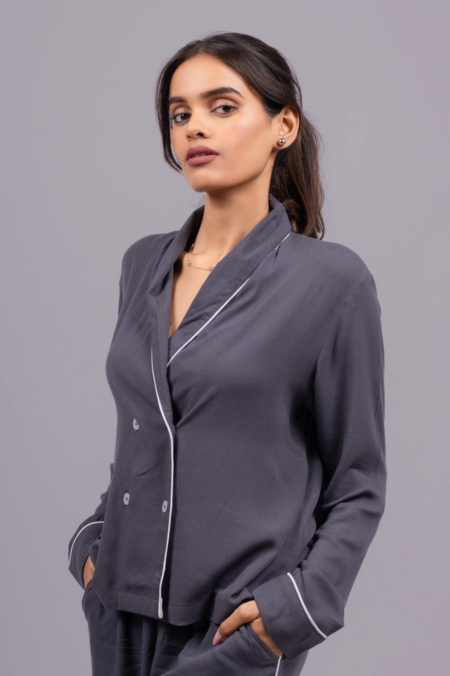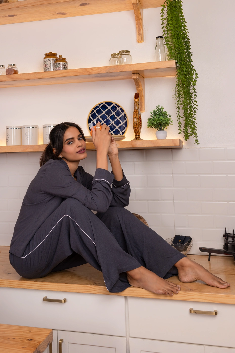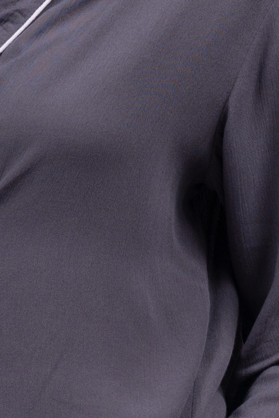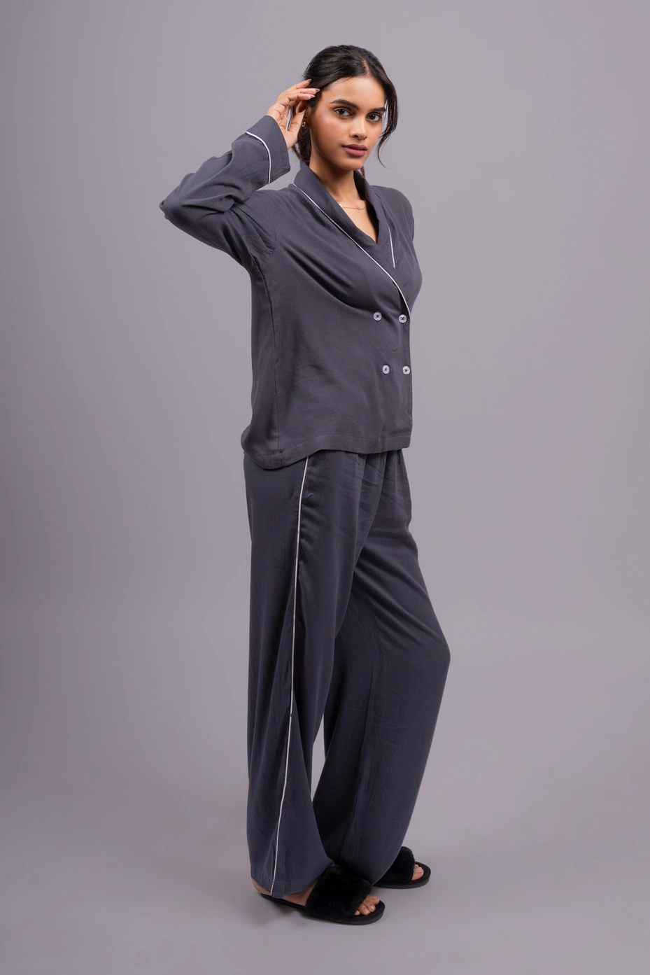 Get unready after a tiring day at work in this grey night suit. The shirt features a shawl collar, full sleeves, and an overlap hem with piping details. The pants feature a relaxed fit and two side pockets. Relax as you lounge in this stylish lounge set made from viscose fabric to ensure breathability and comfort.