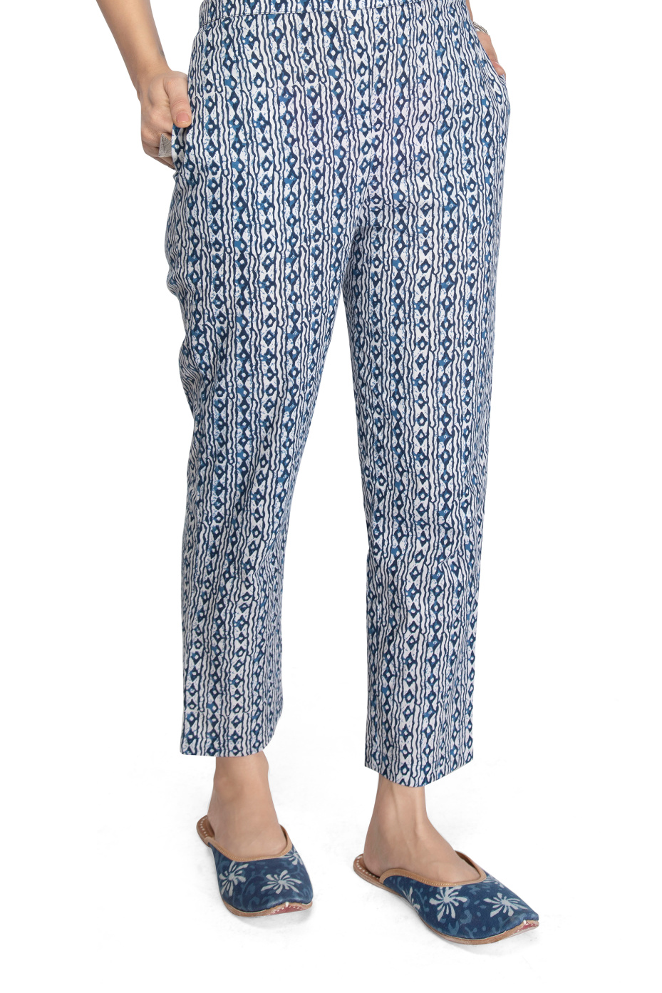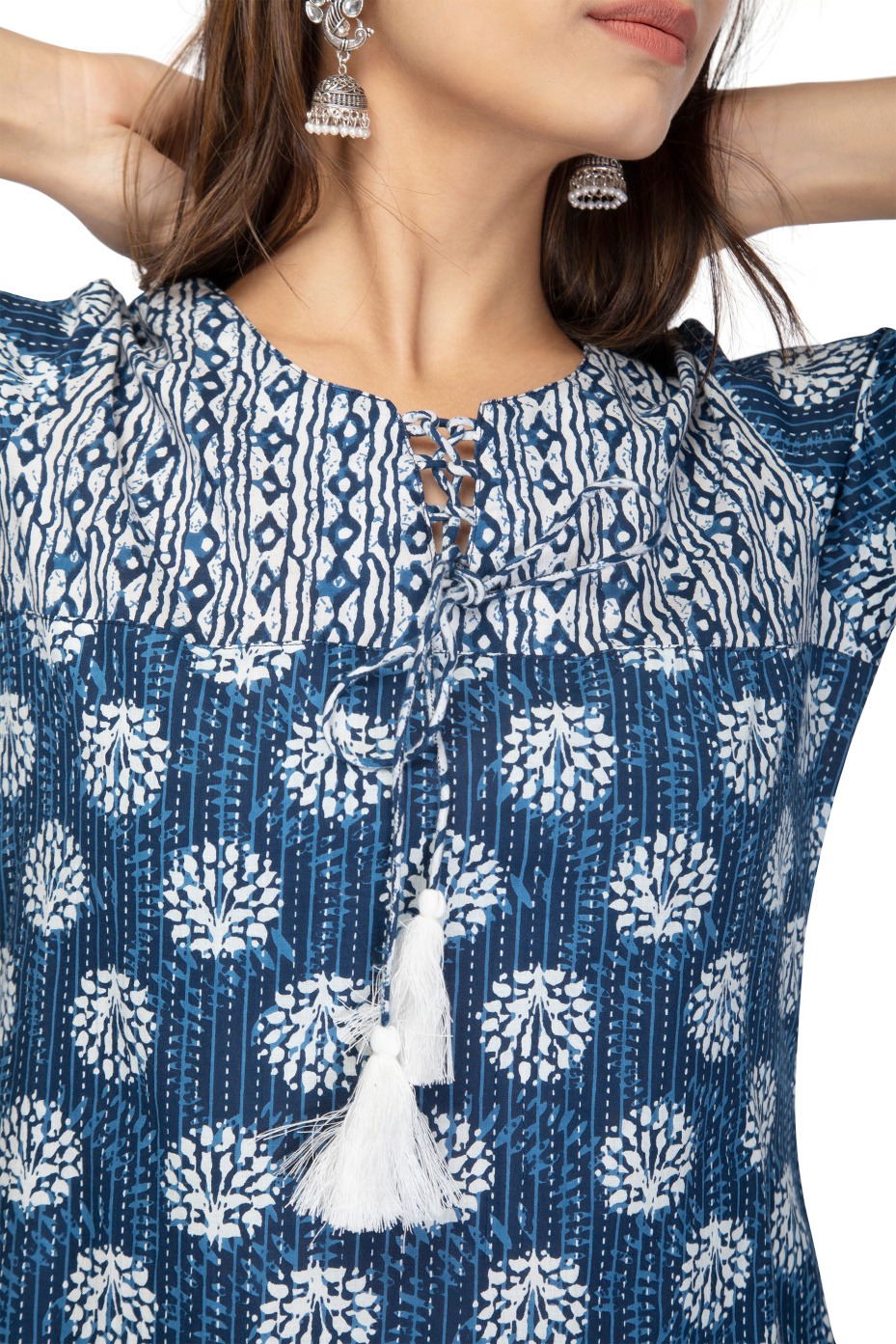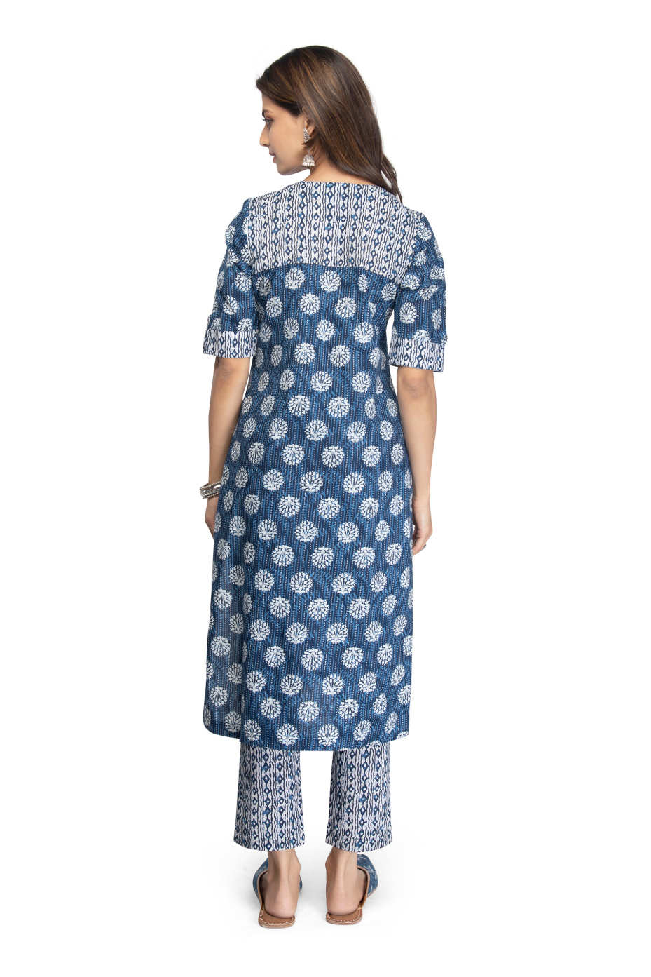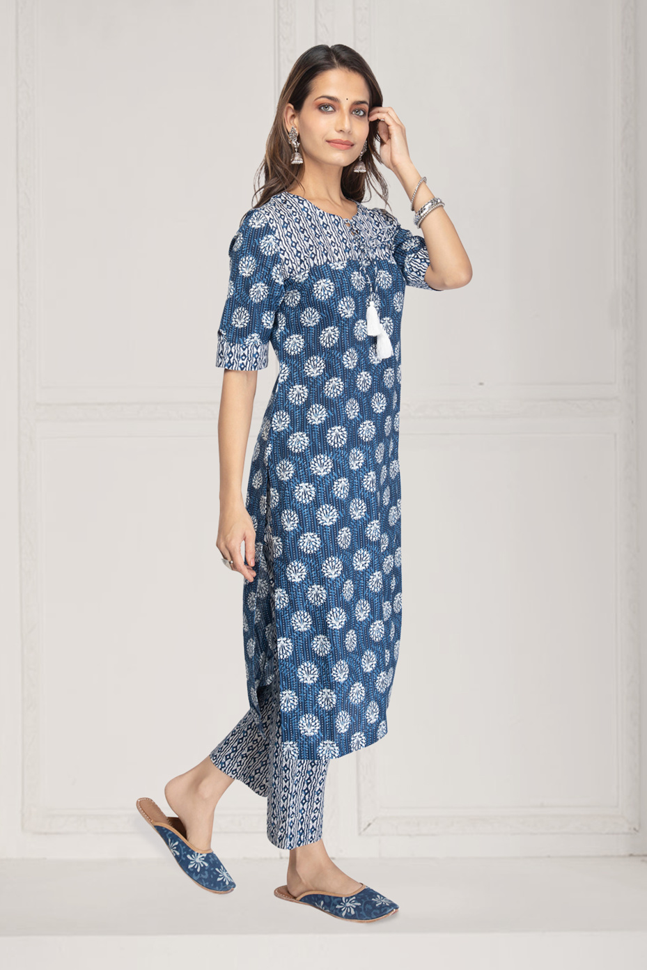 Indigo Cotton Yoke Detail Printed Kurta With Pant 2 Pcs Set