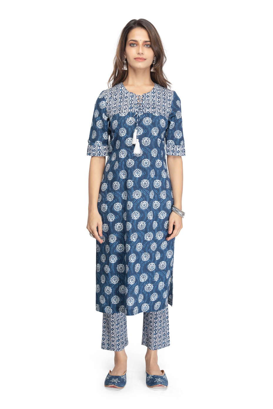 Discover awesomeness with our yoke kurta with straight pants. Made with quality cotton, features a calf-length straight kurta, elbow sleeve, Indigo floral print. Style your ethnic wear by adding Indian sandals and oxidized earrings.