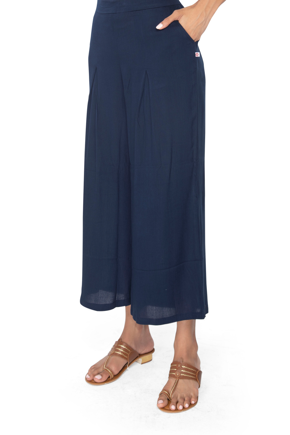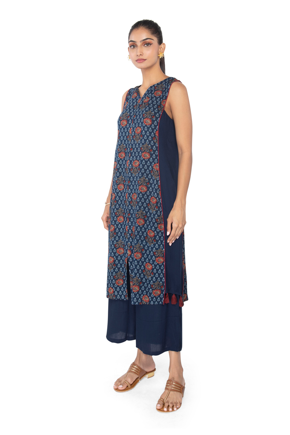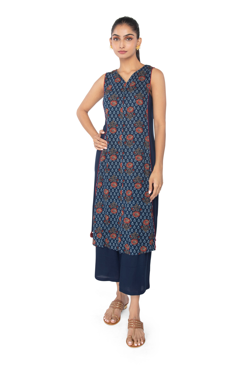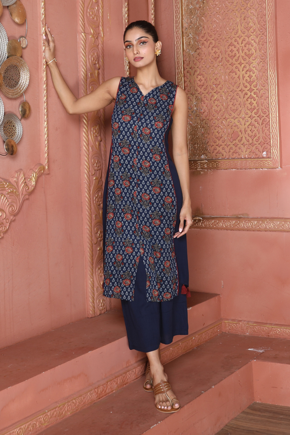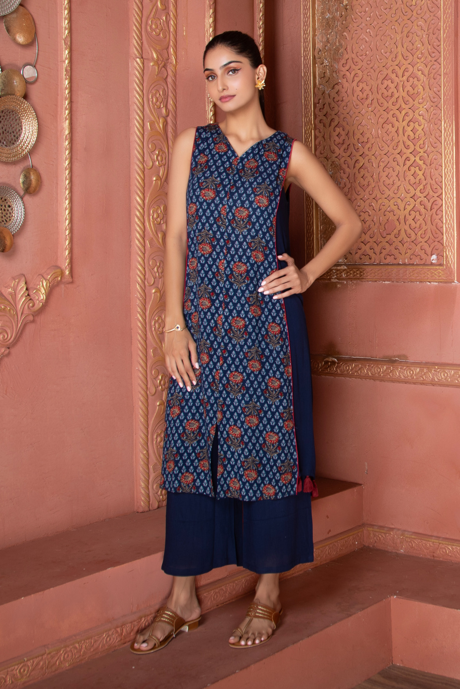 Explore the ultimate level of comfort with our sleeveless kurta set. The product contains a panel kurta and a cotton palazzo set. Spark up your look with Indian sandals and oxidized earrings.