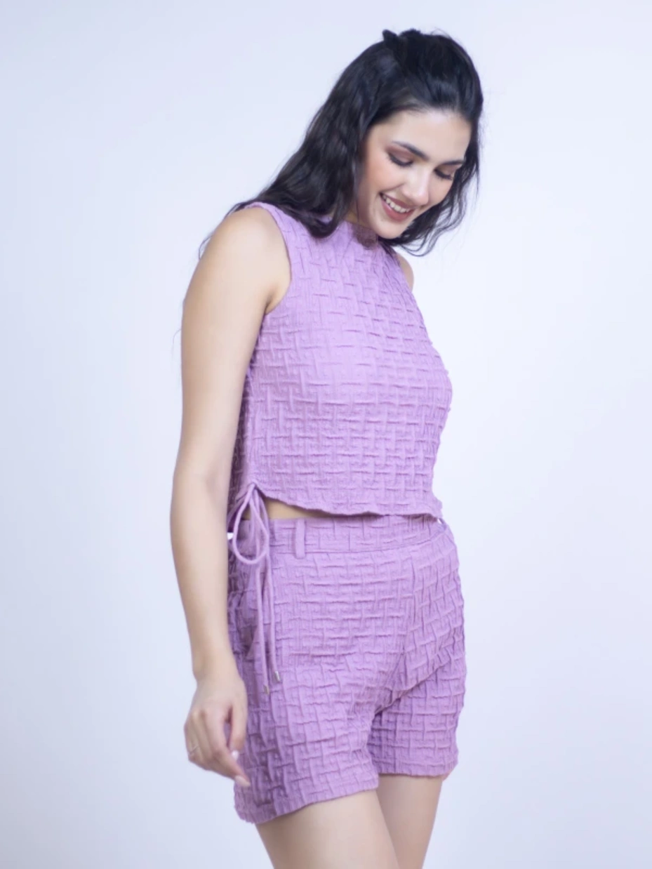 Create a chic, laid-back look with this lavender crop top and shorts co-ord set. The lavender crop top features waffle texture, a round neck, a sleeveless cut, and a side drawstring. The shorts feature an elasticated waist, and functional two-sided pockets. Get this matching lavender crop top and shorts co-ord set made from a poly-elastane blend that offers wrinkle resistance and all-day comfort.