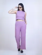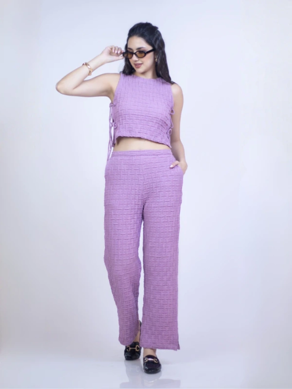 Showcase your ultimate style with this lavender crop top and trouser co-ord set. The lavender crop top features waffle texture, a round neck, a sleeveless cut, and a side drawstring. The trousers feature an elasticated waist, and functional two-sided pockets. Get this matching lavender crop top and trouser co-ord set made from a poly-elastane blend that offers wrinkle resistance and all-day comfort.