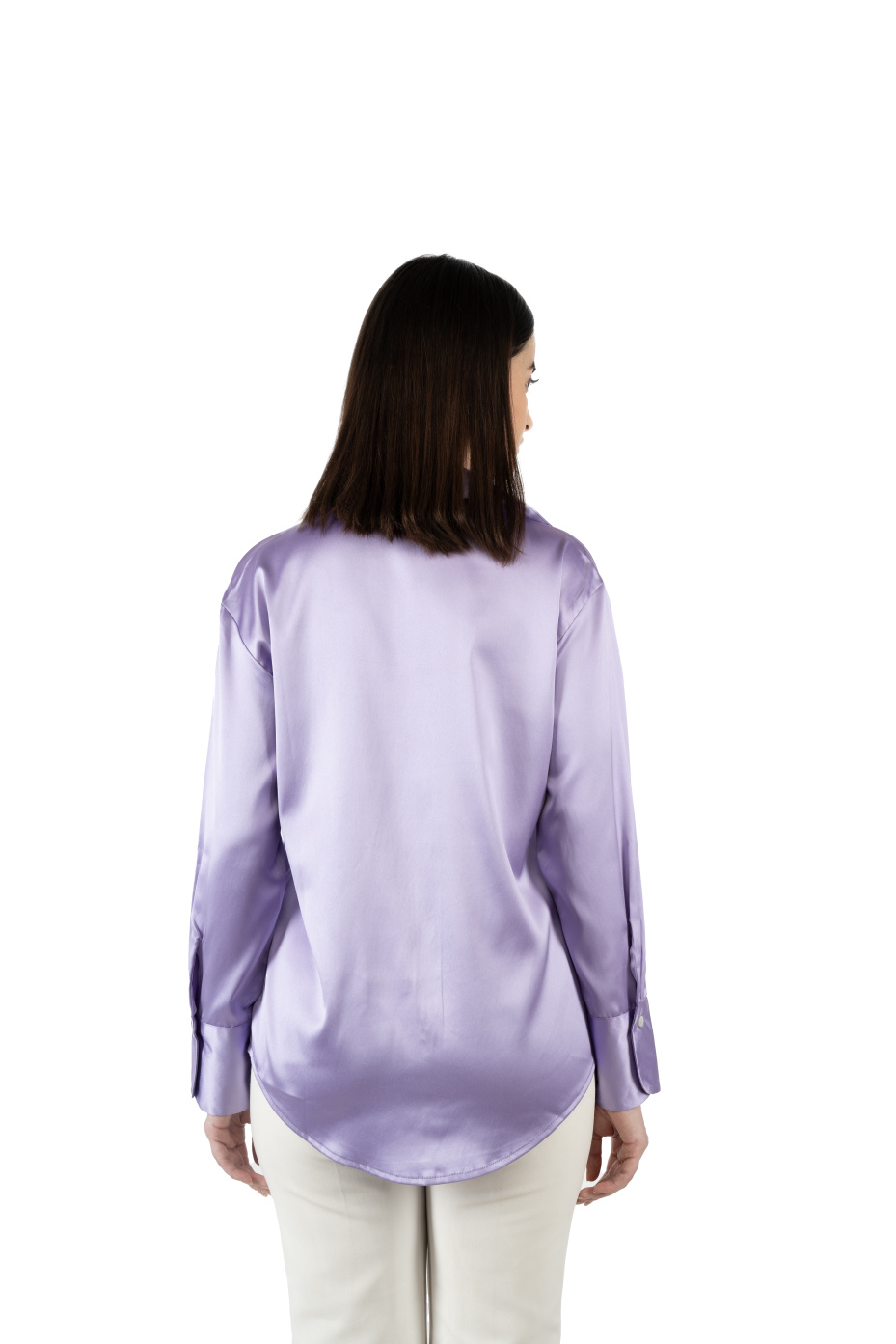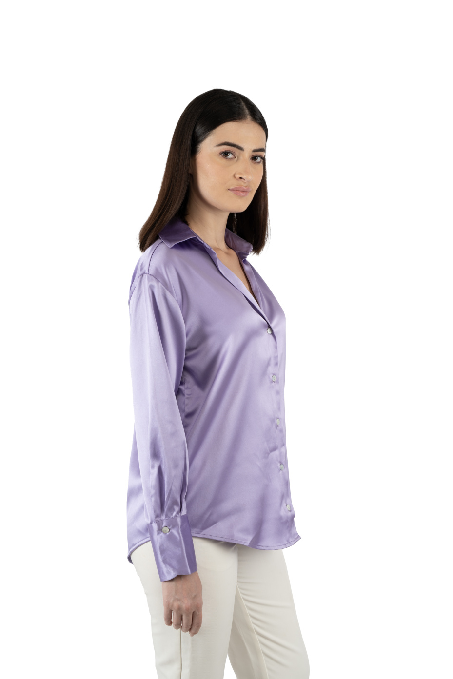 Make a lasting impression with this lavender formal shirt. It features a collar neck, full- sleeves, regular length, and a curved hemline. The satin fabric is smooth and anti-wrinkle, perfect for a formal event. Pair it with white formal pants, heels, and gold hoop earrings for a sleek look.