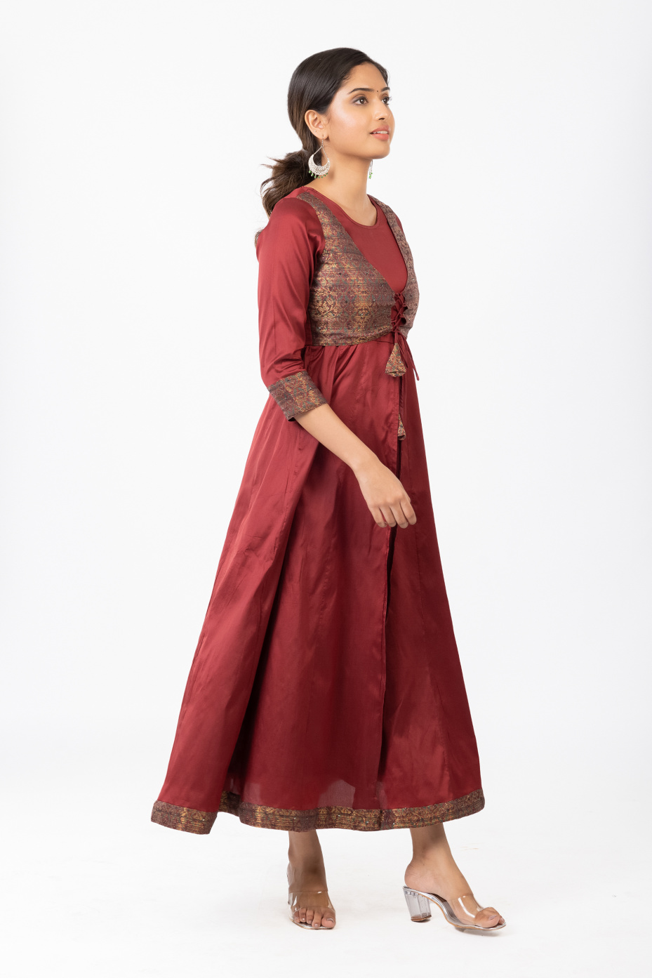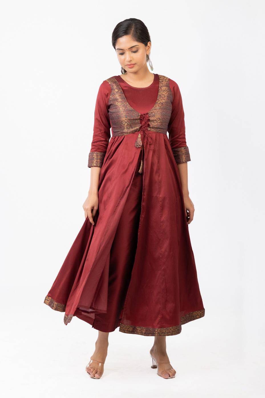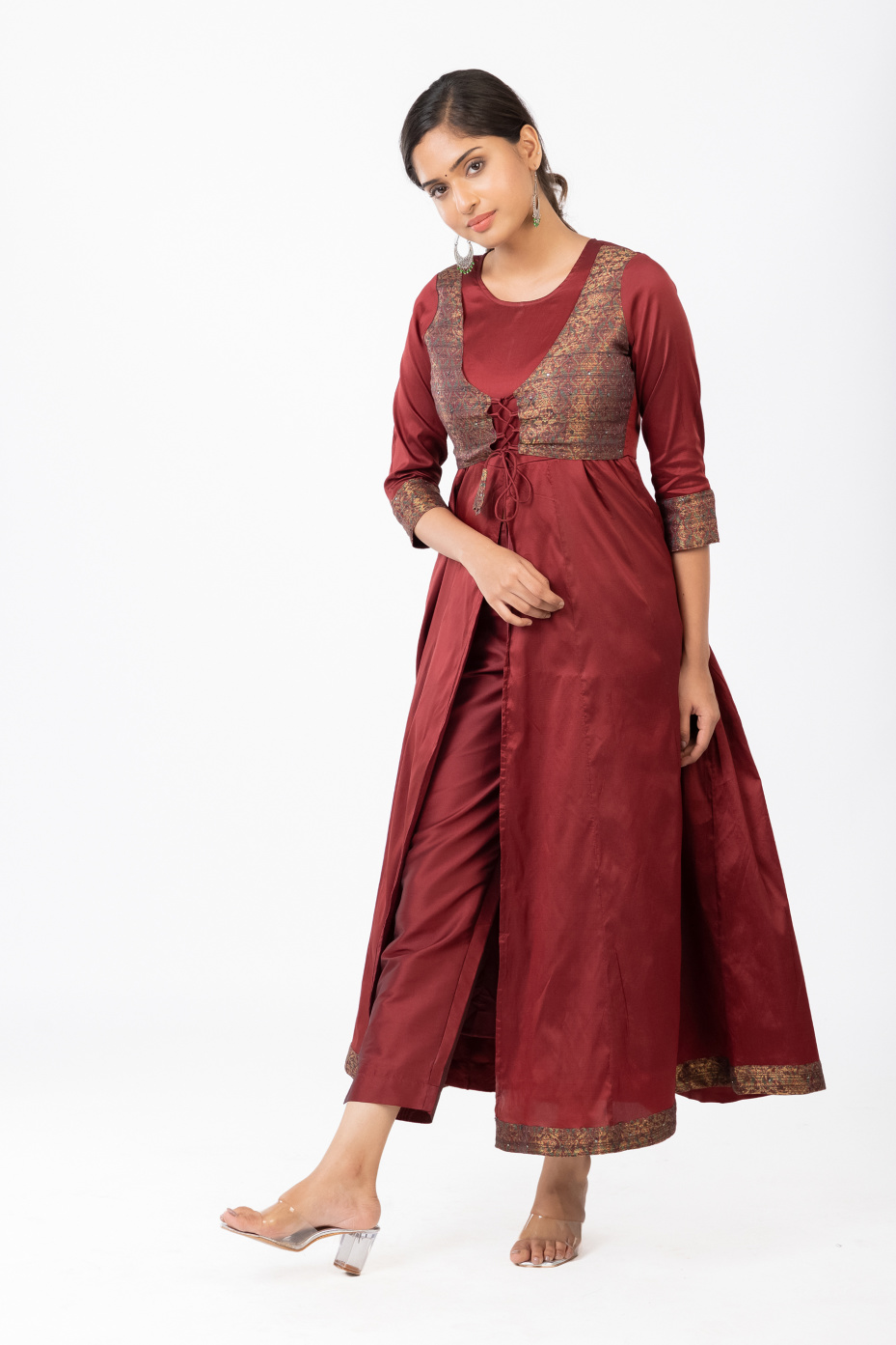 The maroon silk & jacquard anarkali slit open kurta with straight pants for women has a dash of shimmer and shine that is popping out to make the outfit feel dressier. Highlighted with jacquard fabric in the neckline, hemline, and cuff.