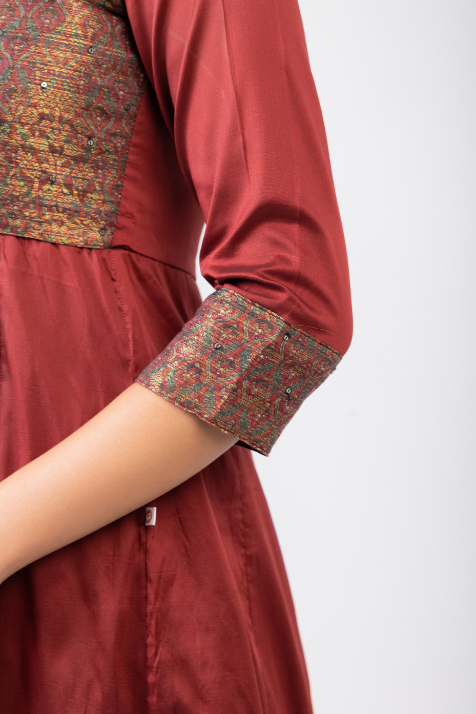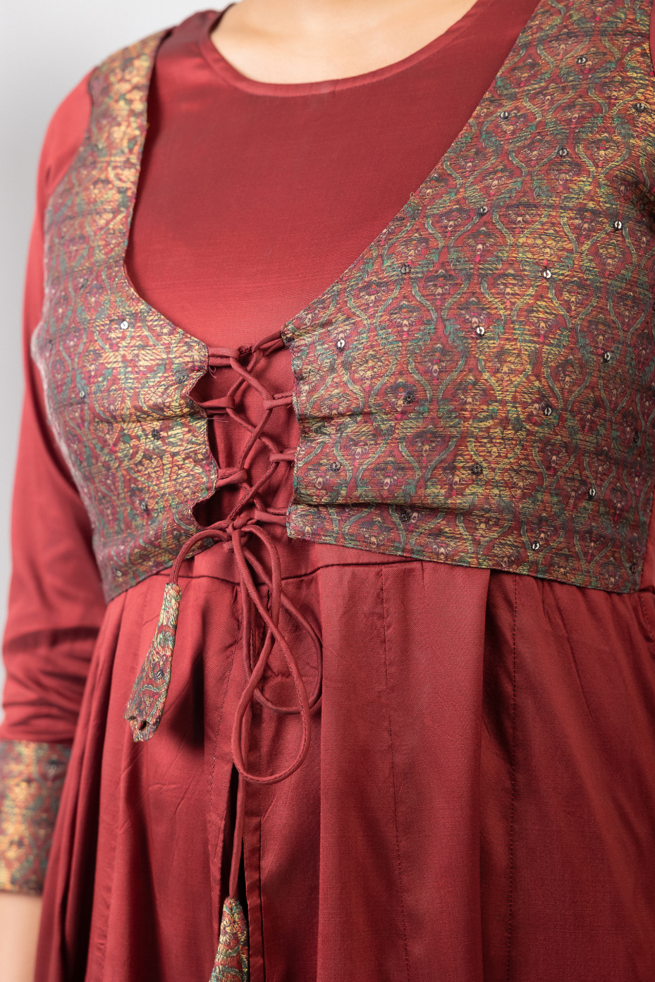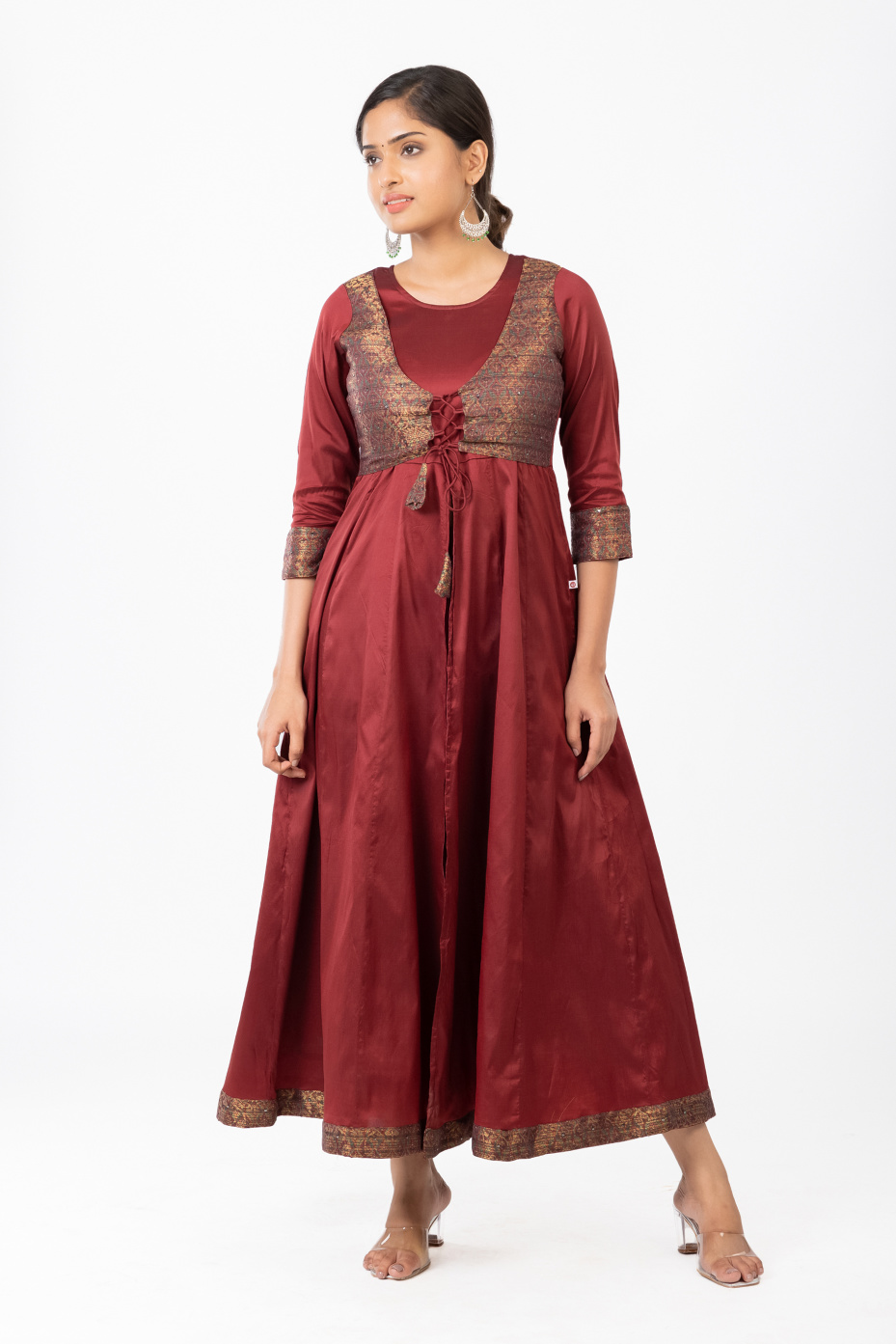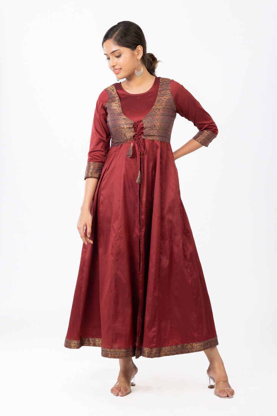 The maroon silk & jacquard anarkali slit open kurta with straight pants for women has a dash of shimmer and shine that is popping out to make the outfit feel dressier. Highlighted with jacquard fabric in the neckline, hemline, and cuff.