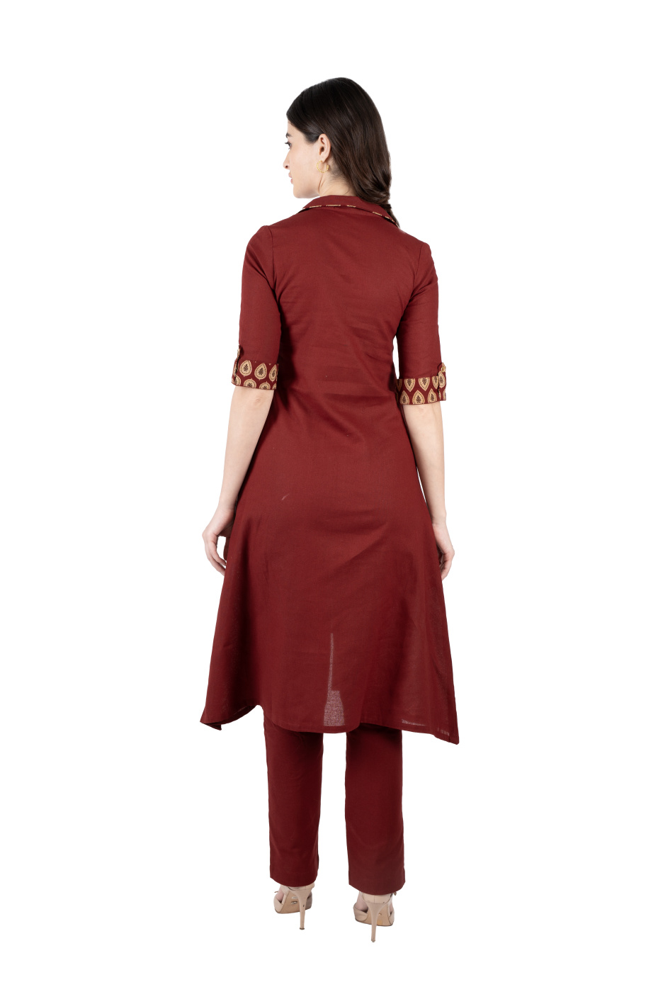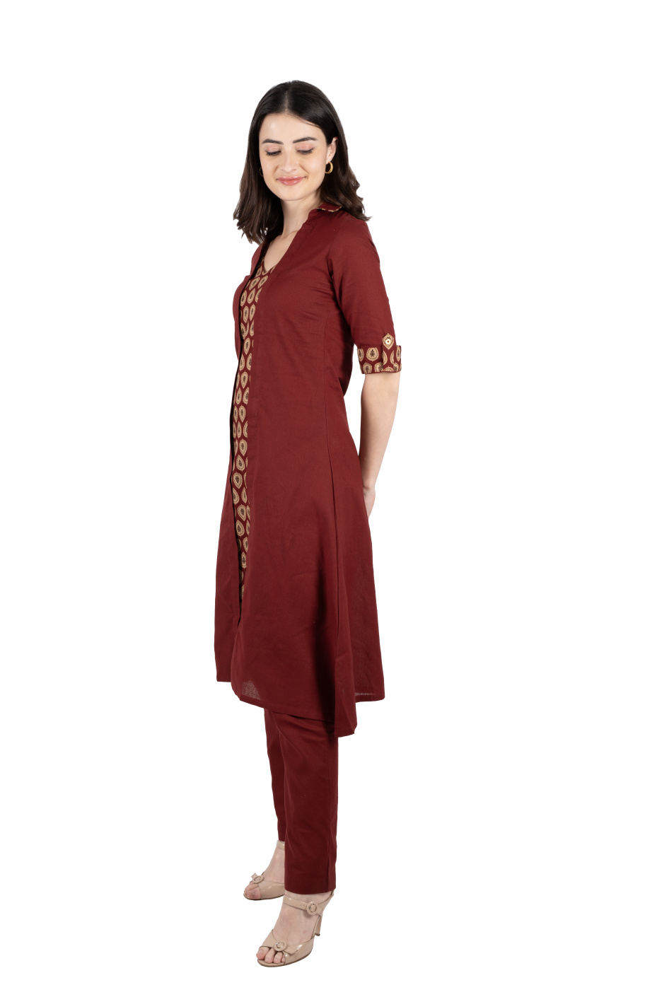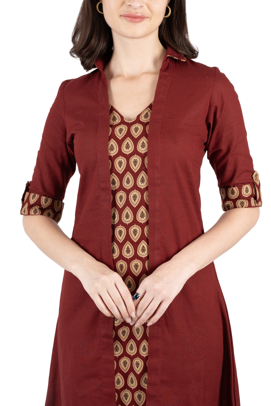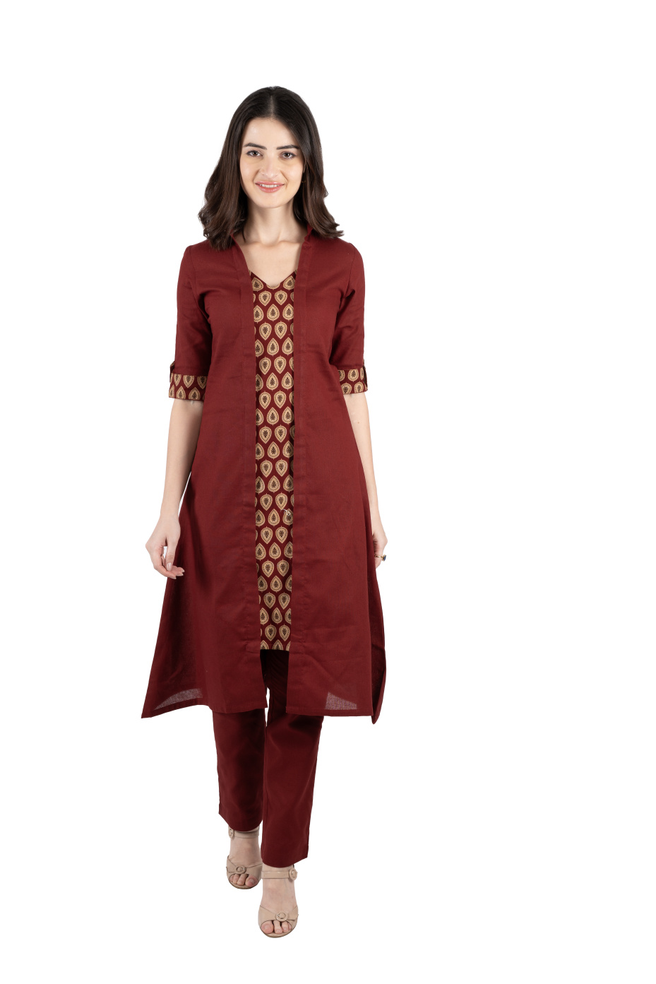 Step into a world of ethnic elegance and grace with this A-line kurta. It features a stand collar, print detailing, and three-quarter sleeves. Crafted with cotton fabric, it ensures softness and long-lasting comfort. Pair it with heels, traditional earrings, and bangles for a puja ready look.