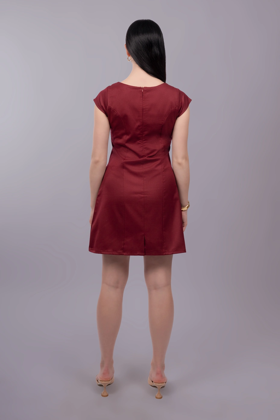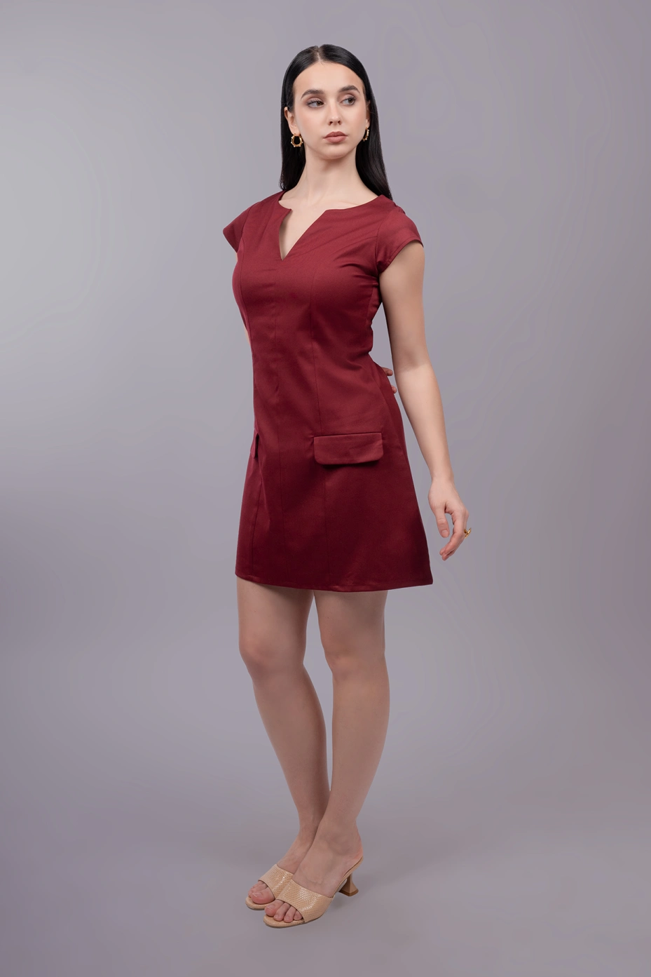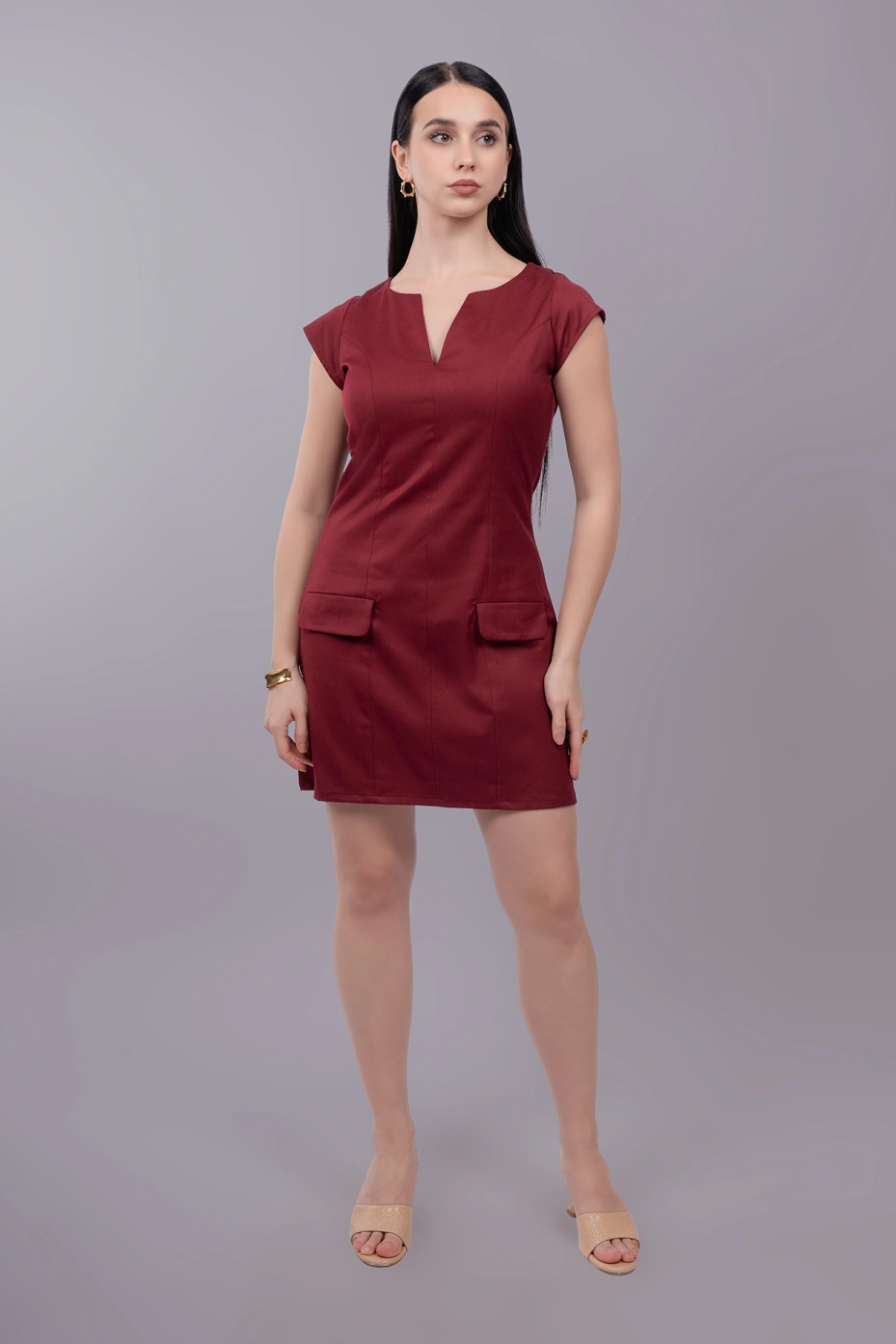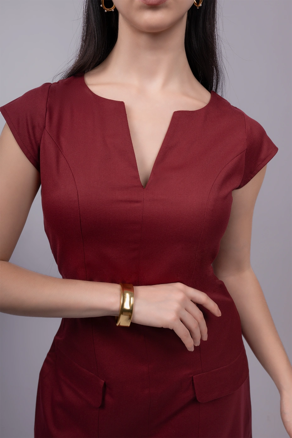 Master your formal meeting look with this maroon formal dress. It features a round V-neckline, cap sleeves, and above knee-length with a flattering silhouette that ensures ease of movement and all-day comfort. The fake pocket details at the thigh add a subtle, modern twist to this classic design. Crafted from premium club lycra fabric, this dress offers a structured fit, breathability, and stretch — perfect for busy workdays, corporate events, or after-hours networking.