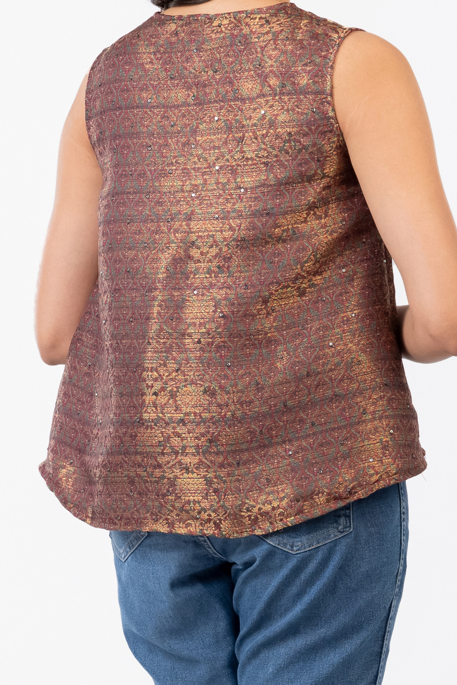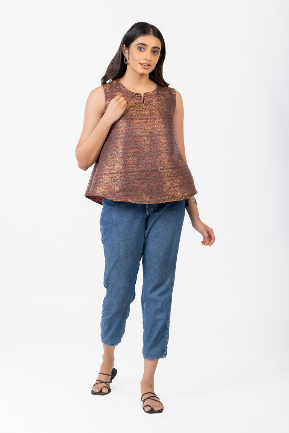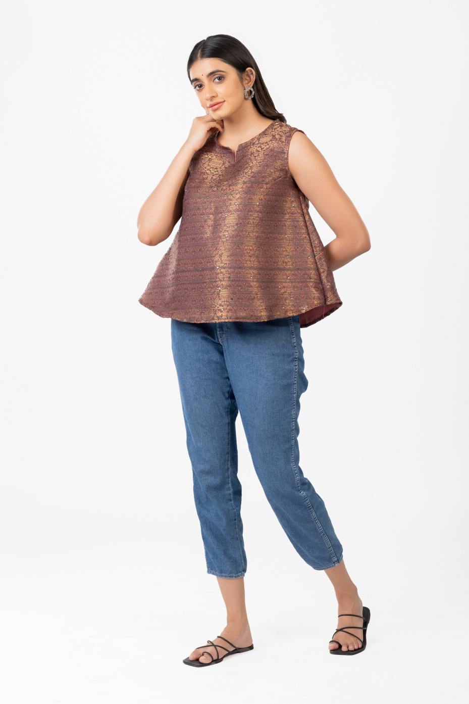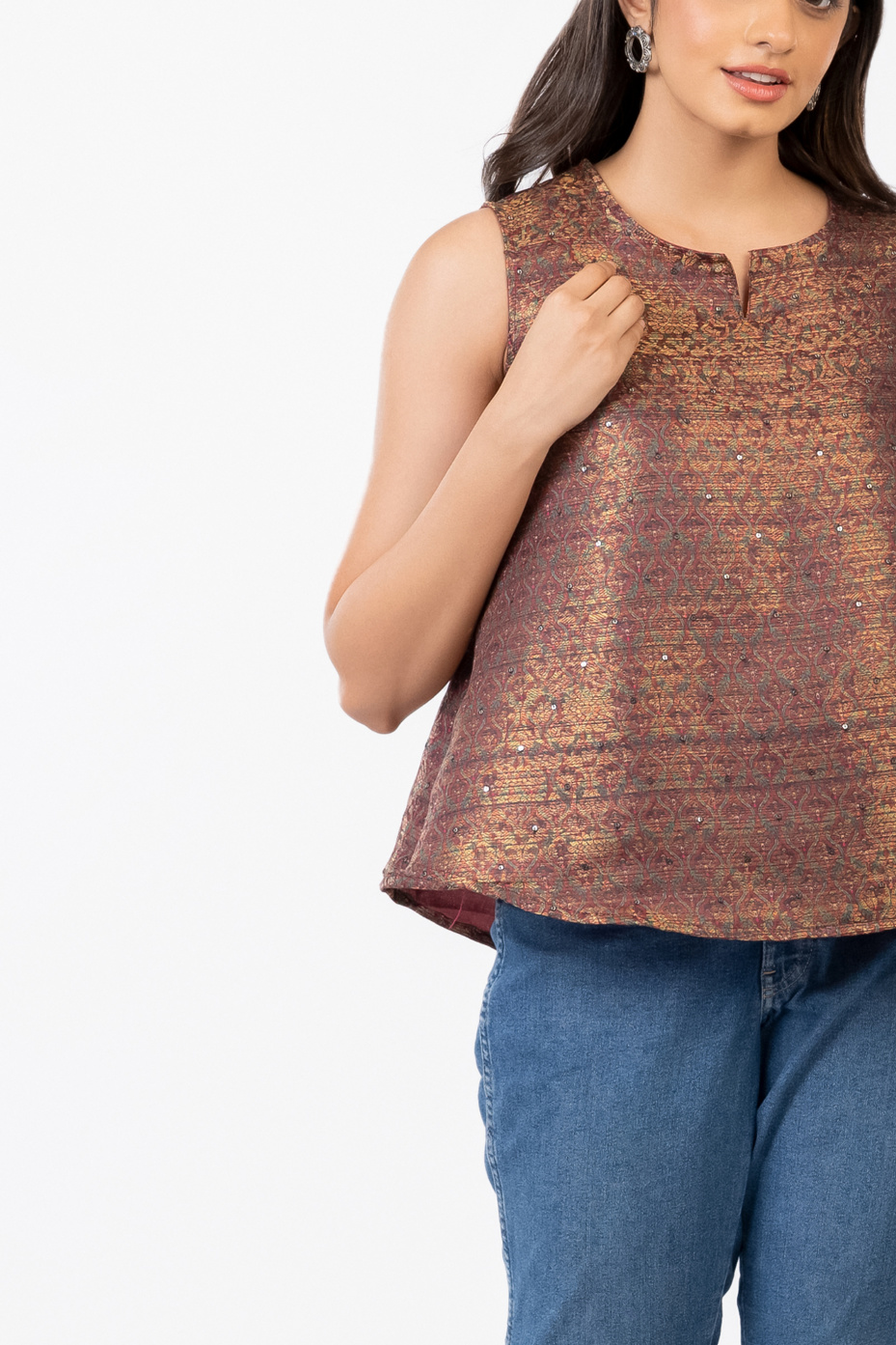 This paneled A-line top features, beautiful woven maroon thread, which is sophisticatedly crafted in jacquard fabric to add extra glam to your occasional wear. It is highlighted with gold embellishment in the neckline and hem.