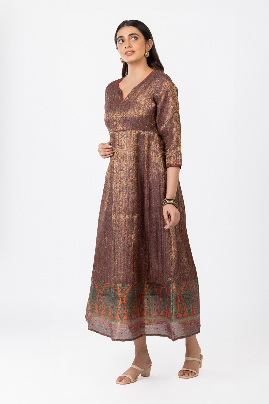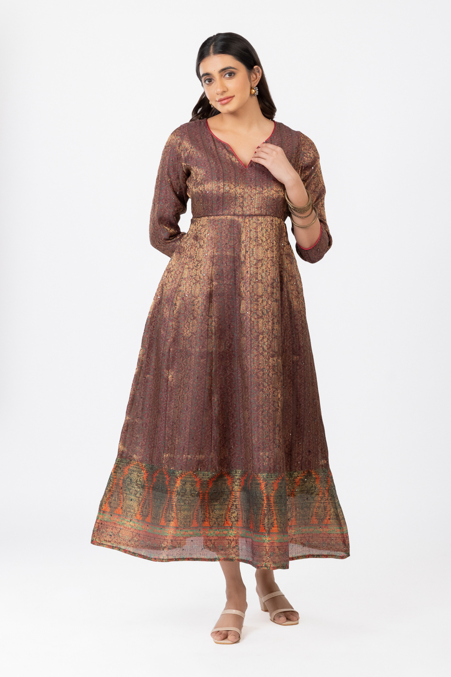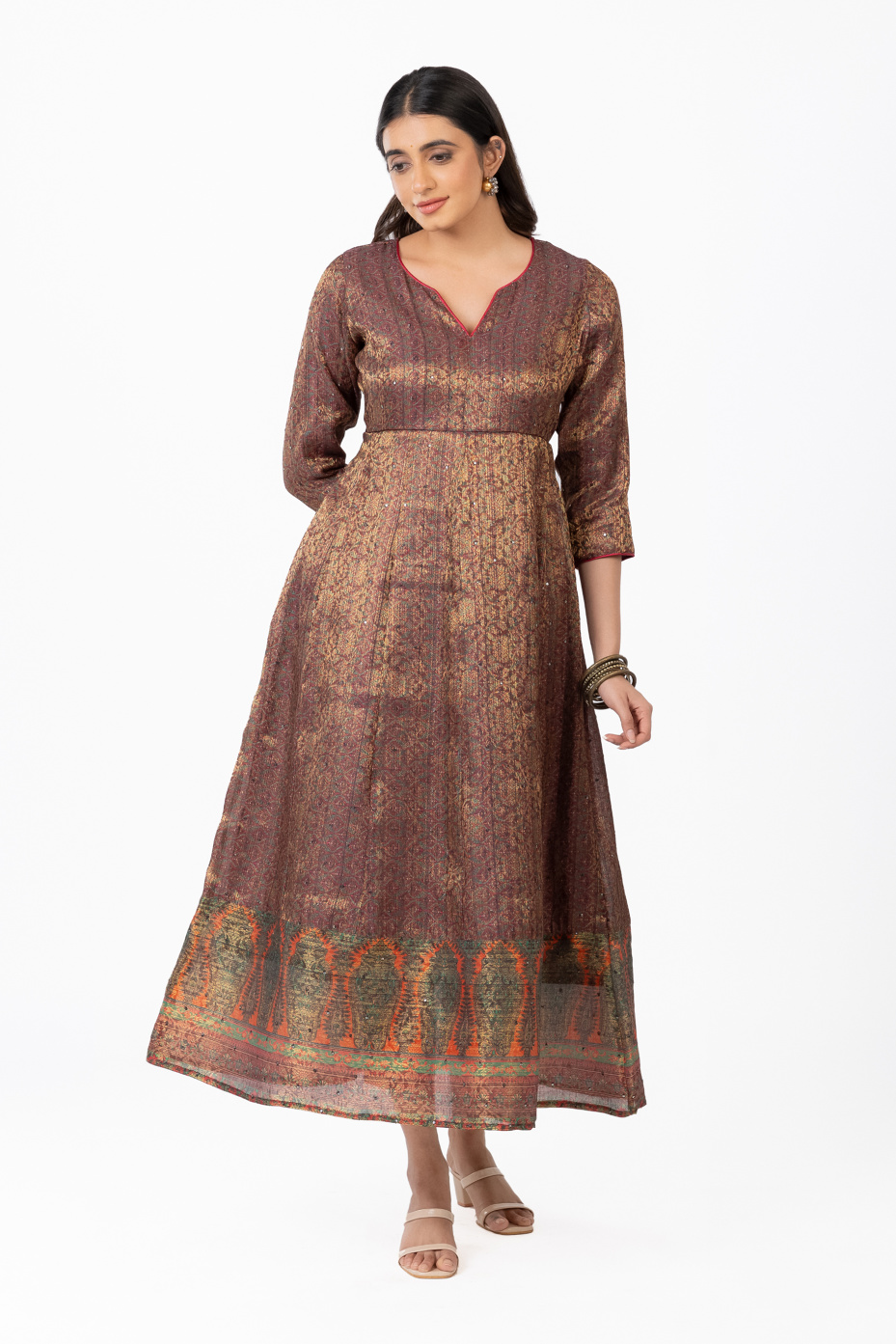 Flaunt in this versatile piece of maroon intricate Jacquard loom full anarkali paneled dress for women. That comes with highlighted features like rust orange piping with a V neck and a thick border in the hemline. That makes it ideal for an occasional wardrobe.