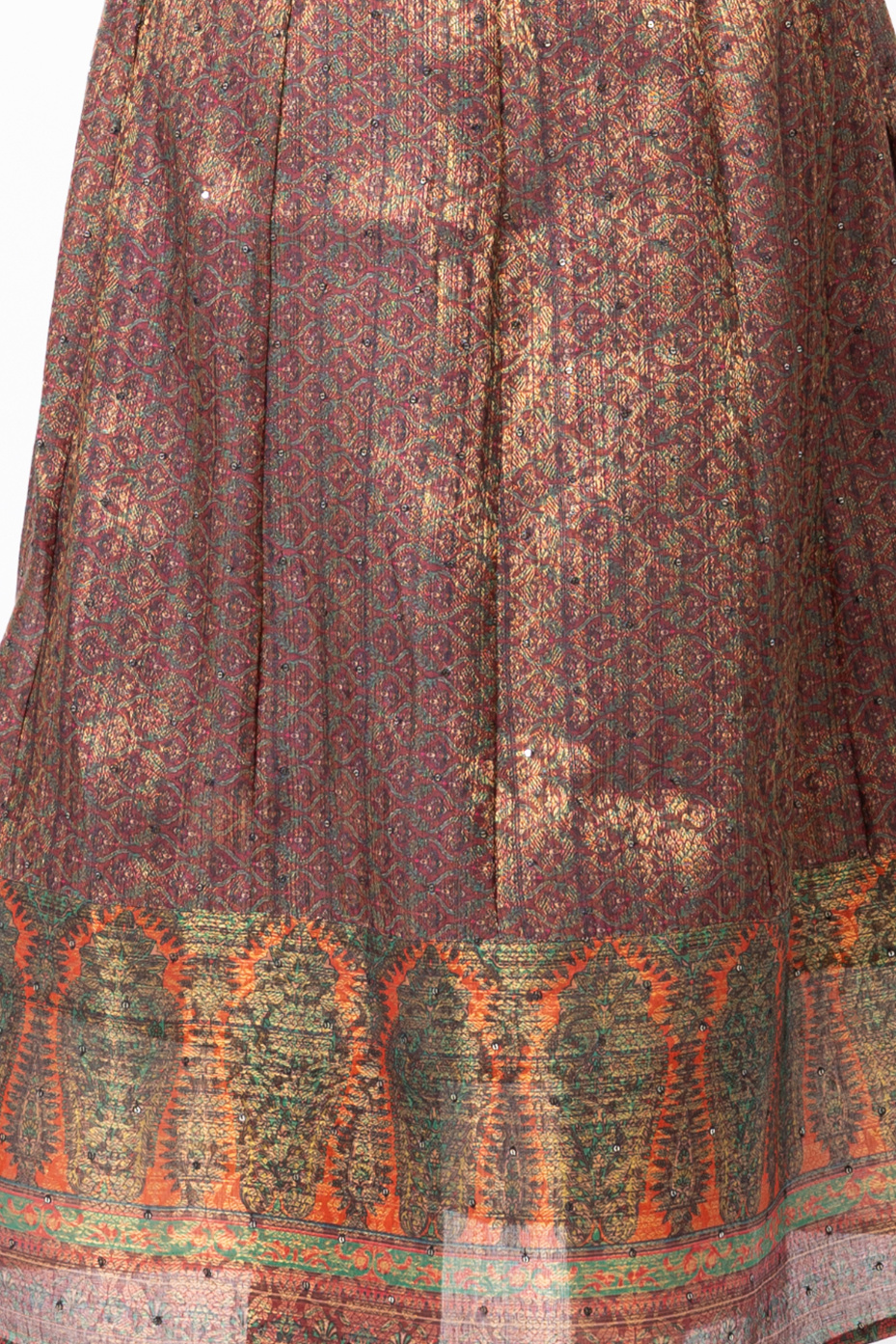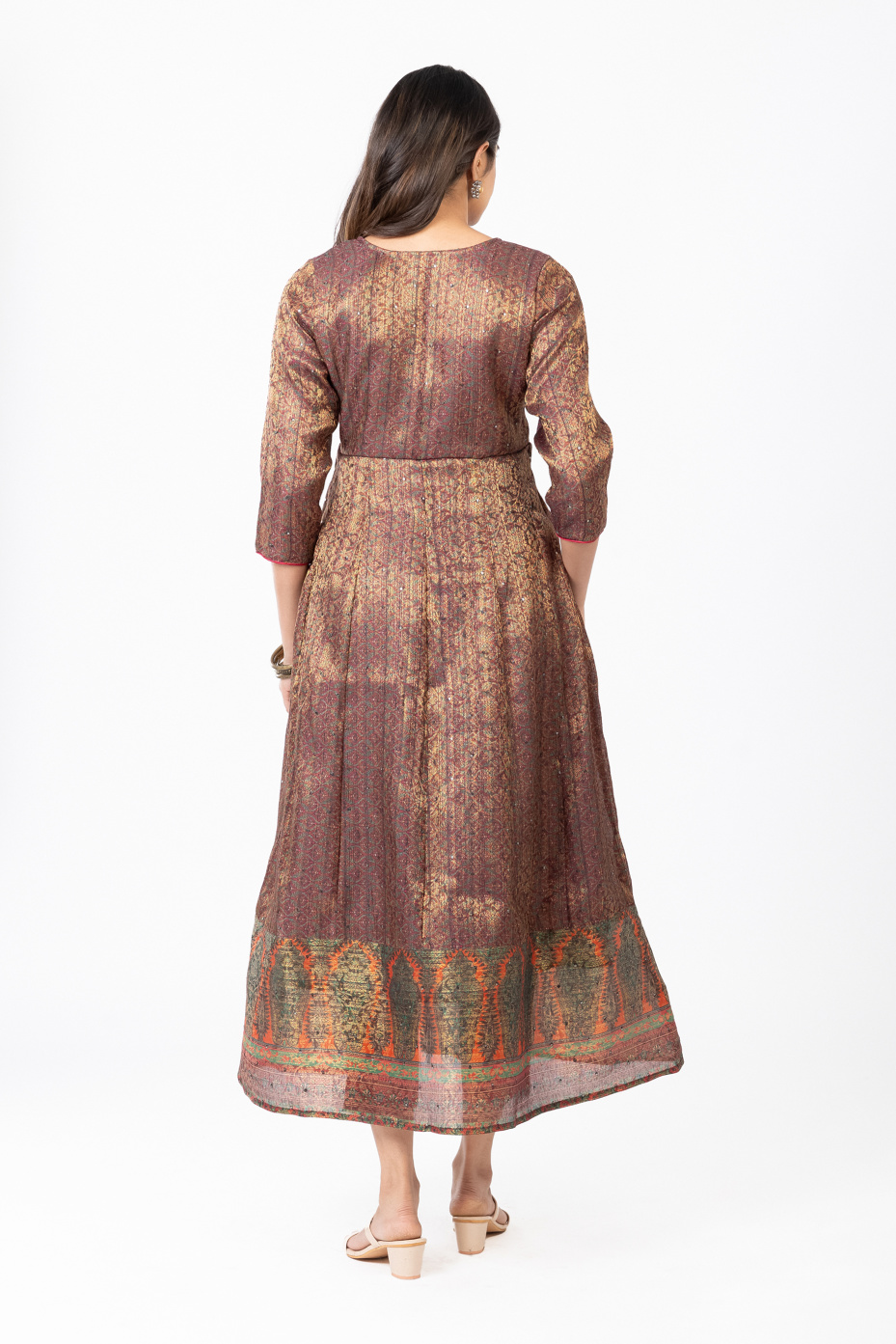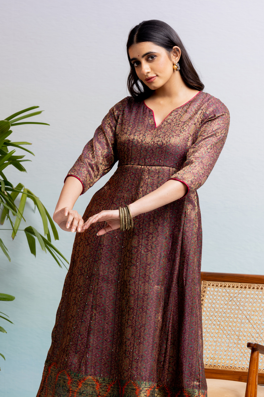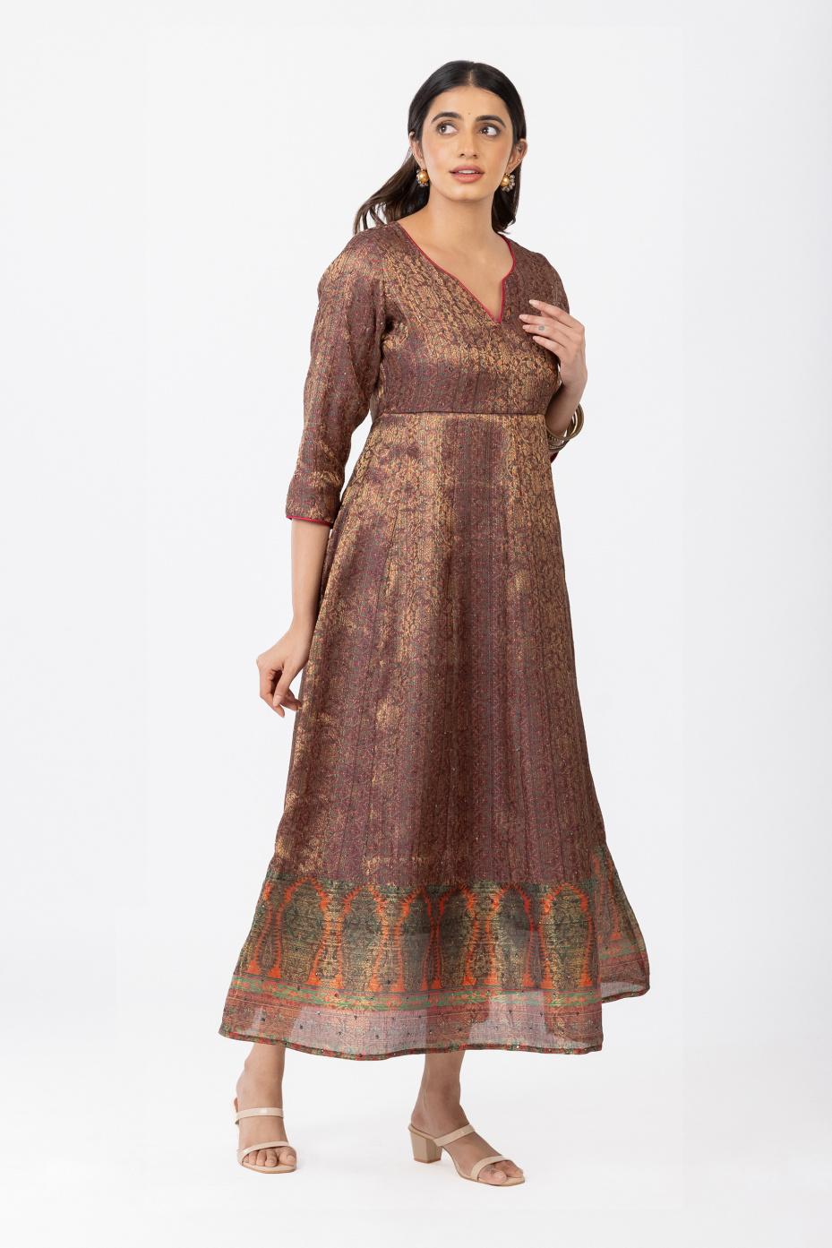 Flaunt in this versatile piece of maroon intricate Jacquard loom full anarkali paneled dress for women. That comes with highlighted features like rust orange piping with a V neck and a thick border in the hemline. That makes it ideal for an occasional wardrobe.