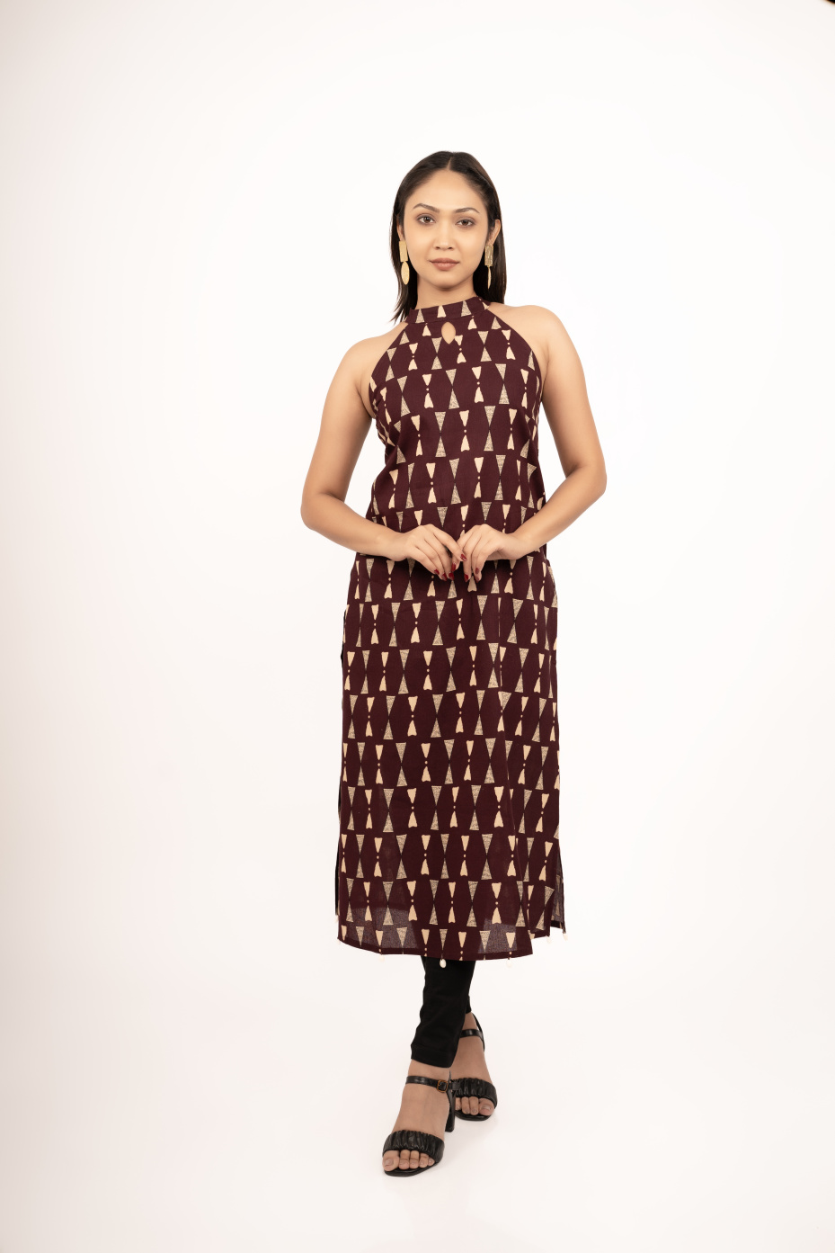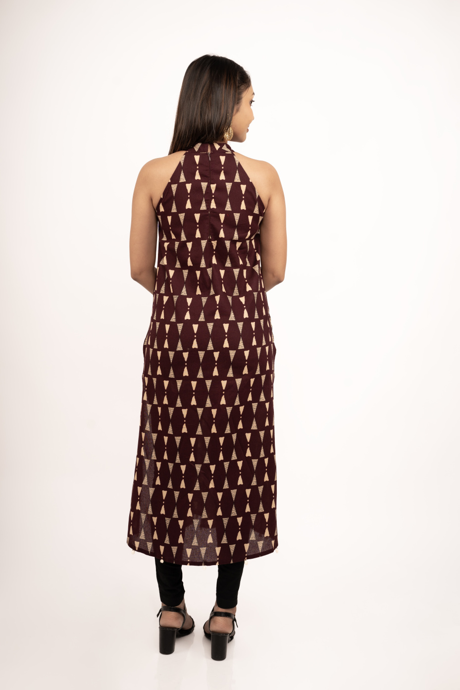 Celebrate the fusion of tradition and contemporary style with this maroon halter-neck kurta. It features an all-over motif print, sleeveless with halter neck style, and below knee length. This stunning fusion kurta is crafted from premium quality cotton fabric, offering both long-lasting comfort and style, making it an essential addition to your wardrobe. The elegant silhouette complements every body type, providing a flattering fit. Pair it with denims, heels, and a gold bracelet to create an Indo-fusion look.