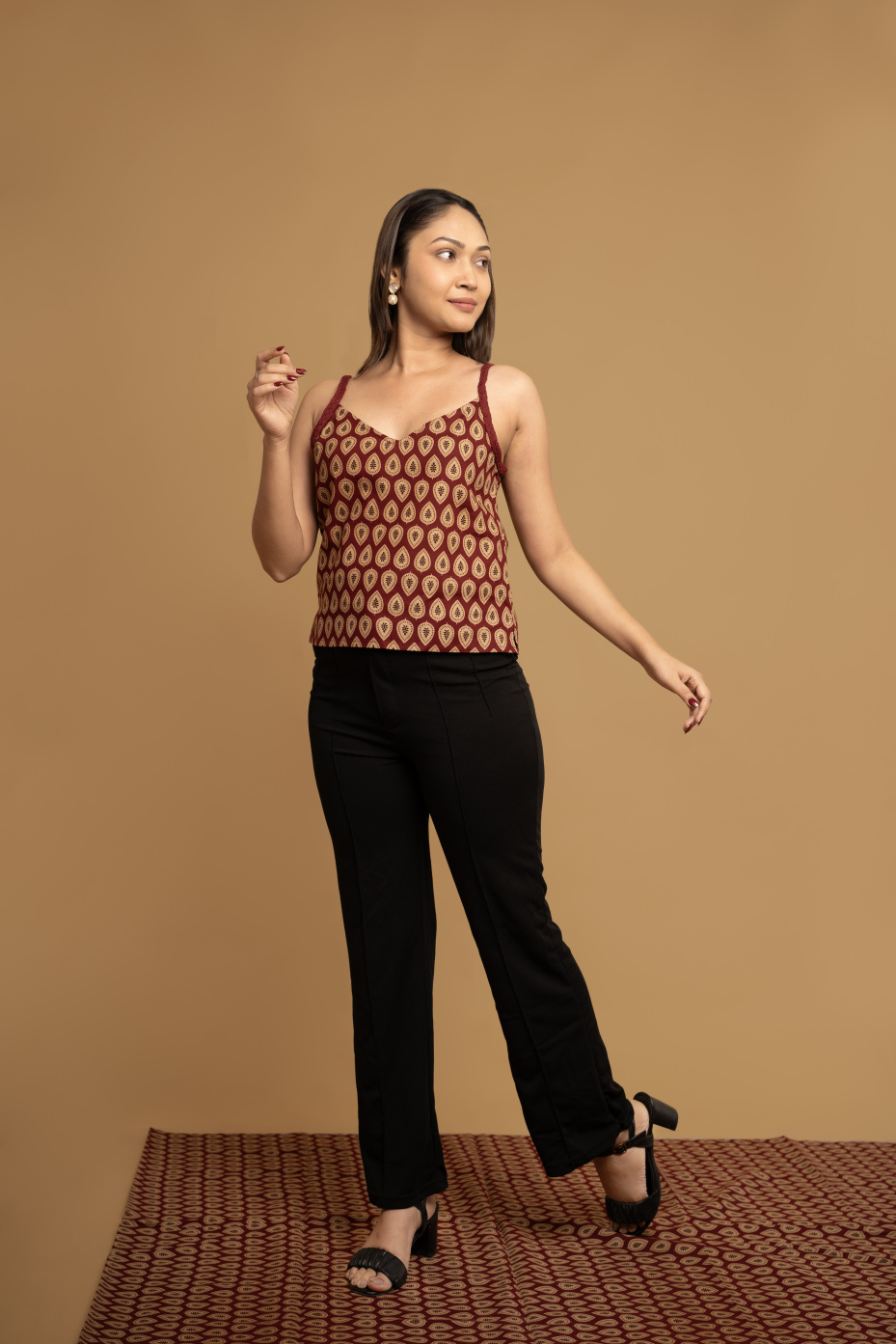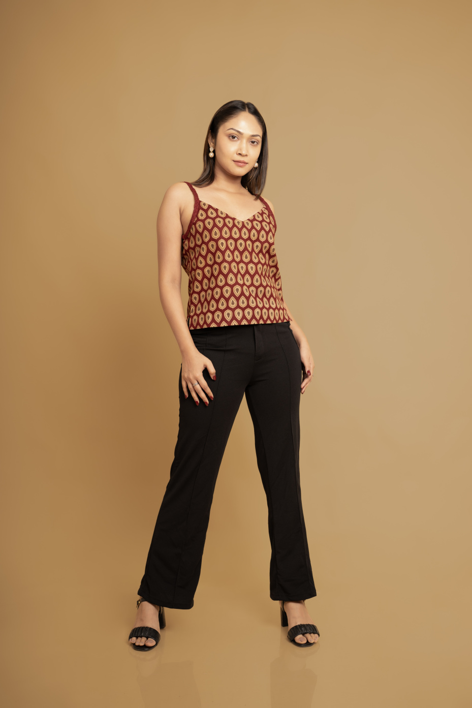 Office Look: Layer the top with a blazer, wear beige trousers pants, and maroon footwear.