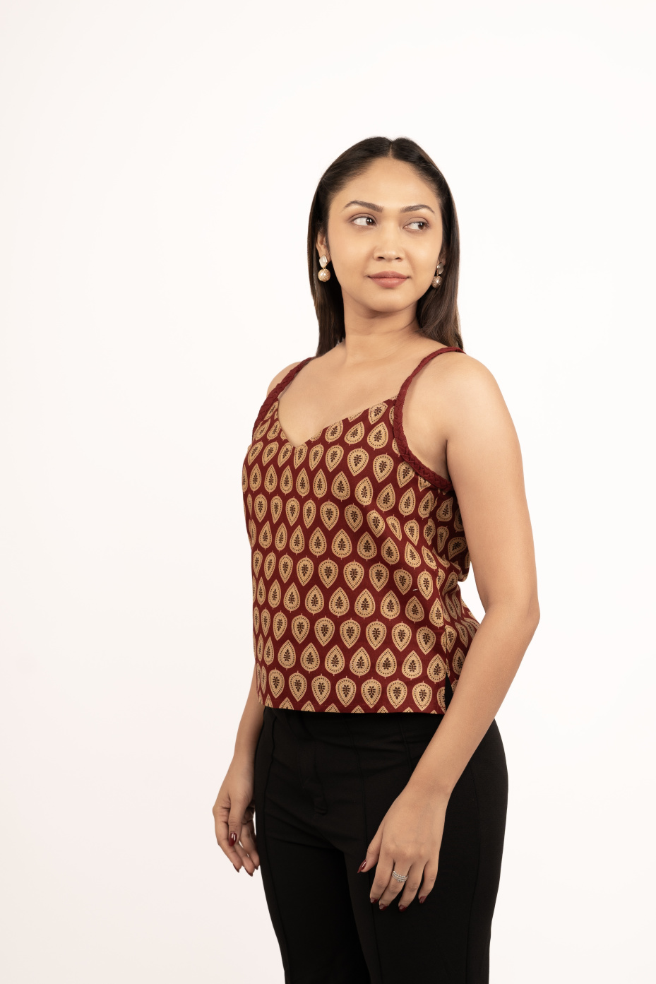 Step into a world of elegance and grace with this maroon cotton tank top. It features a V-neckline and sleeveless design with crop length. Crafted with cotton fabric, it ensures softness and long-lasting comfort. Pair it with denim jeans, ethnic jutties, and oxidized jewelry for a fashion-fusion look.