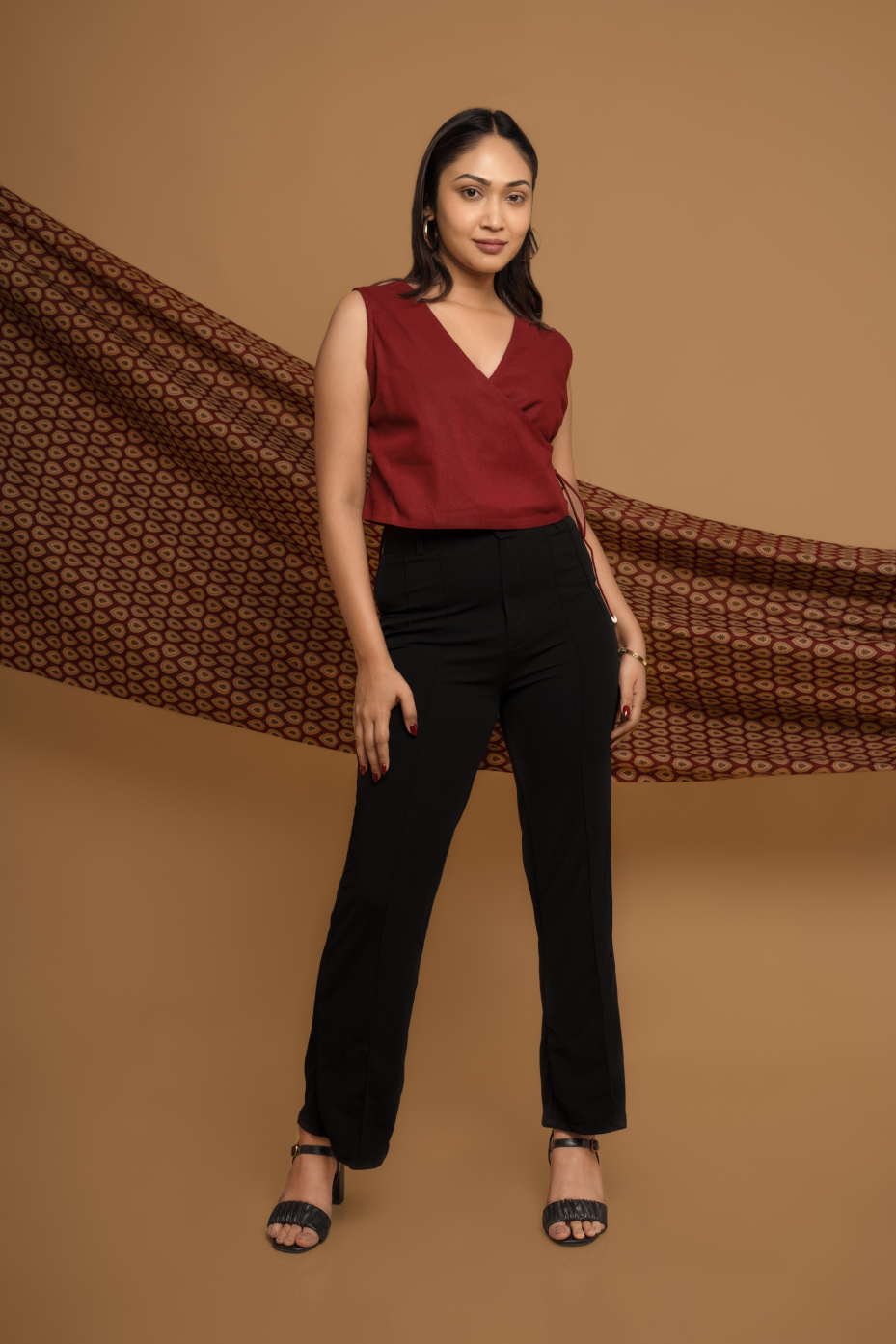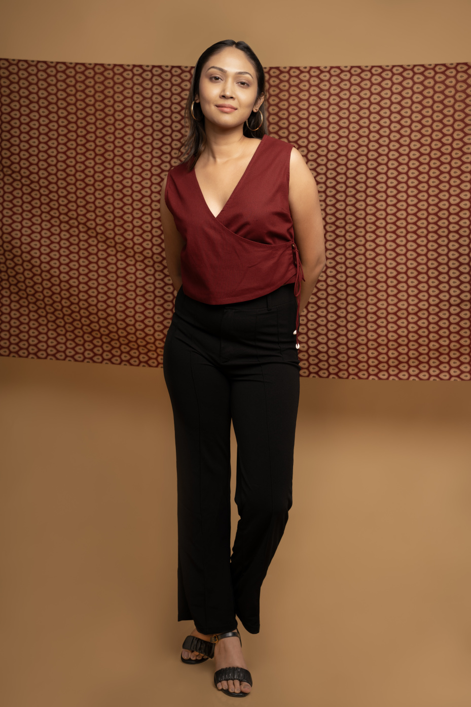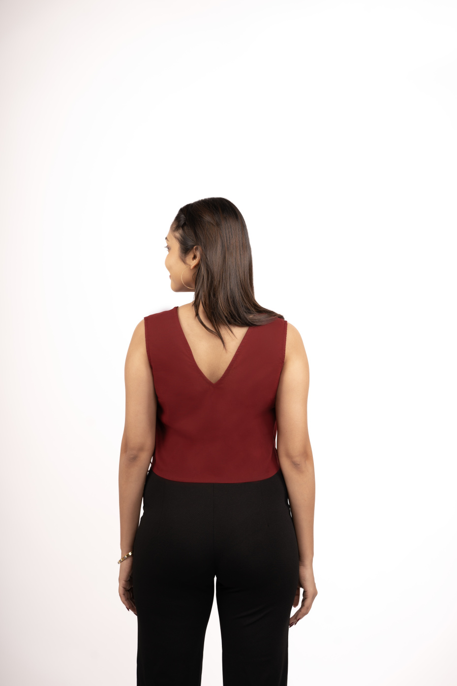 Step into a world of elegance and grace with this maroon V-neck crop top. It features a solid pattern, tassel detailing on one-side, v-neckline, and a sleeveless style in a cropped fit. Crafted with cotton fabric, it ensures softness and long-lasting comfort. Pair it with a traditional skirt, heels, and gold jewelry for an elevated ethnic look.
