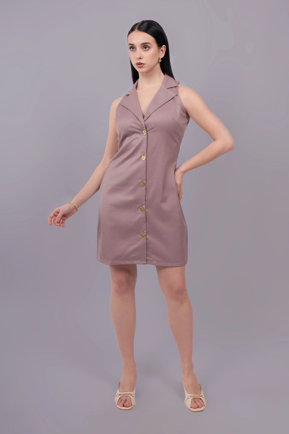 This mauve formal shirt dress is a professional and feminine choice for office or business casual settings. Its soft hue and tailored design make it a wardrobe essential.