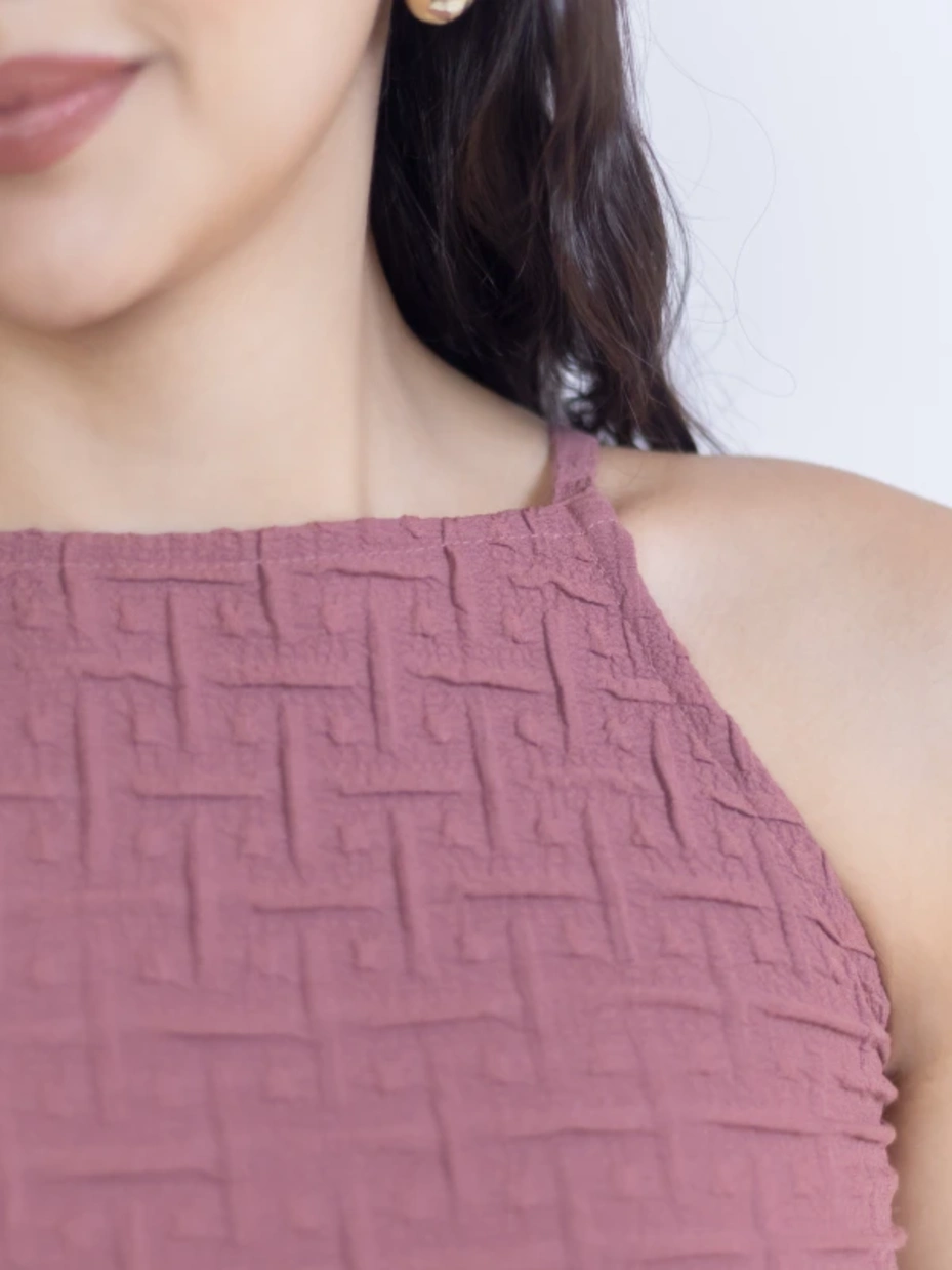 Uplevel your look with this mauve ruched bodycon dress, which is both stylish and comfy. The dress features an all-over waffle texture, a round apron neck, a sleeveless cut, a body-skimming fit, and side-string adjustment. Get this ruched bodycon dress made from a poly-elastane blend that offers wrinkle resistance and all-day comfort.