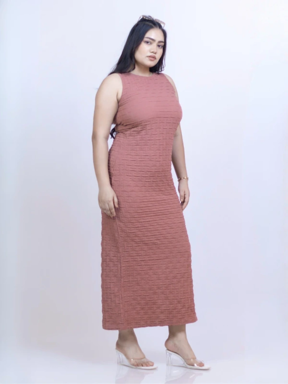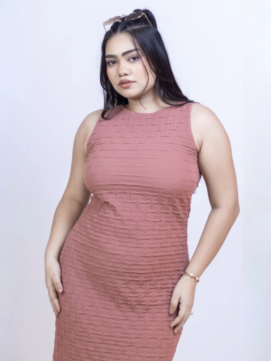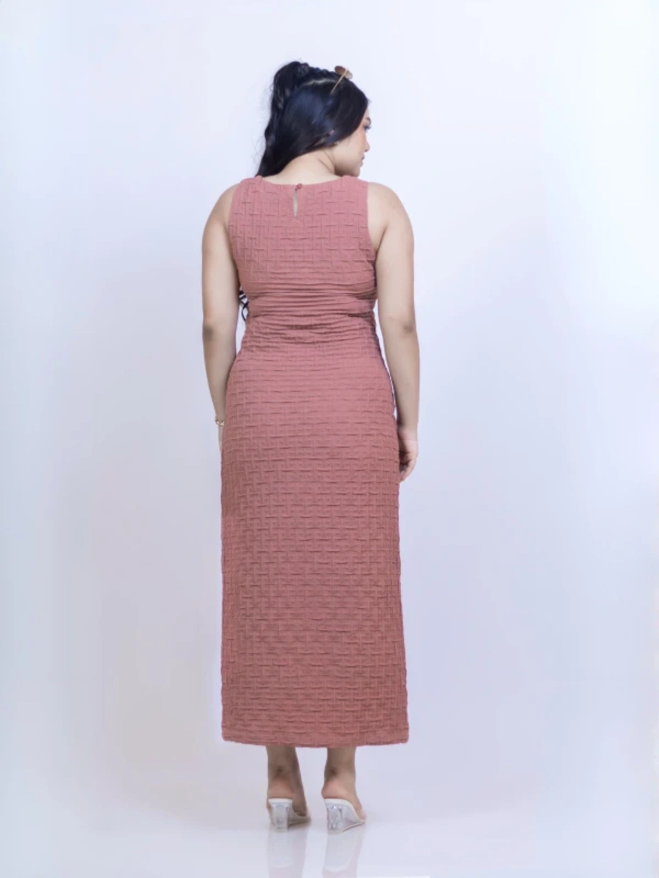 Turn heads with this flattering mauve bodycon slit dress for a daytime event or evening day out. It features a waffle texture, a round neck, a sleeveless cut, and a side slit. Get this mauve bodycon dress with a slit made from a poly-elastane blend that offers wrinkle resistance and all-day comfort.