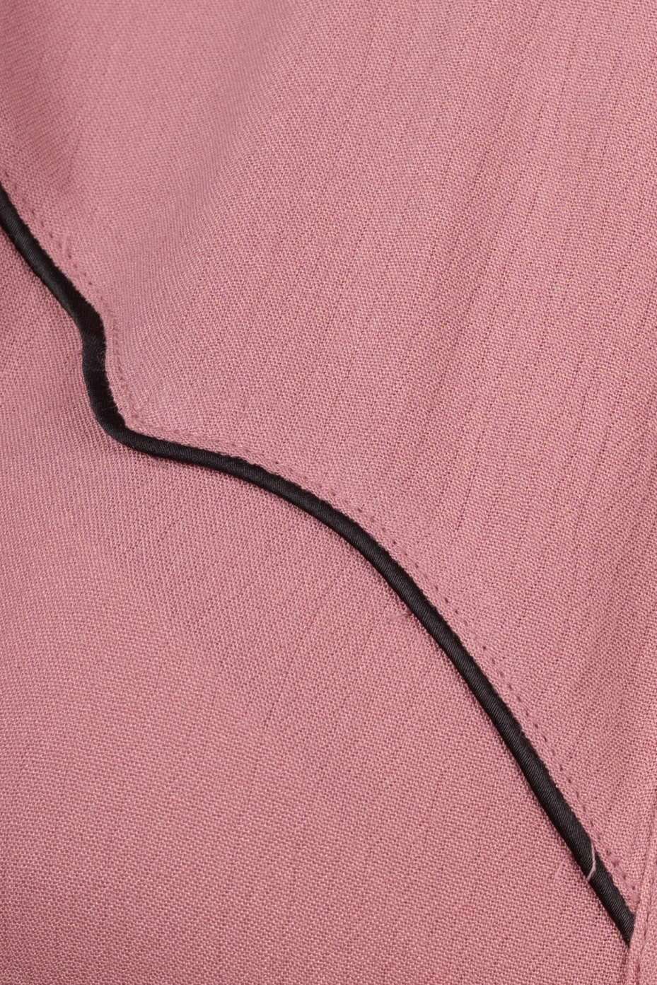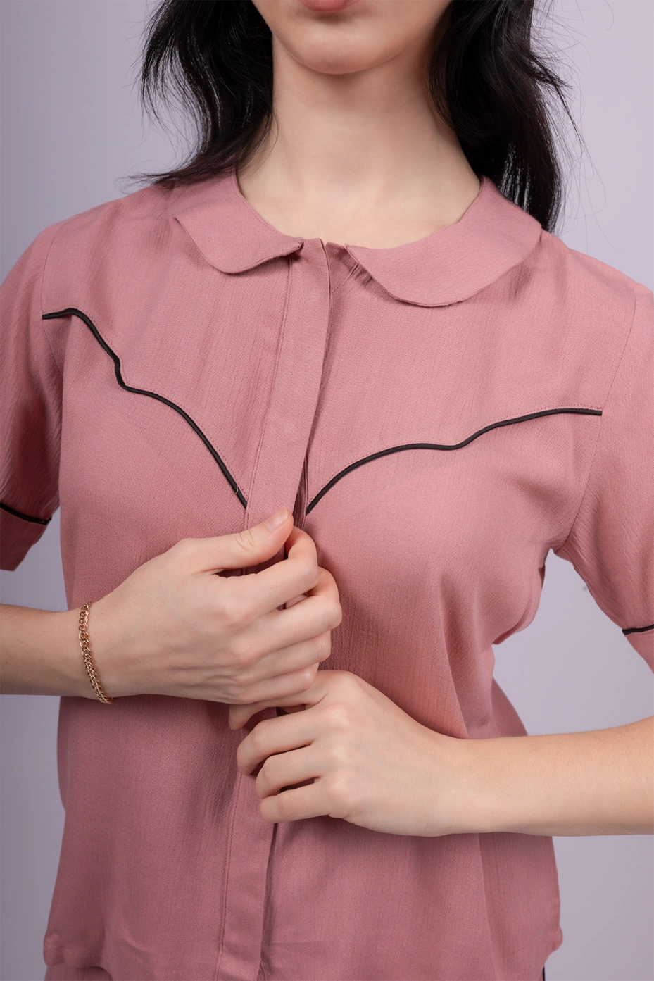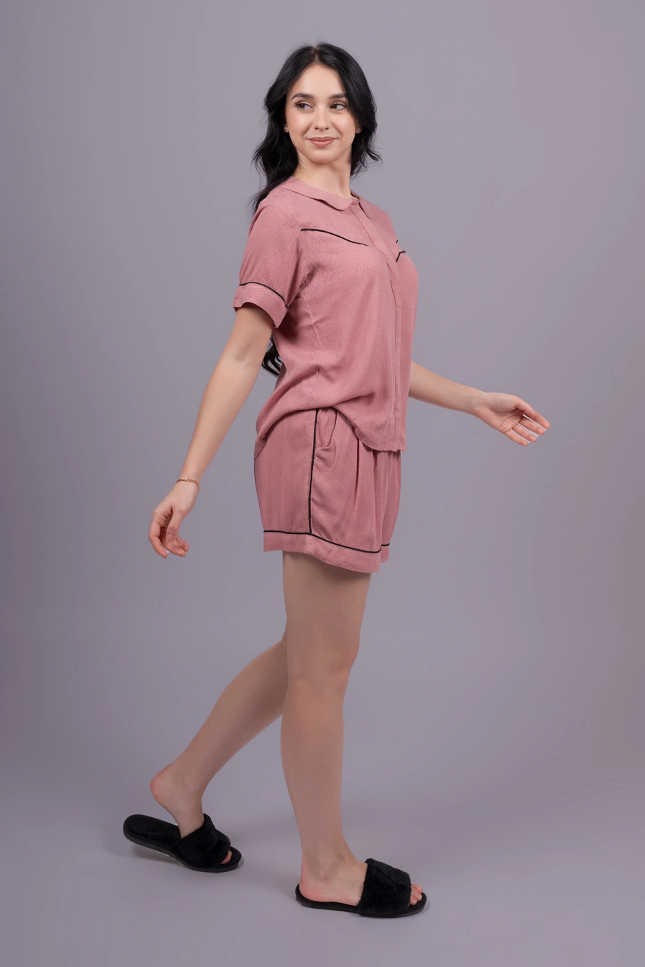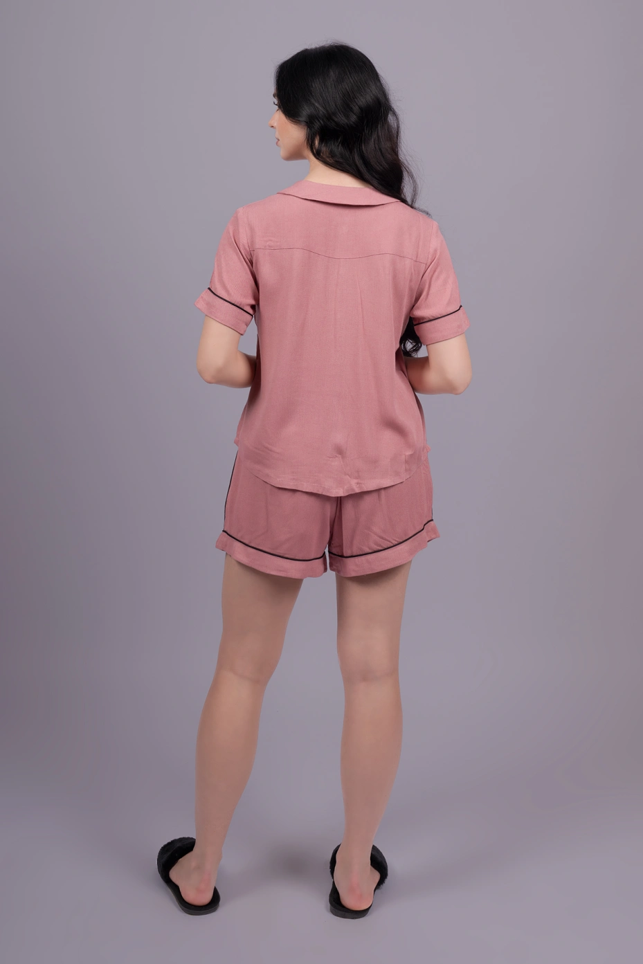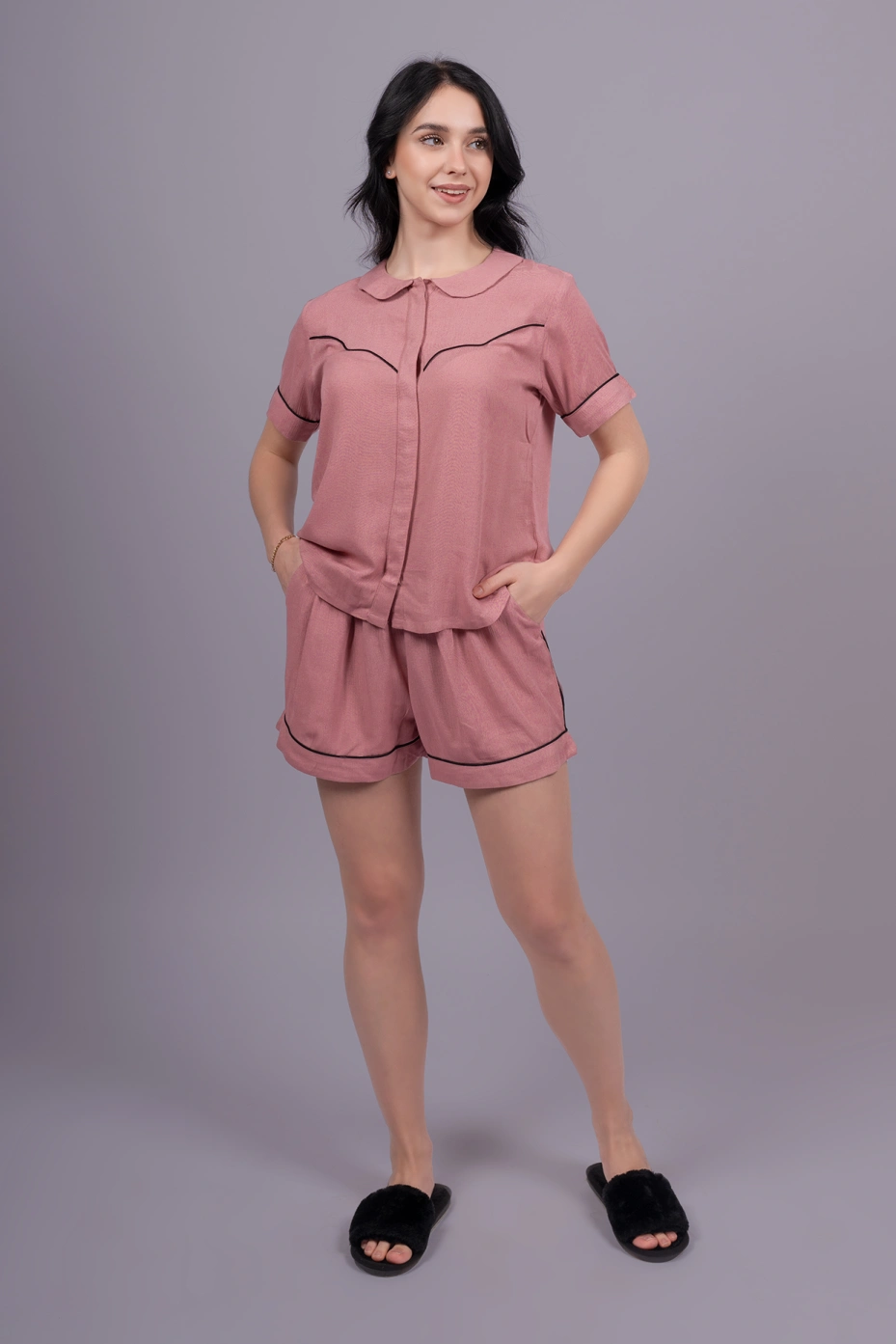Enjoy a good night's sleep in this solid mauve sleepwear set. The shirt features a Peter Pan collar, half sleeves, and black piping on the sleeves and bust. The shorts feature a stylish straight cut with piping on the hemline and twin side pockets. Indulge in this matching sleepwear made from a soft viscose fabric perfect for relaxing at home or running errands outside.