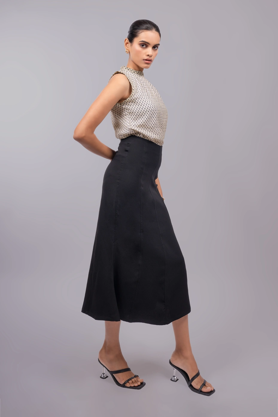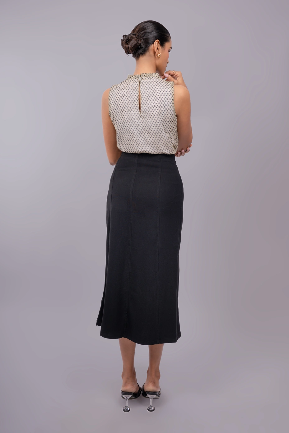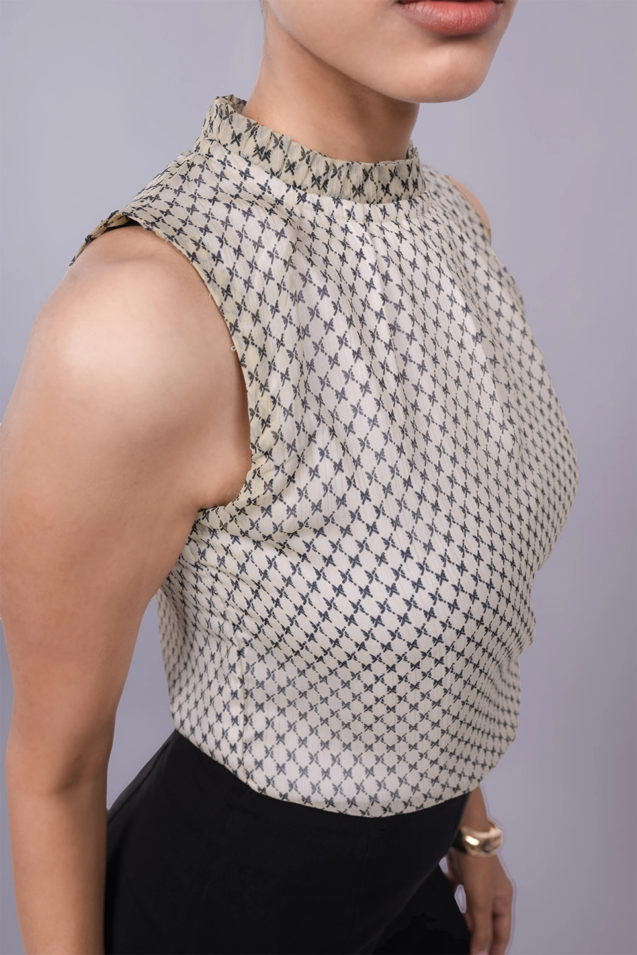 Kick the Monday blues in this Off-white. high-neck top. Featuring a sophisticated high neckline, sleeveless cut, this versatile top brings chic minimalism to your office look. Crafted from premium georgette fabric, it offers all-day comfort with a polished finish — ideal for pairing with tailored trousers, pencil skirts, or even layered under blazers for a sharp, professional vibe.