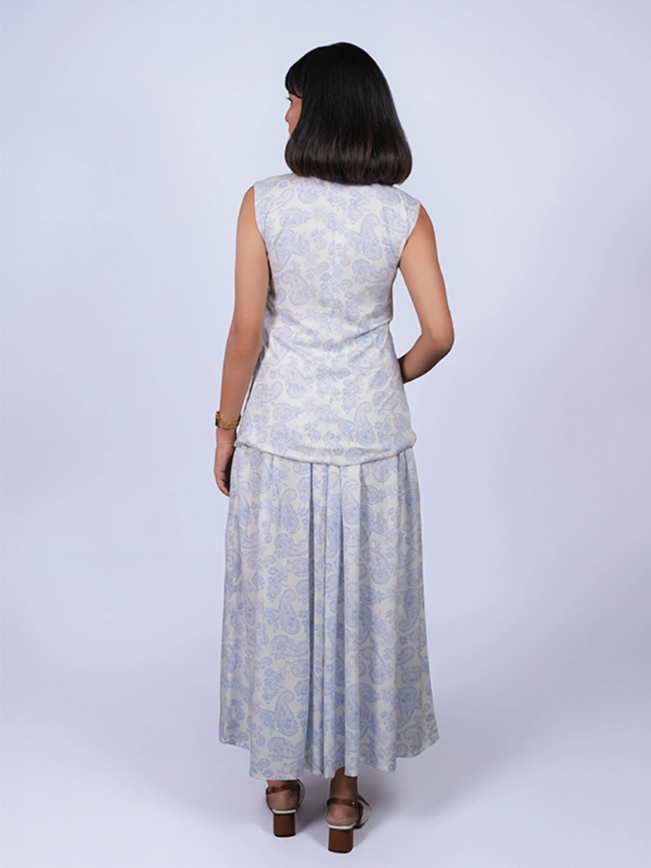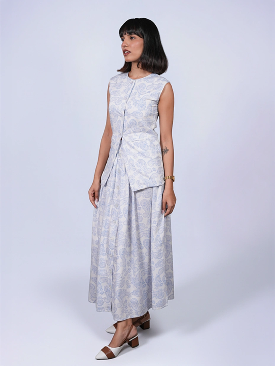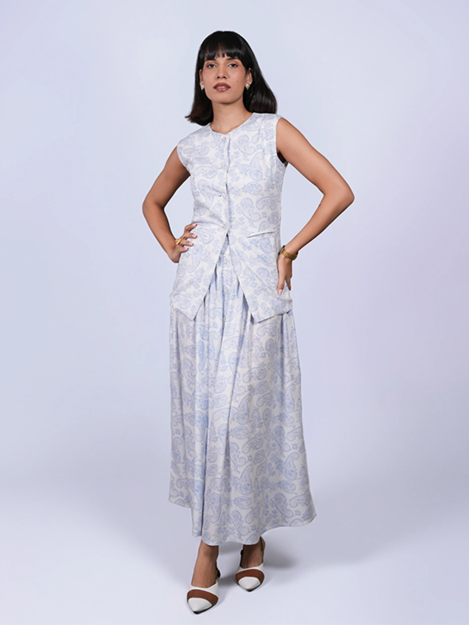 The off-white formal co-ord set offers comfort, style, and versatility to your wardrobe. The top features a paisley print, a round neck, a sleeveless cut, and two-sided pockets. The skirt features a comfortable elasticated waistband with slip-on closure, button details, and a flared hem. Crafted from a Rayon fabric with lining to ease breathability and to offer comfort.