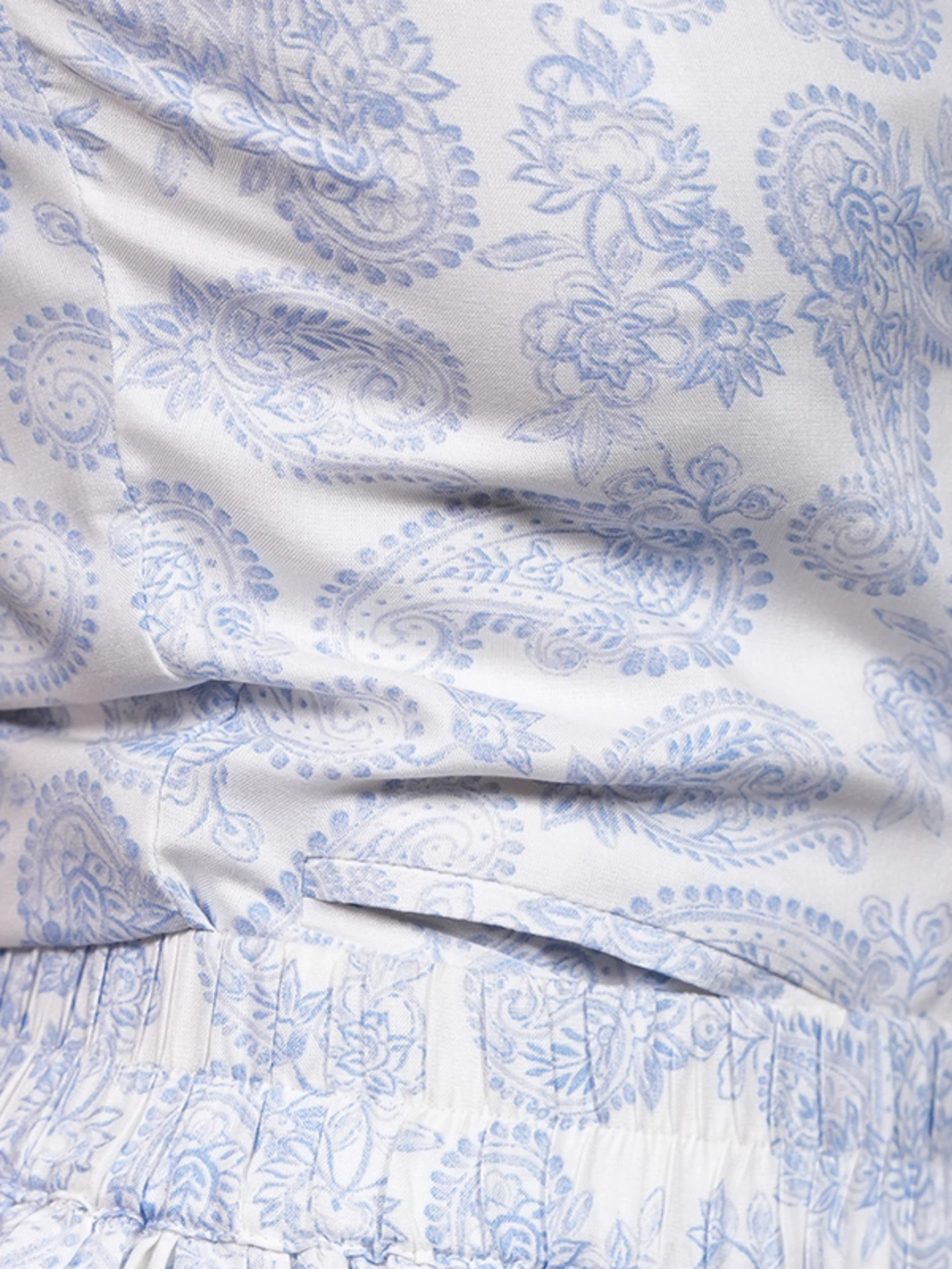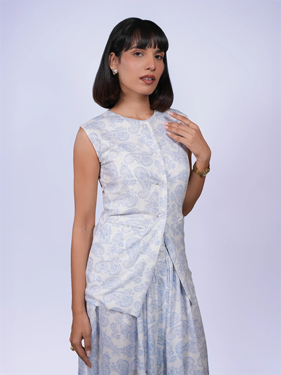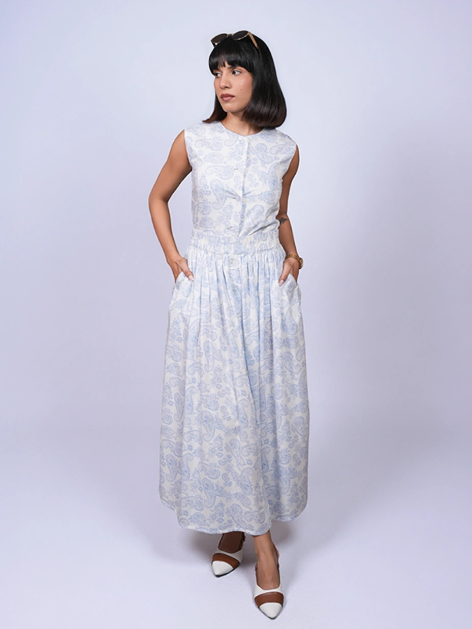 The off-white formal co-ord set offers comfort, style, and versatility to your wardrobe. The top features a paisley print, a round neck, a sleeveless cut, and two-sided pockets. The skirt features a comfortable elasticated waistband with slip-on closure, button details, and a flared hem. Crafted from a Rayon fabric with lining to ease breathability and to offer comfort.
