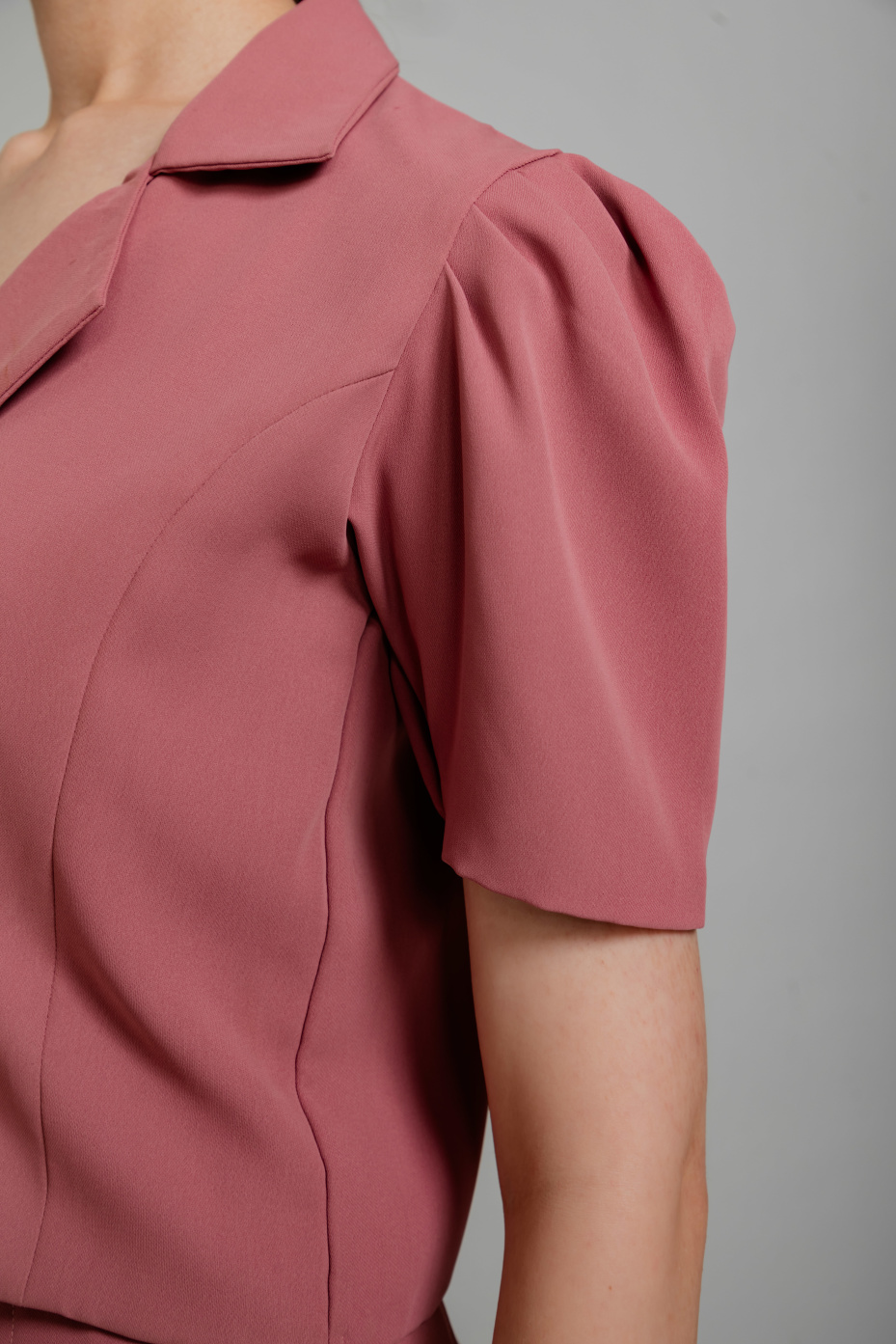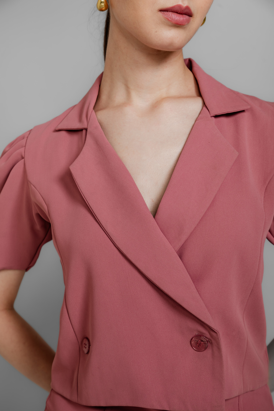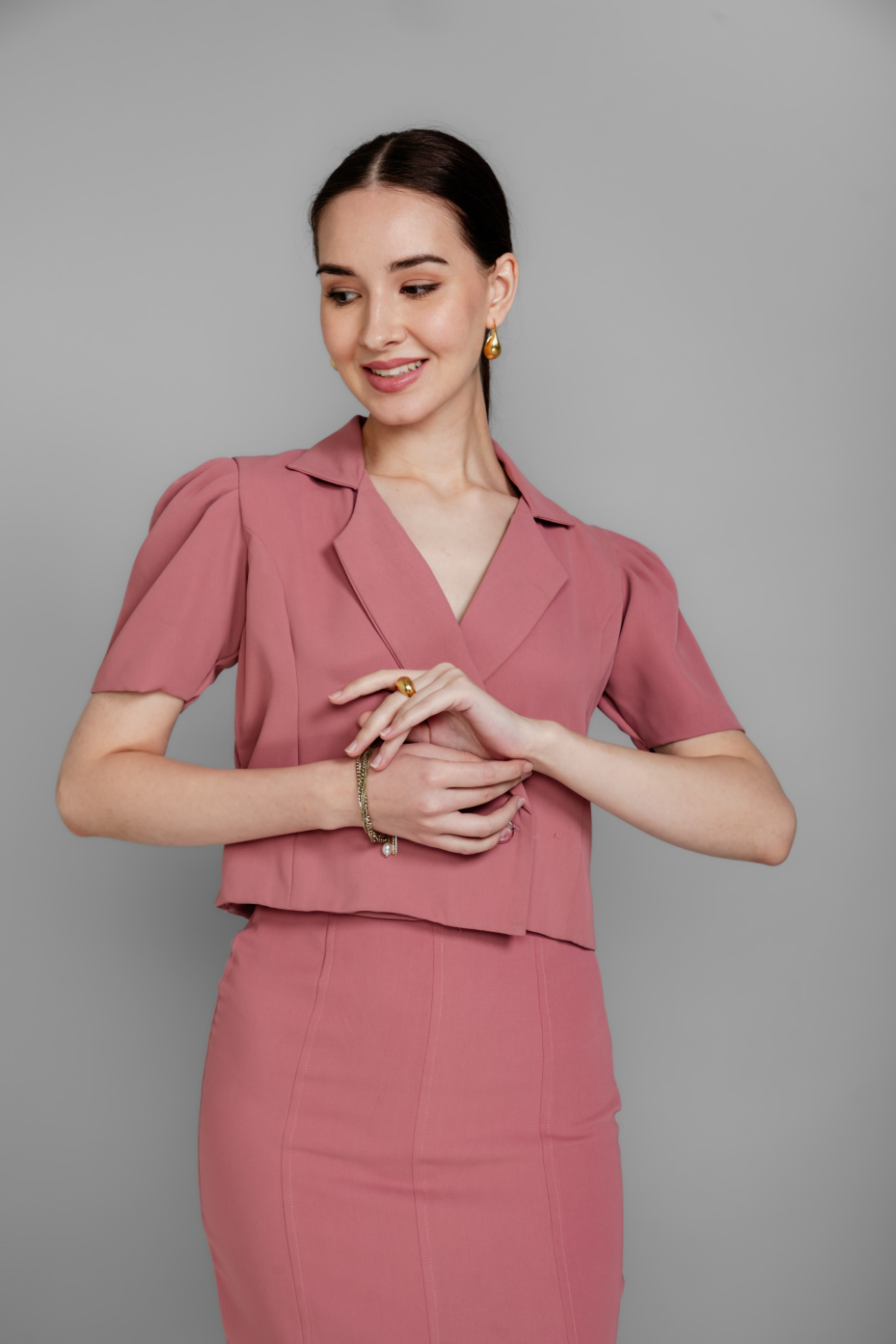 Redefine confidence in this peach cropped blazer for a work meeting. It features a cropped fit, a notch lapel collar, puff half sleeves, and an overlap style. Discover the perfect blend of comfort and style in the high-quality polyester fabric.