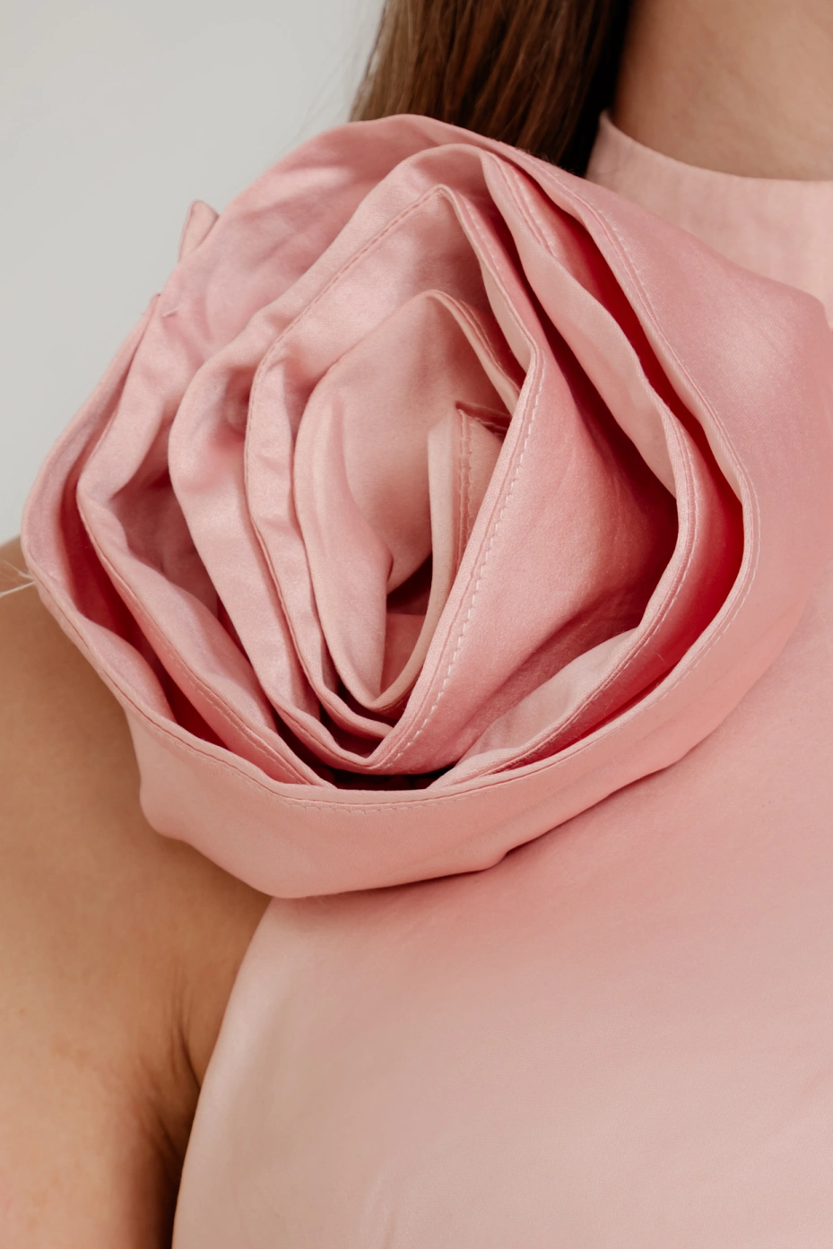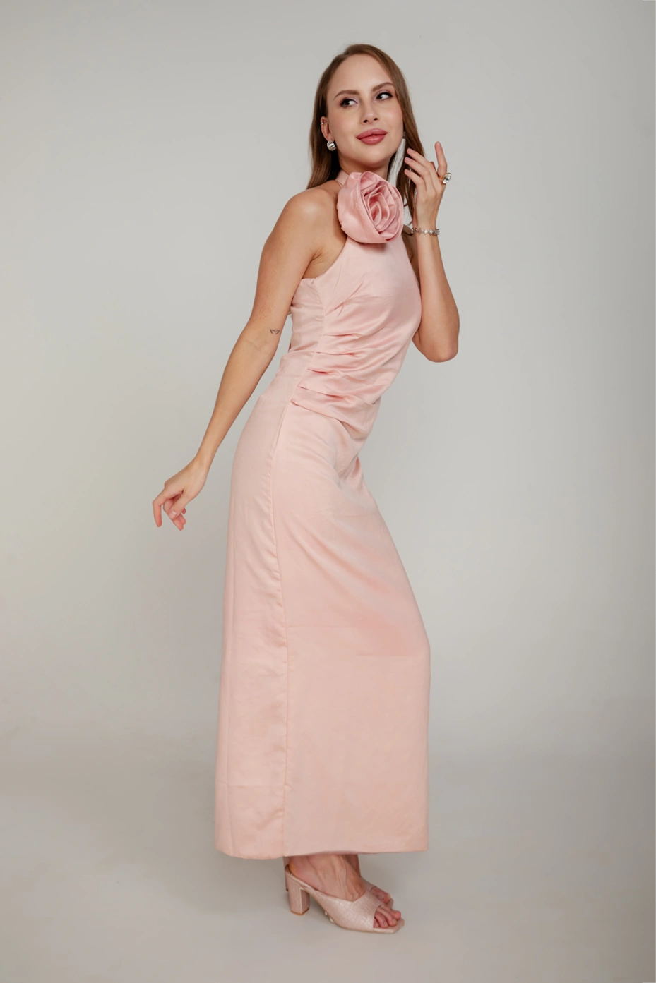 Turn heads and steal the spotlight in this Peach Halter-Neck Dress, the perfect choice for your next cocktail party or date night. Inspired by the mesmerizing beauty of the northern lights, Aurora, it features a chic halter neck with an exquisite corsage detail, a sleeveless design, and a flowing maxi length that exudes elegance and sophistication. Crafted from luxurious satin with Santoon lining, this dress effortlessly balances glam and gloss, ensuring you shine with every step.