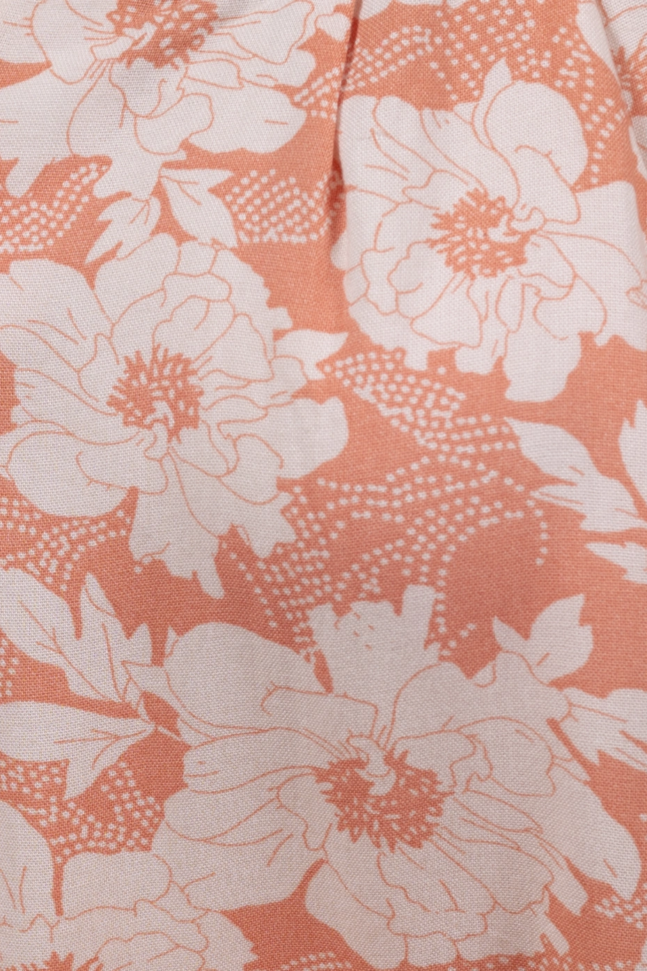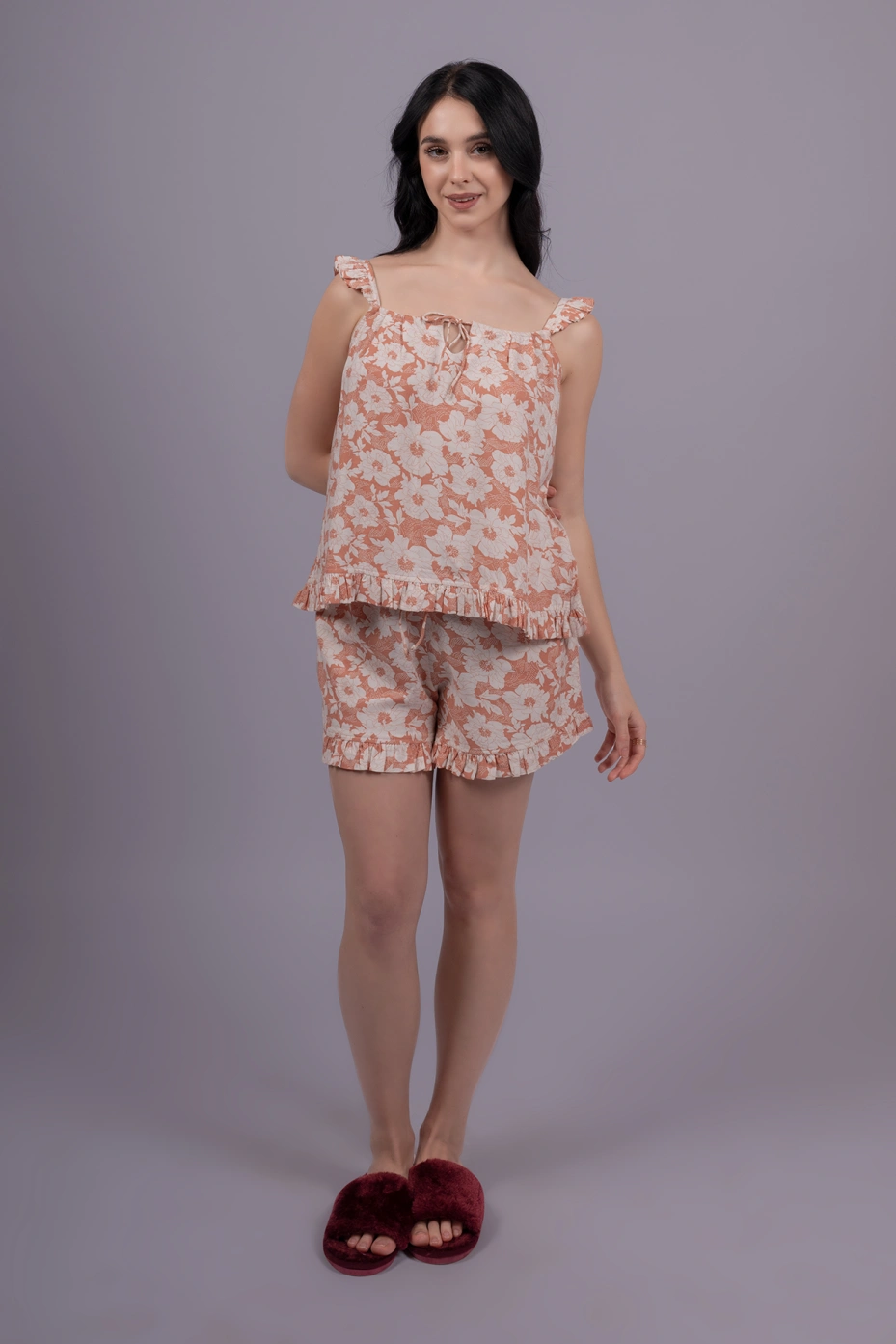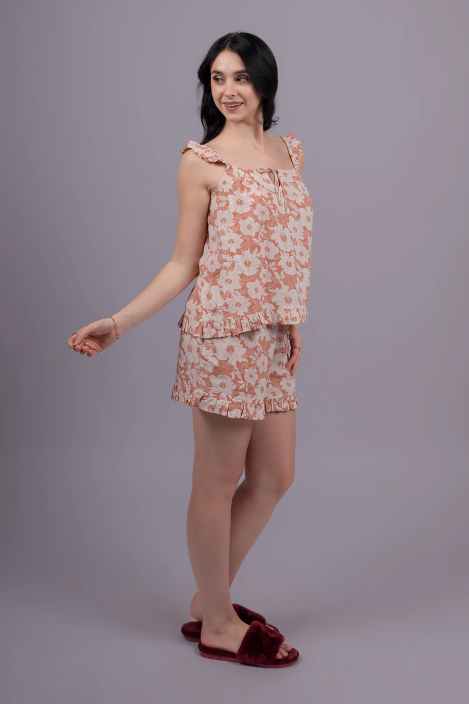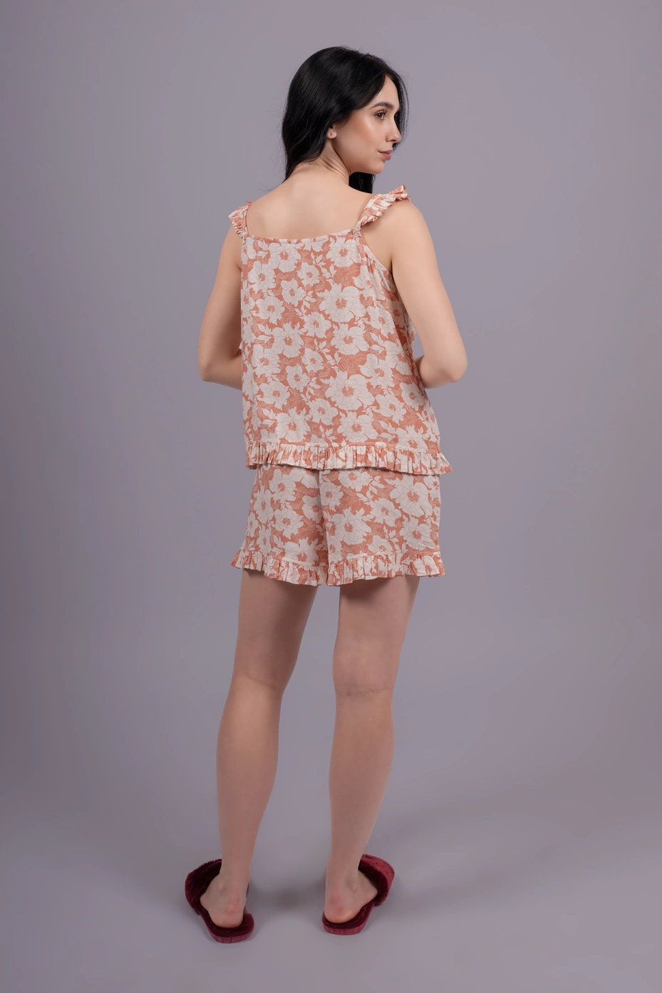 This all-over floral-printed frill detailed summer loungewear in a peach hue is all you need to throw an aesthetic slumber party. The camisole top features a square neck and frilled straps. The shorts feature a relaxed fit, two-sided pockets, drawstring at the waist, and frill details at the hemline. This oh-so-stylish matching set made from viscose fabric is perfect for a night of fun, laughter, and blissful memories.