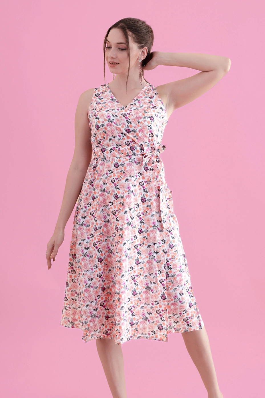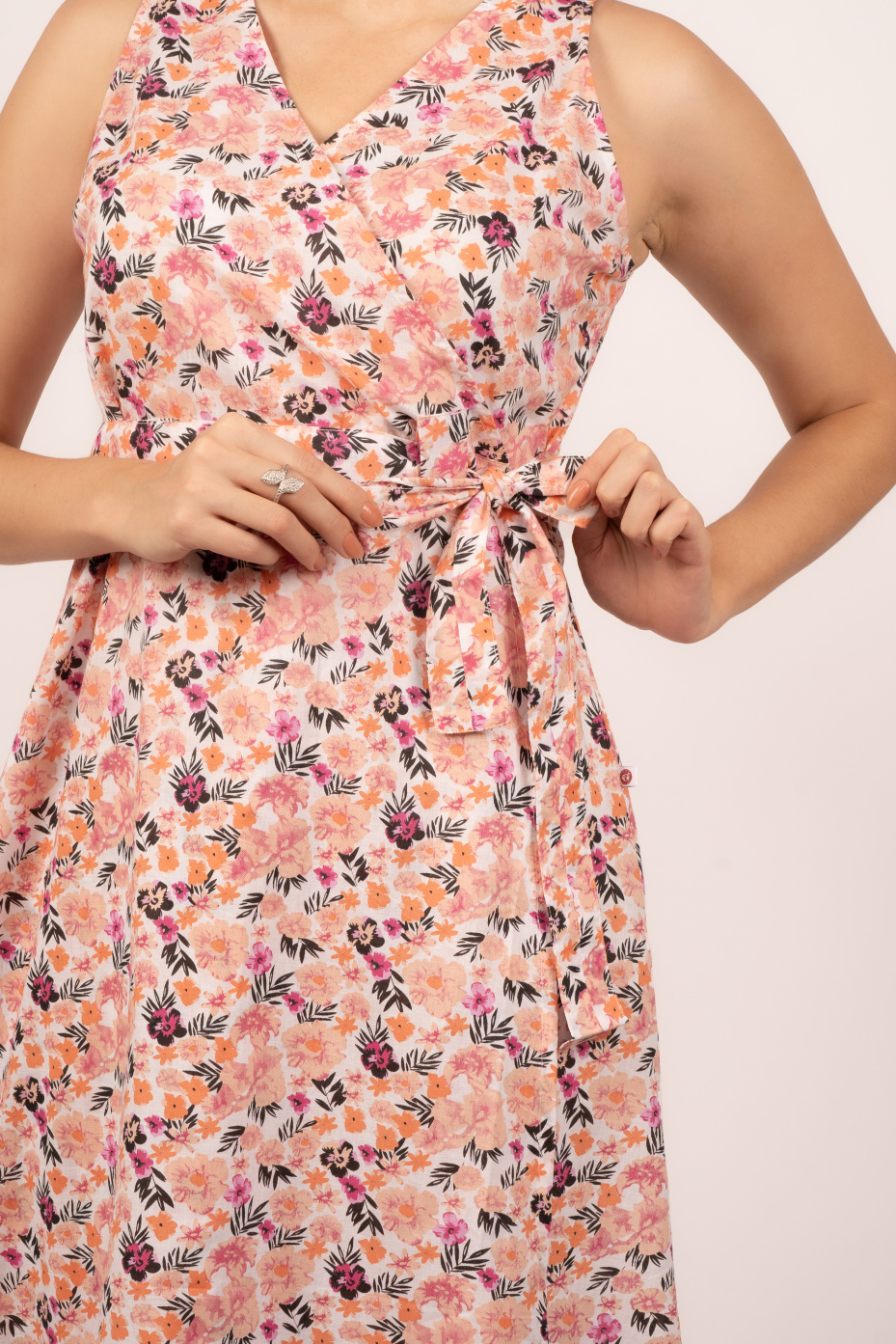 Radiate charm in this Phoebe peach wrap cotton dress. It features an all-over floral print, v-neckline, sleeveless, a tie at the waist, and knee-length. Crafted with cotton fabric, it ensures softness and long-lasting comfort. For a day out with friends, pair this dress with mules, a smartwatch, and a sling bag.