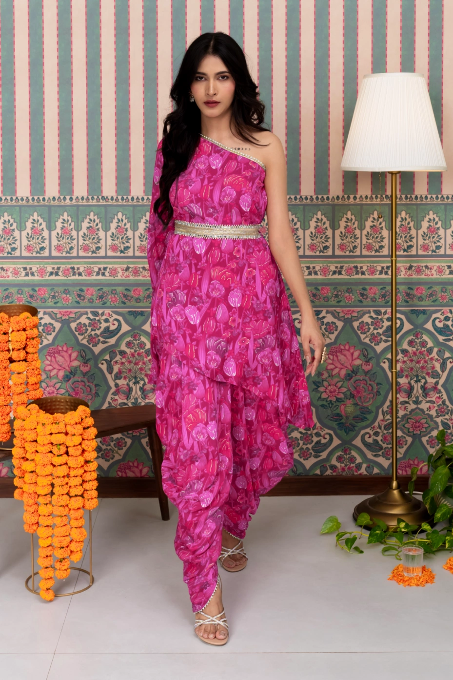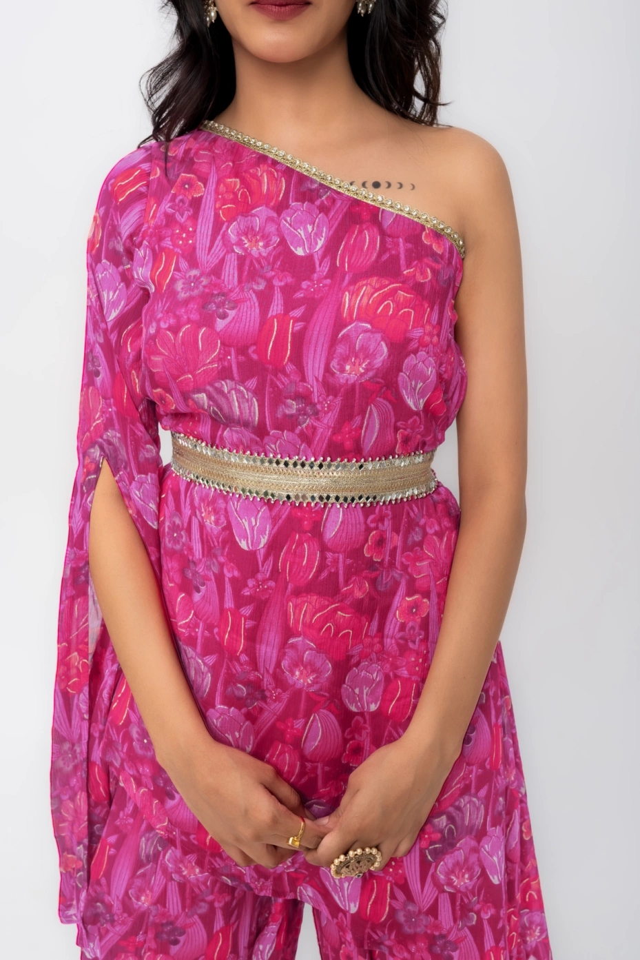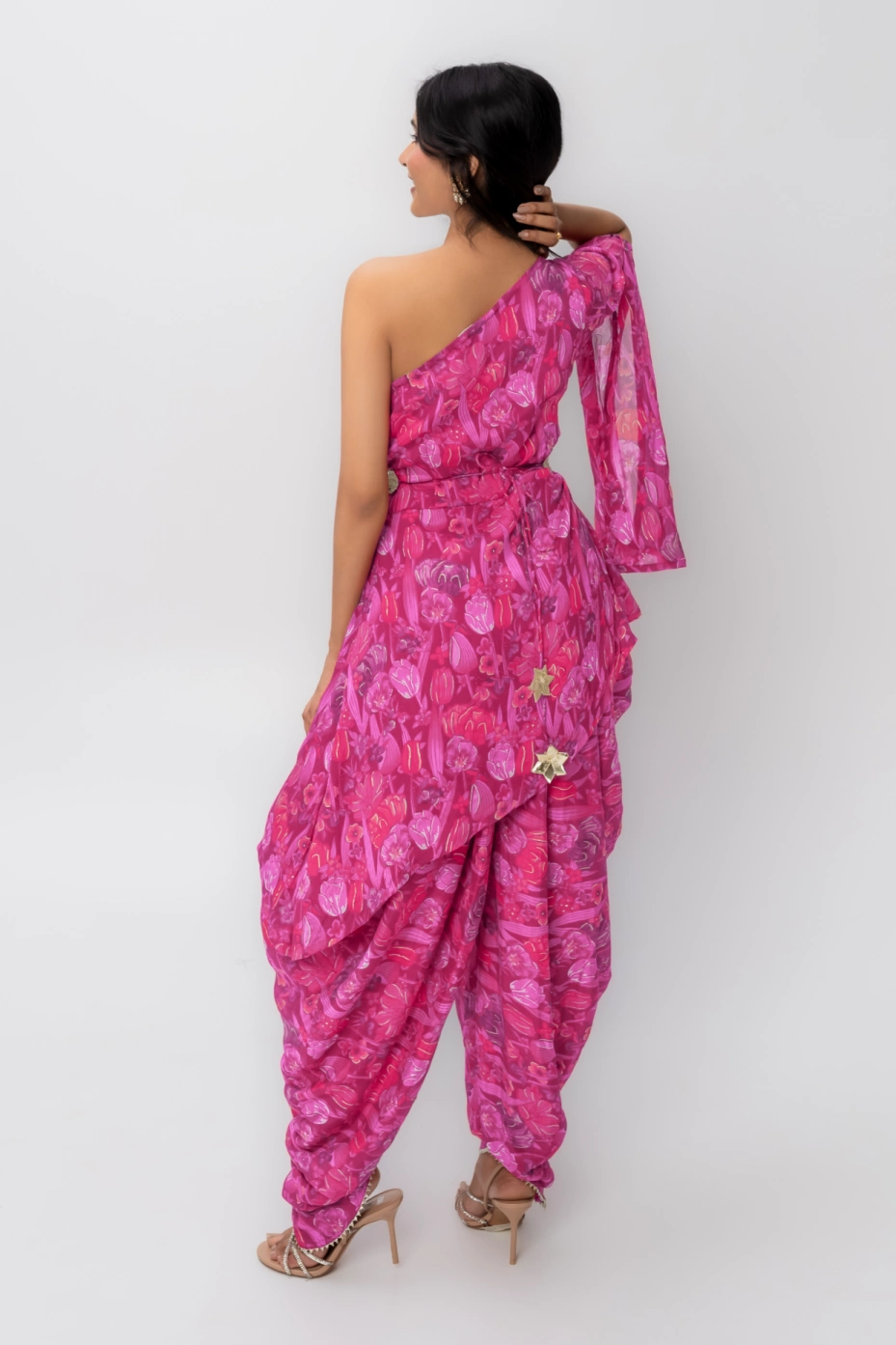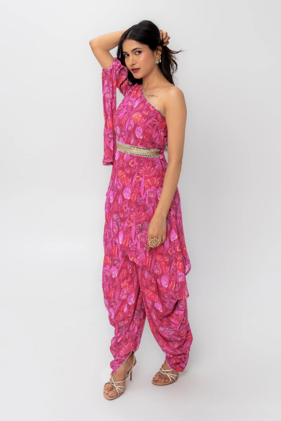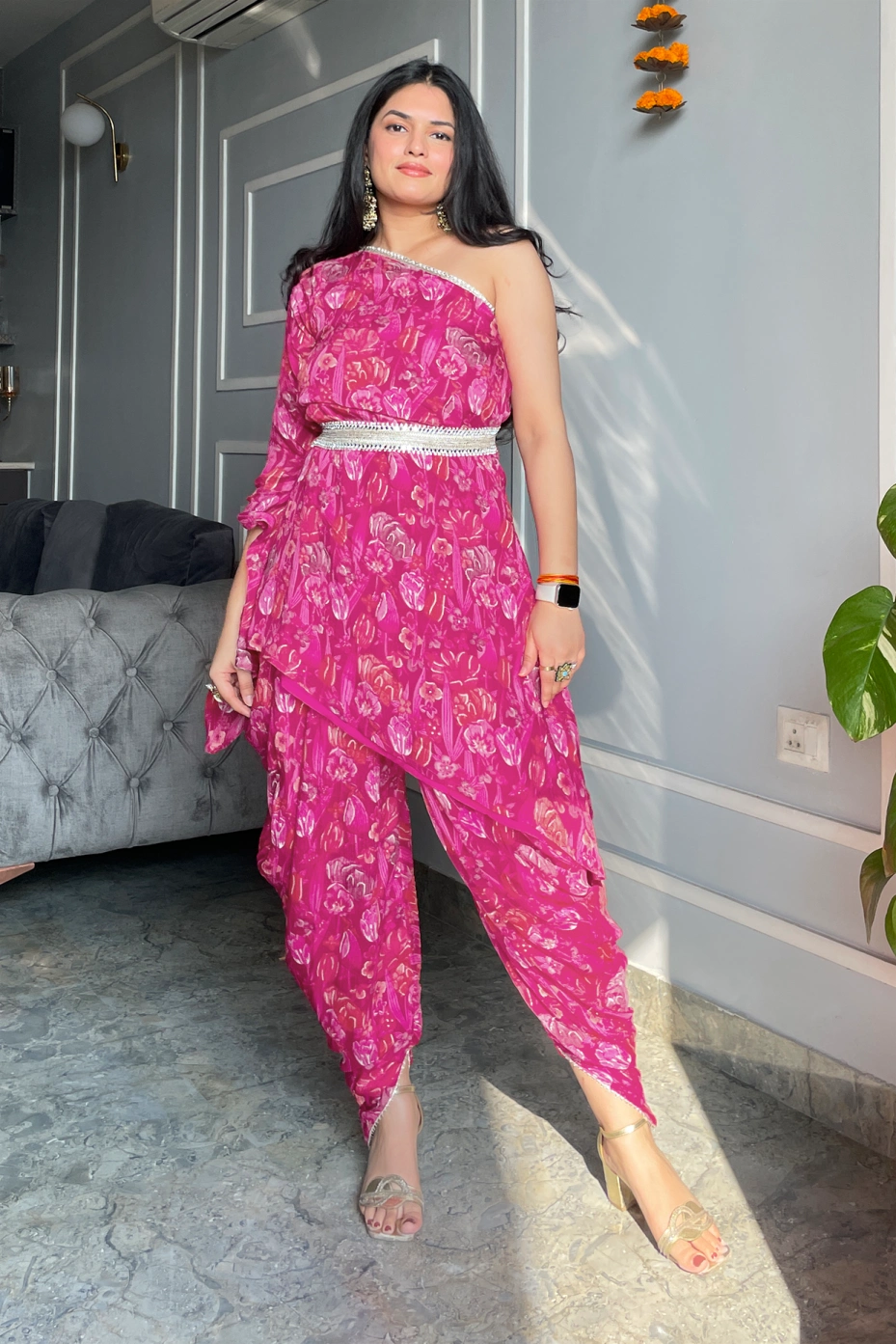 Feel confident, poised, and picture-perfect for weddings, sangeets, or receptions with this one-shoulder kurta with dhoti pants. The asymmetric kurta features a floral print, a detachable belt, and a one-side sleeve. It comes with complementary dhoti pants. Crafted with chinon chiffon fabric, it ensures lightweight softness and long-lasting comfort. Pair it with your statement earrings and heels for a show-stopping look.