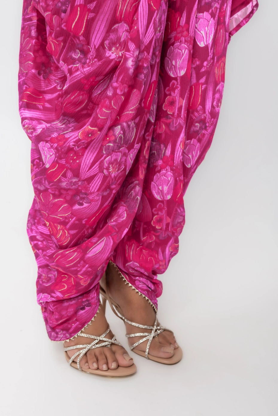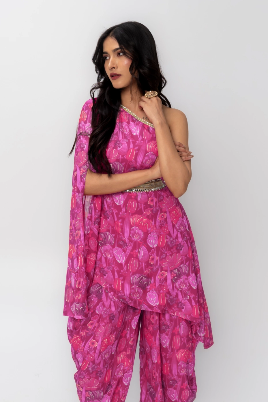 Contains | 1 x Pink Asymmetric Kurta; 1 x Dhoti Pants