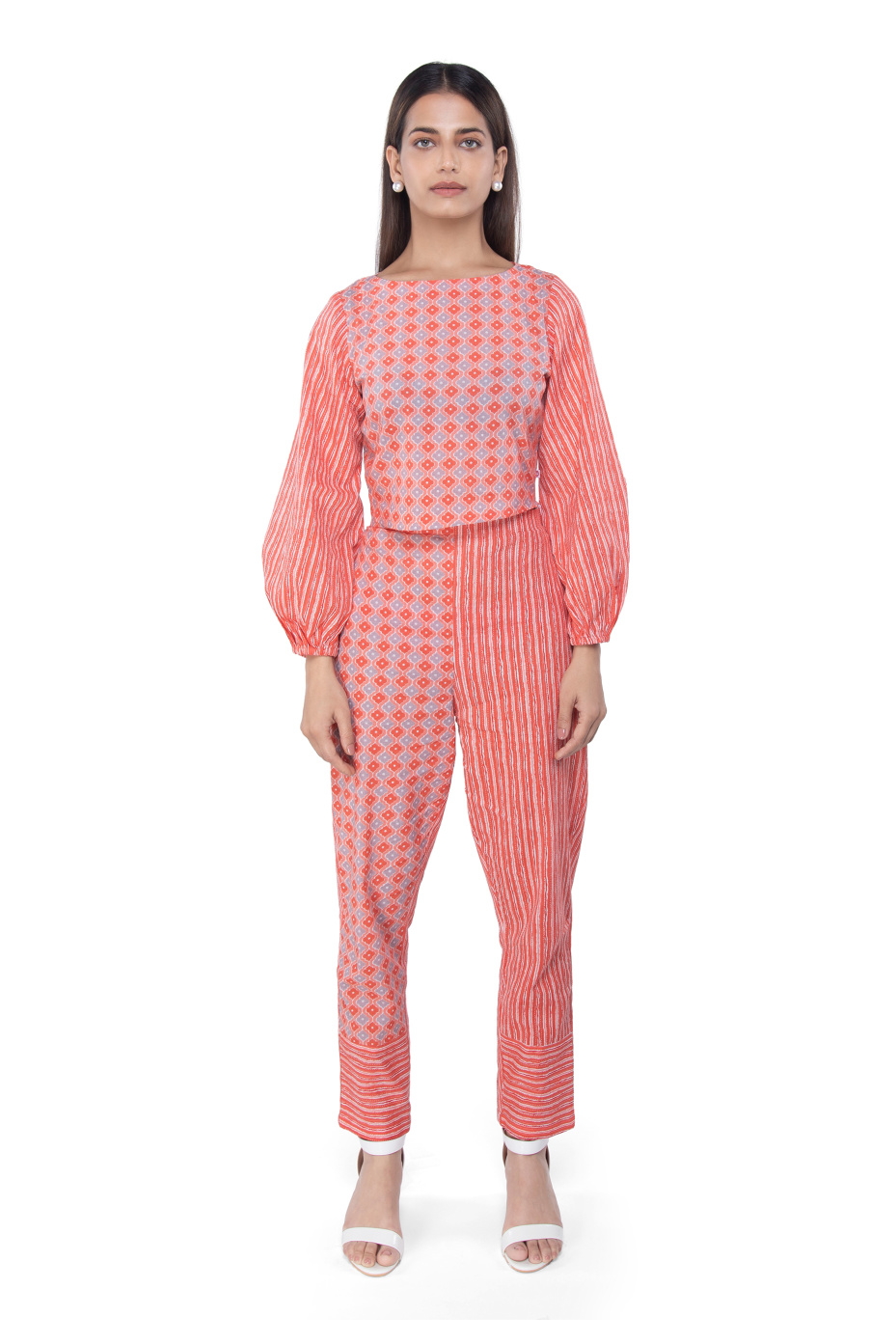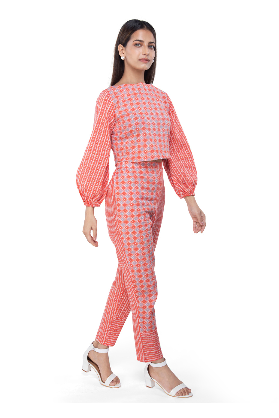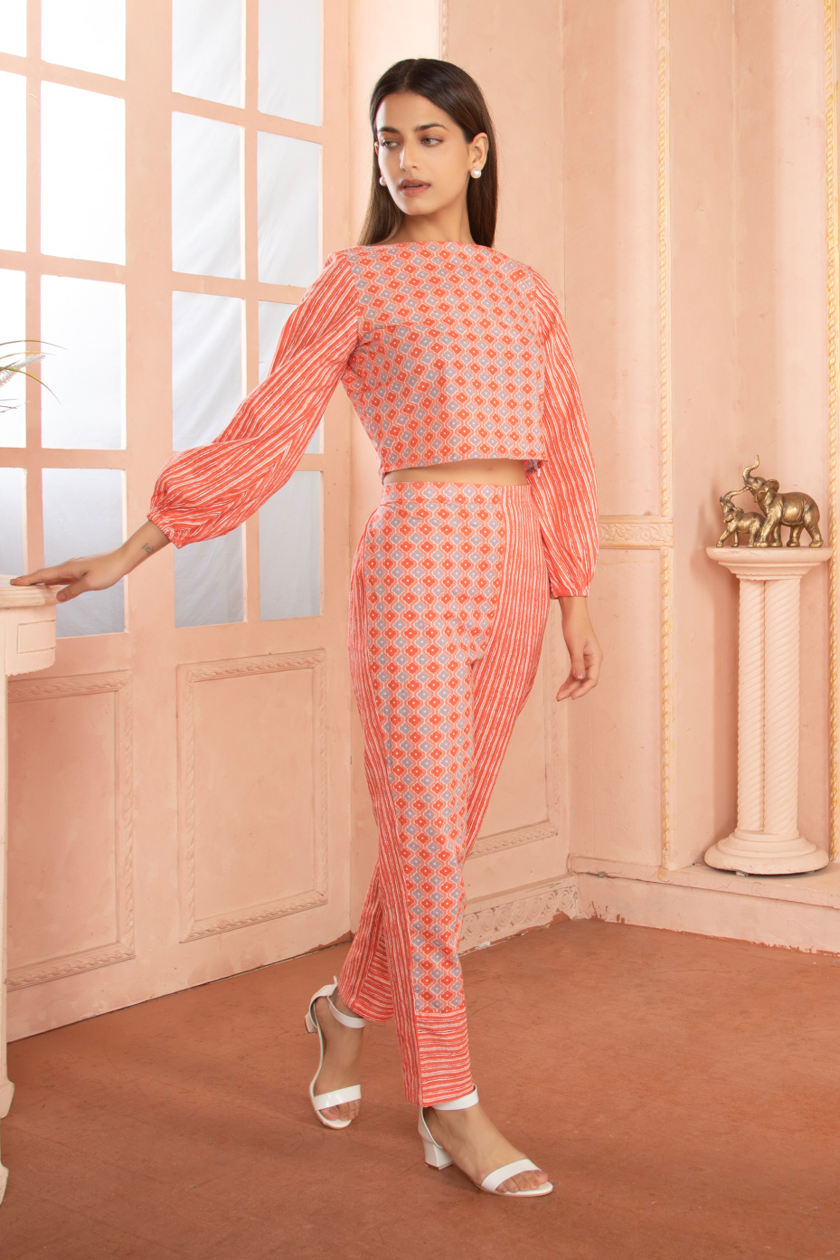 Make an effortless stylish look with our pink print block cotton co-ord set. The key highlights are a geometric print block, a bishop sleeve top, high-waist pants, and a crop top set. That can be worn with transparent block mules. Simple and minimal jewelry to create a sophisticated look.