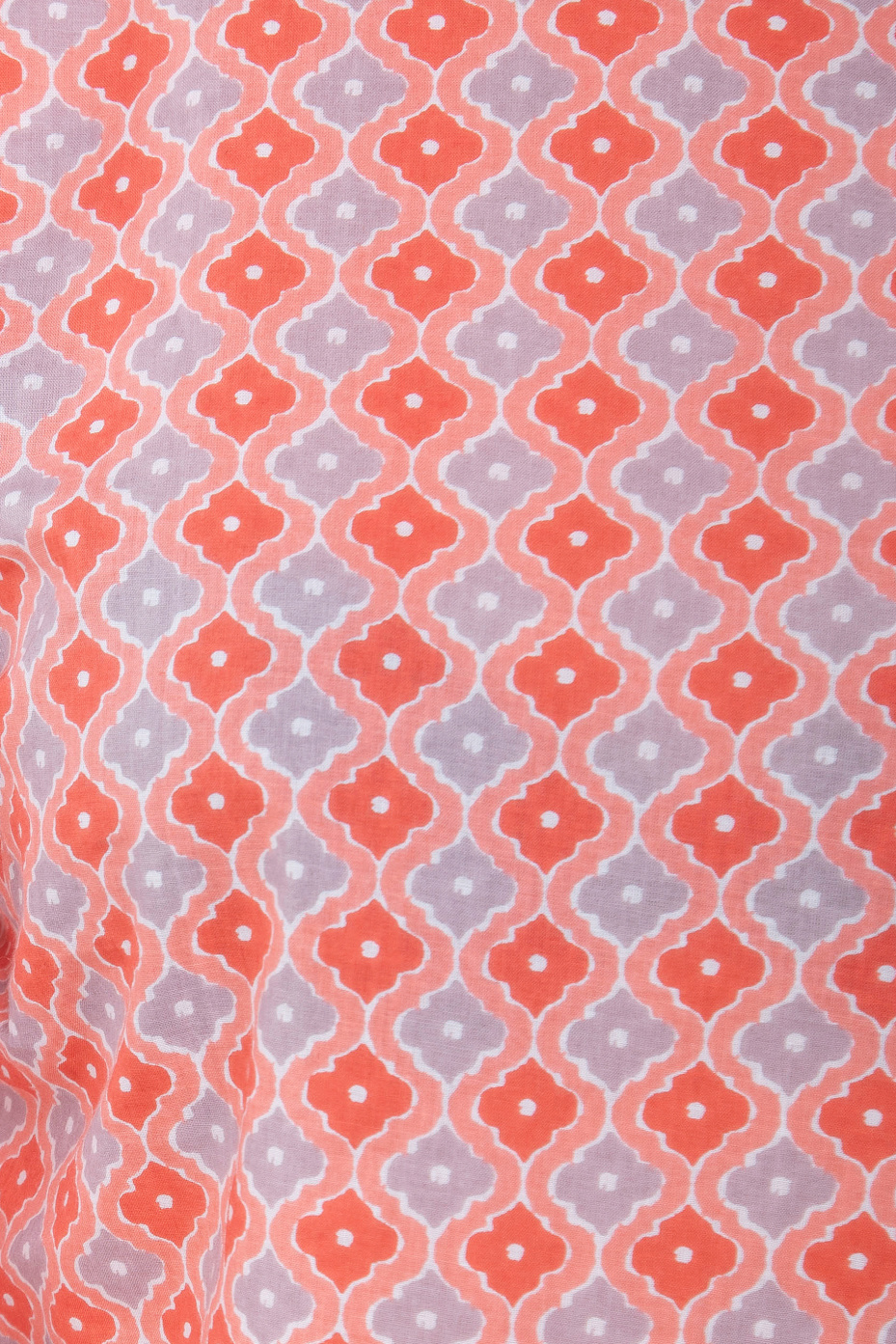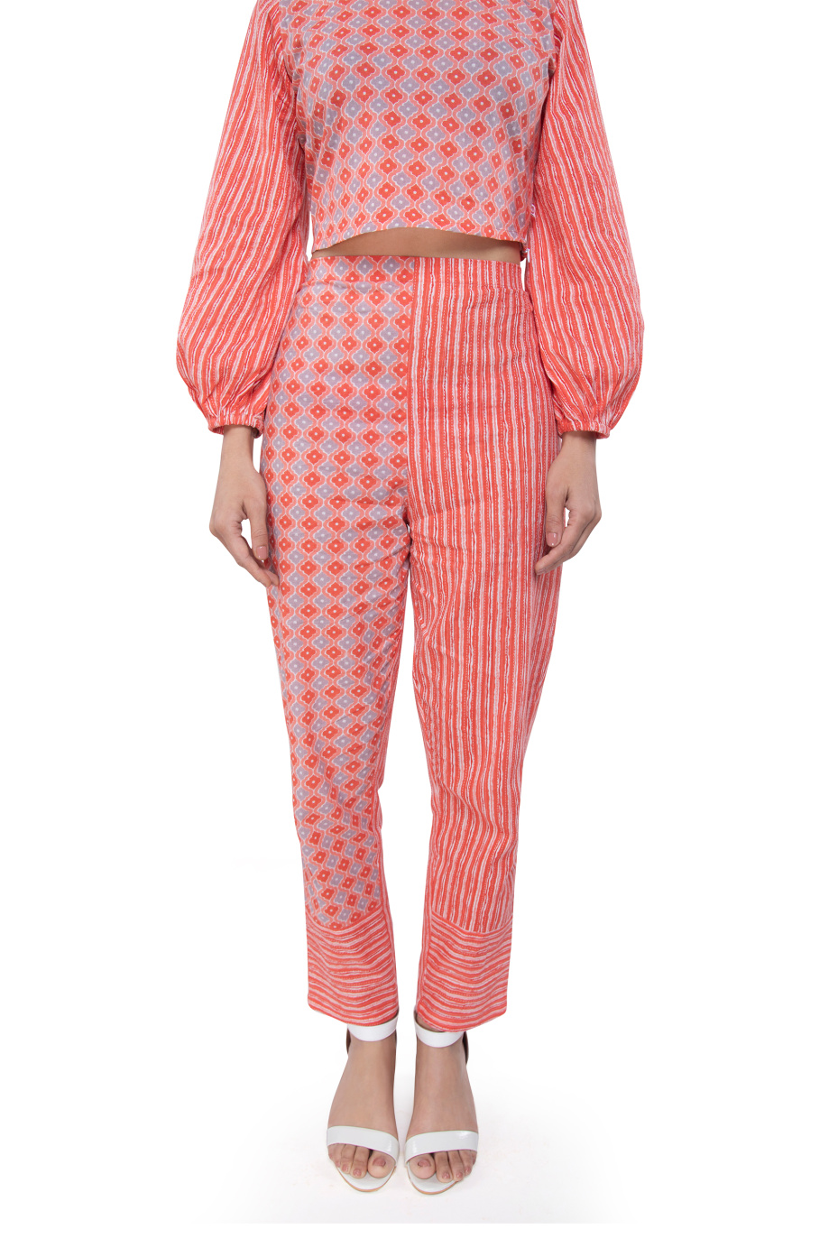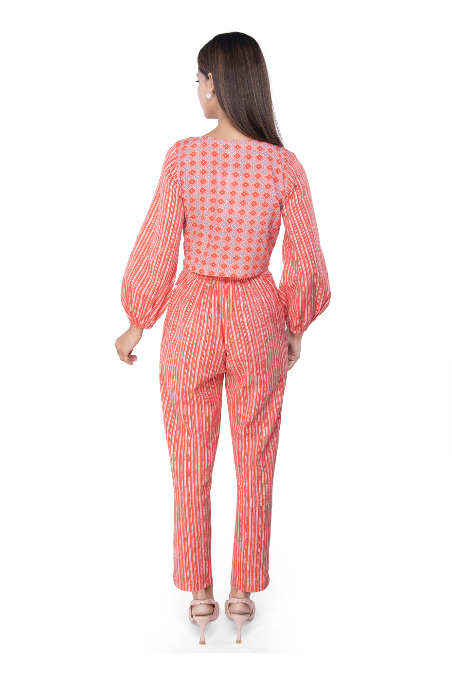 Make an effortless stylish look with our pink print block cotton co-ord set. The key highlights are a geometric print block, a bishop sleeve top, high-waist pants, and a crop top set. That can be worn with transparent block mules. Simple and minimal jewelry to create a sophisticated look.