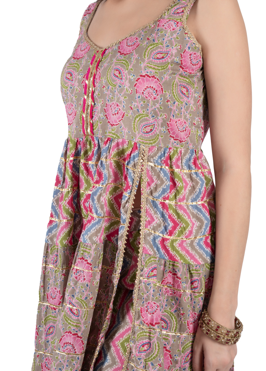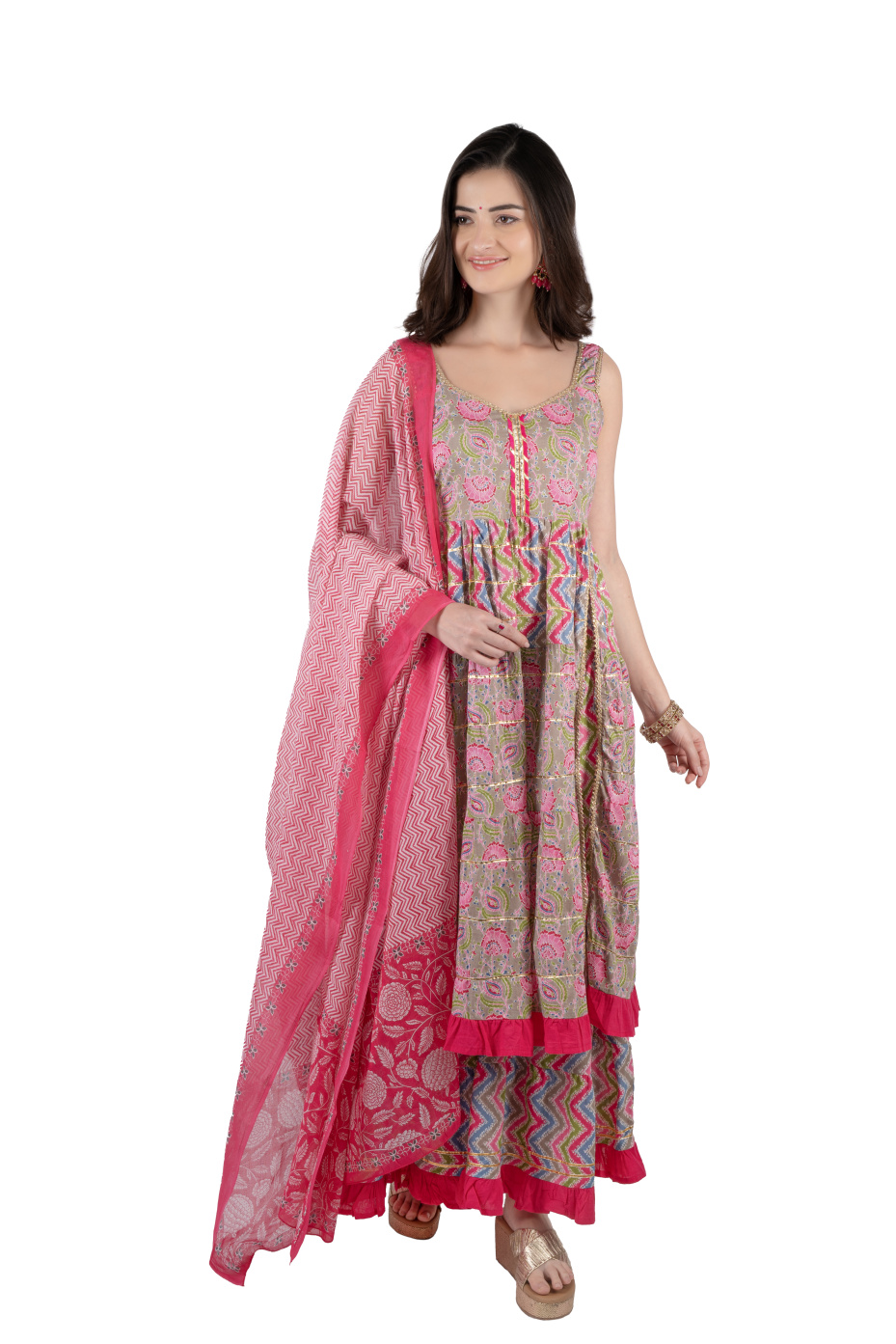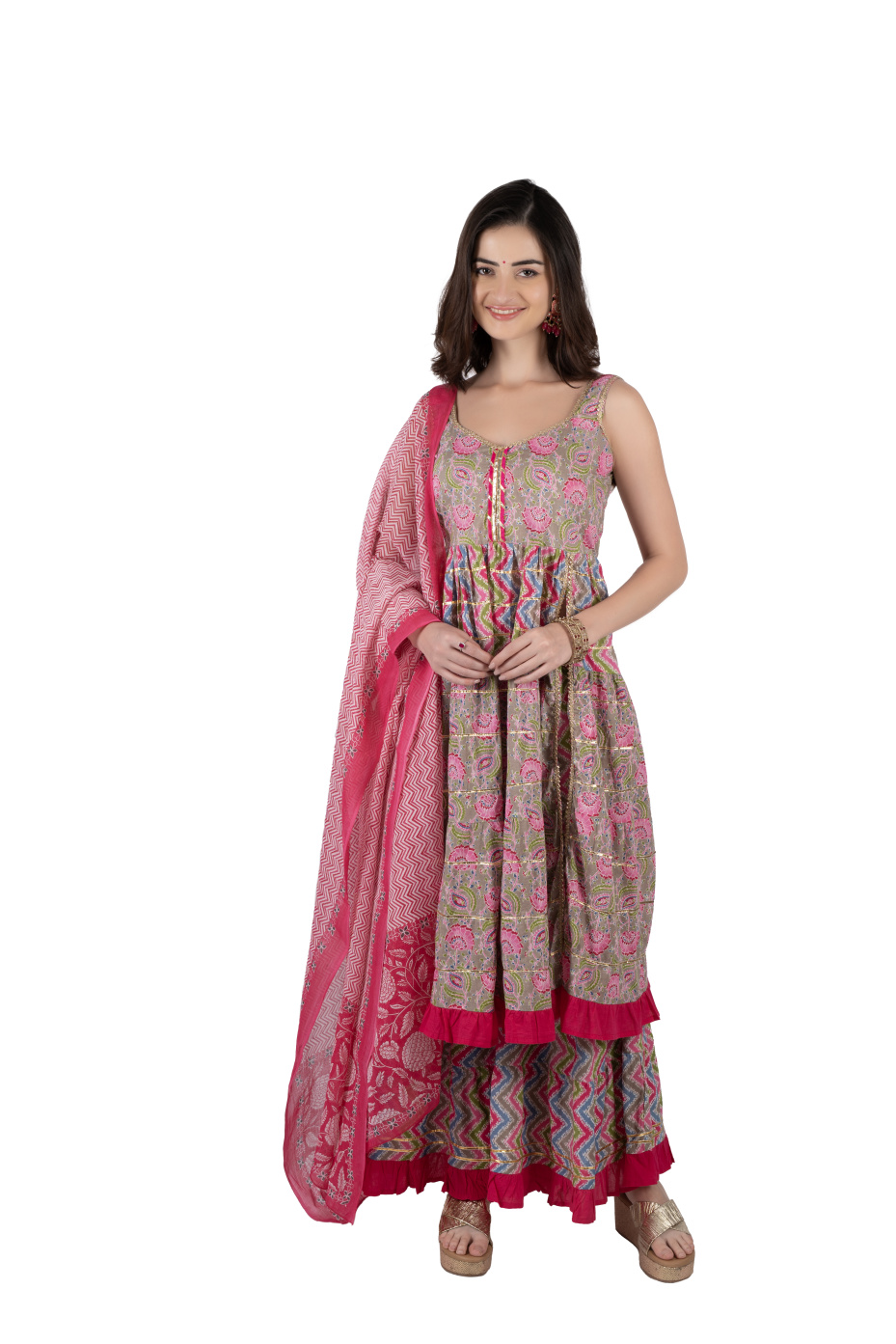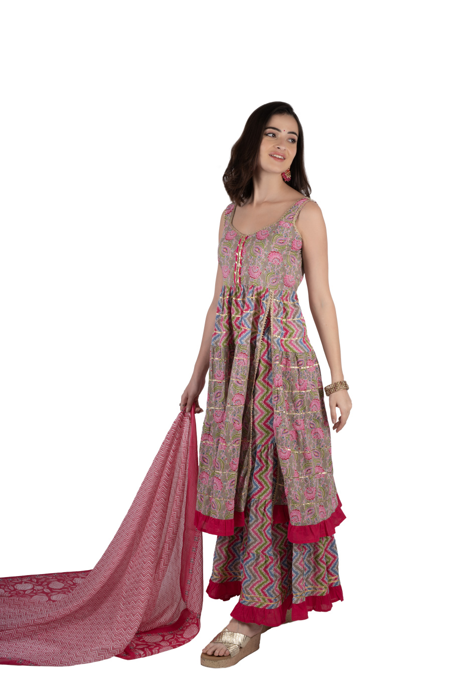 Seize family events with this eye-catching pink sharara suit set. The top features a stylish front slit, a V-neck with gota lace, and gota patti in tiers, and the sharara bottom features frills with gota patti detailing. This set comes with a printed dupatta. Made from 100% pure cotton fabric to ensure comfort and breathability. A pair of ethnic footwear, oxidized earrings, and bangles to catch people's gaze at family gatherings.