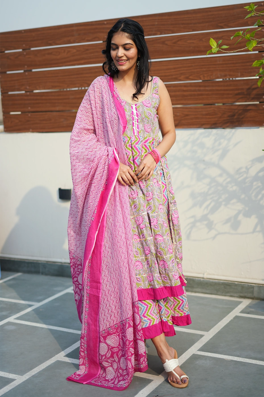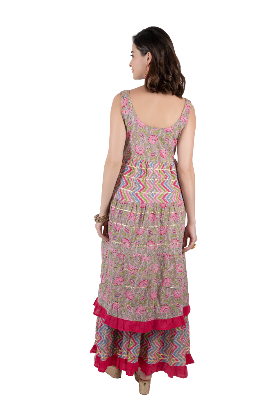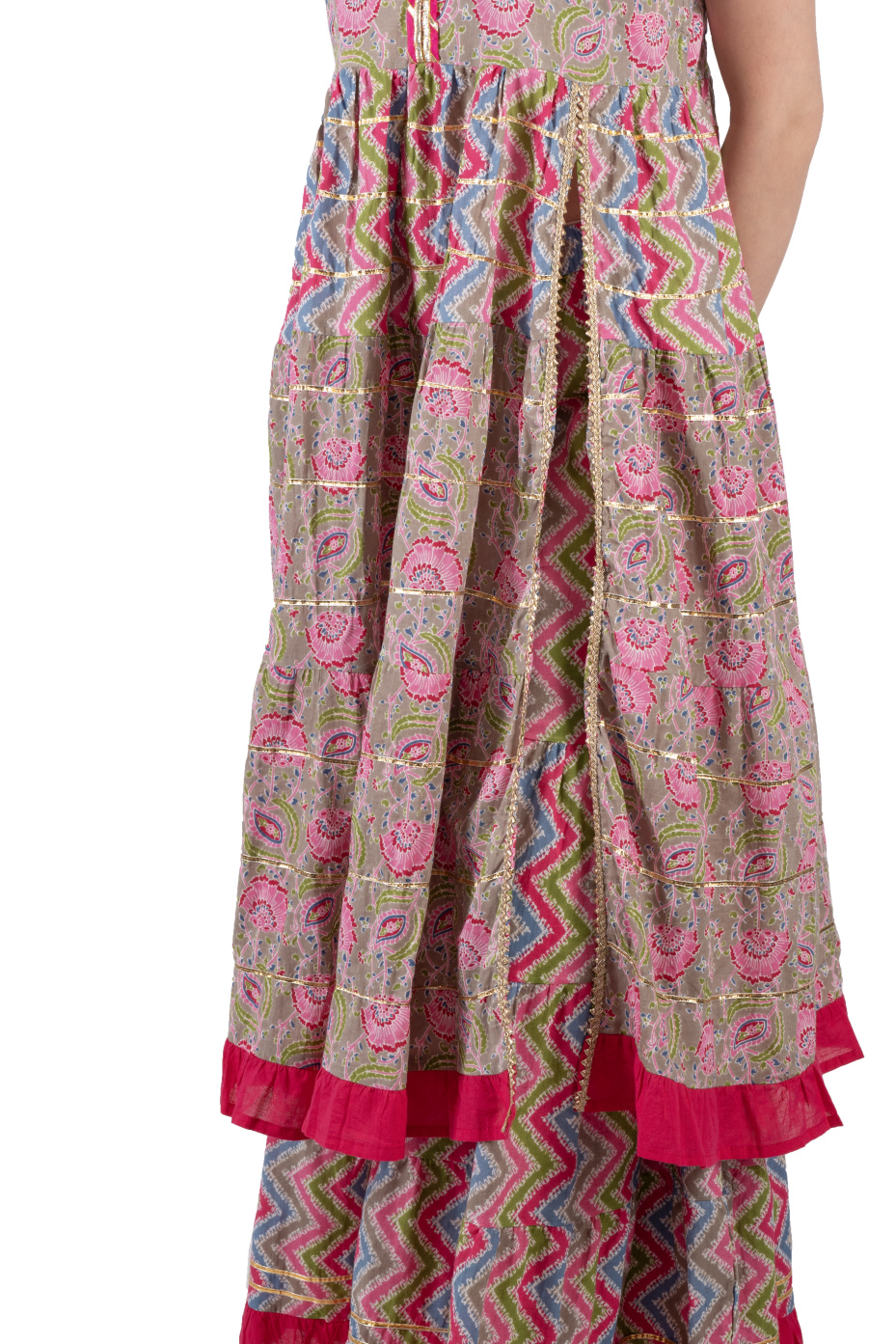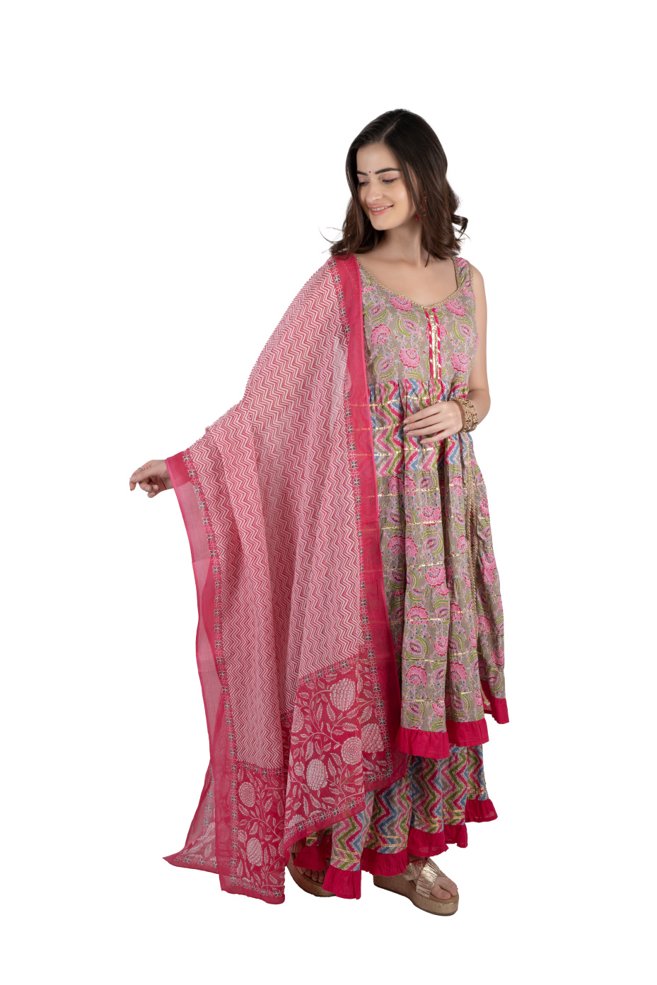 Seize family events with this eye-catching pink sharara suit set. The top features a stylish front slit, a V-neck with gota lace, and gota patti in tiers, and the sharara bottom features frills with gota patti detailing. This set comes with a printed dupatta. Made from 100% pure cotton fabric to ensure comfort and breathability. A pair of ethnic footwear, oxidized earrings, and bangles to catch people's gaze at family gatherings.