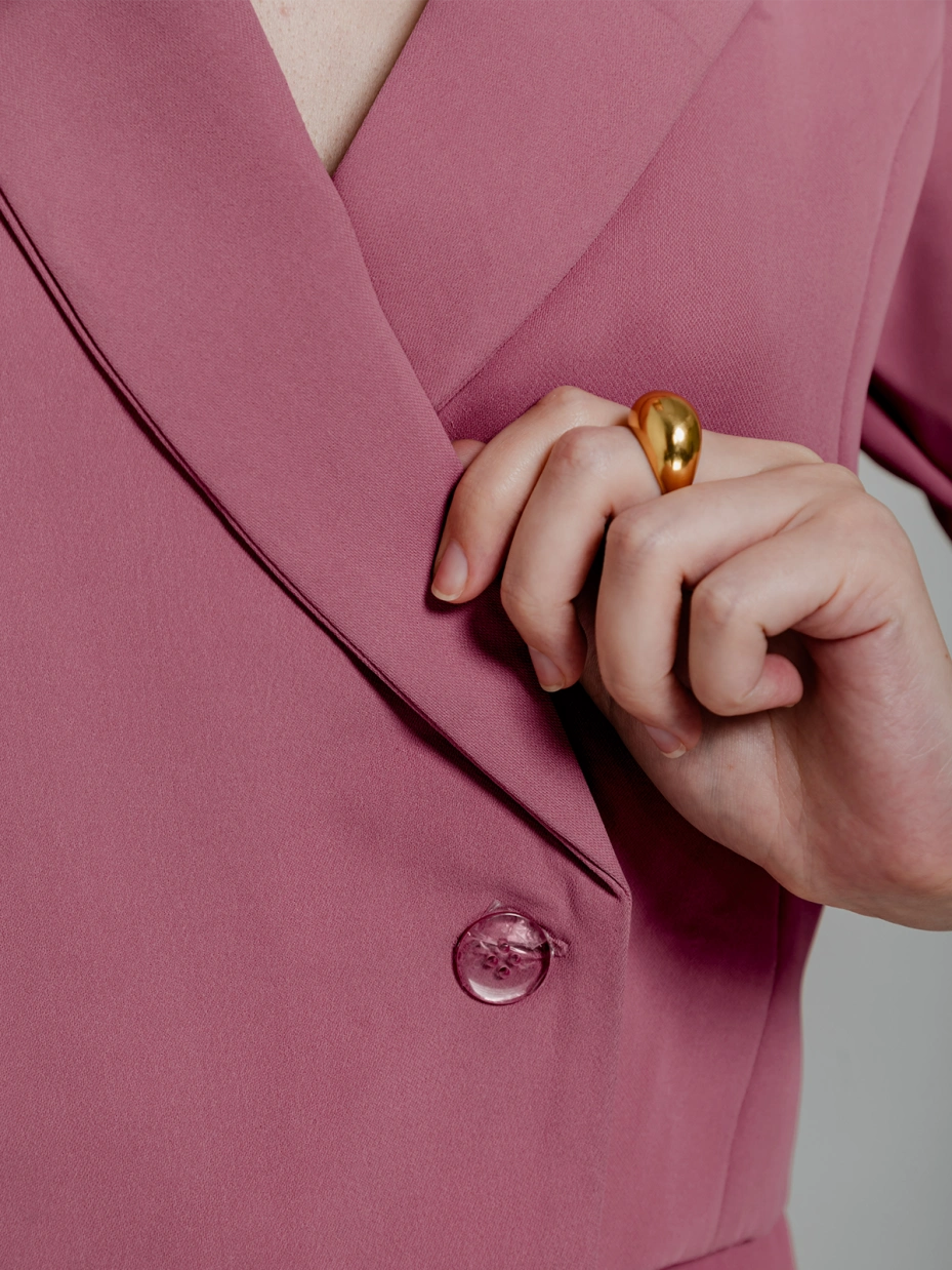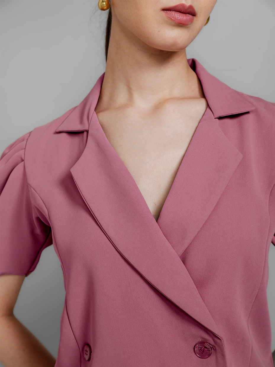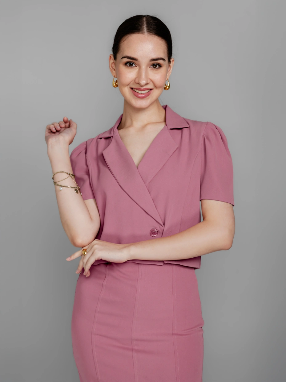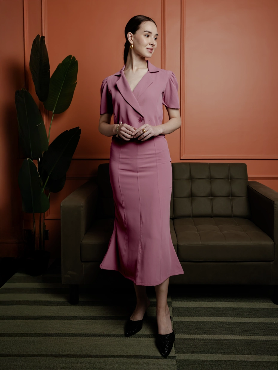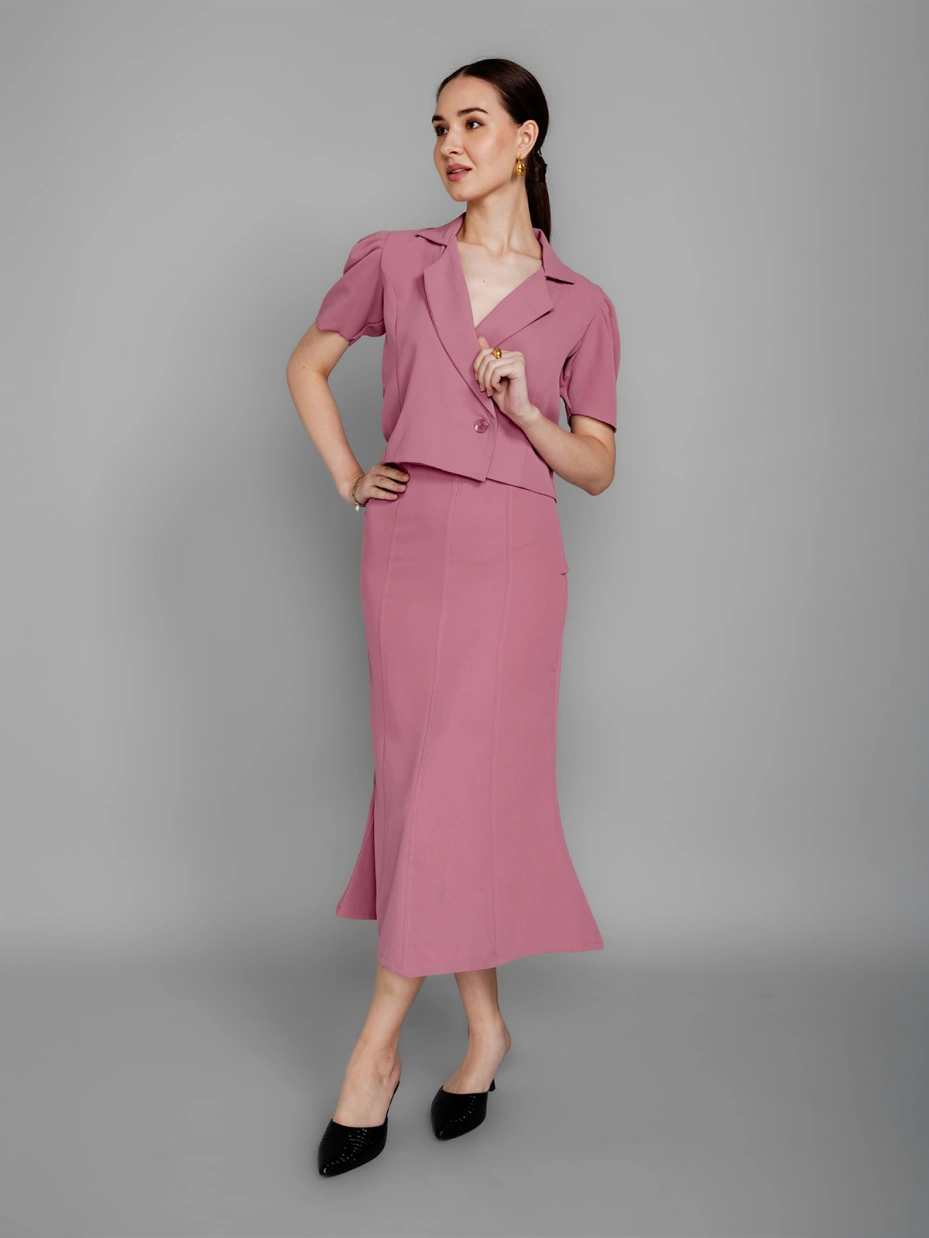 This pink formal blazer with skirt co-ord set for women offers a sophisticated and polished look, perfect for professional settings or formal events.