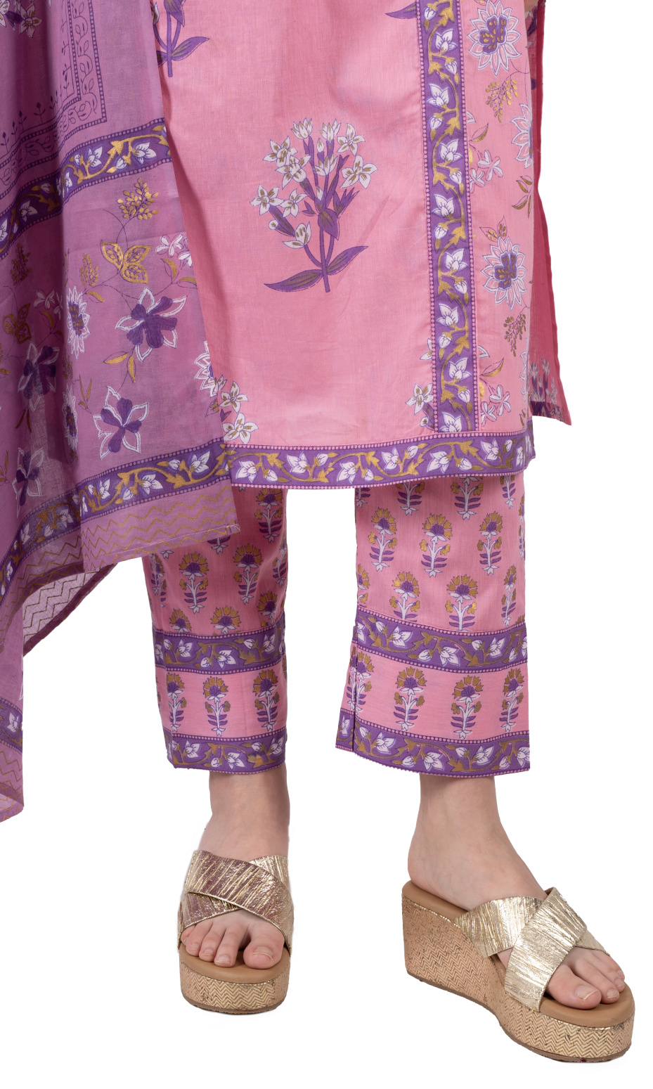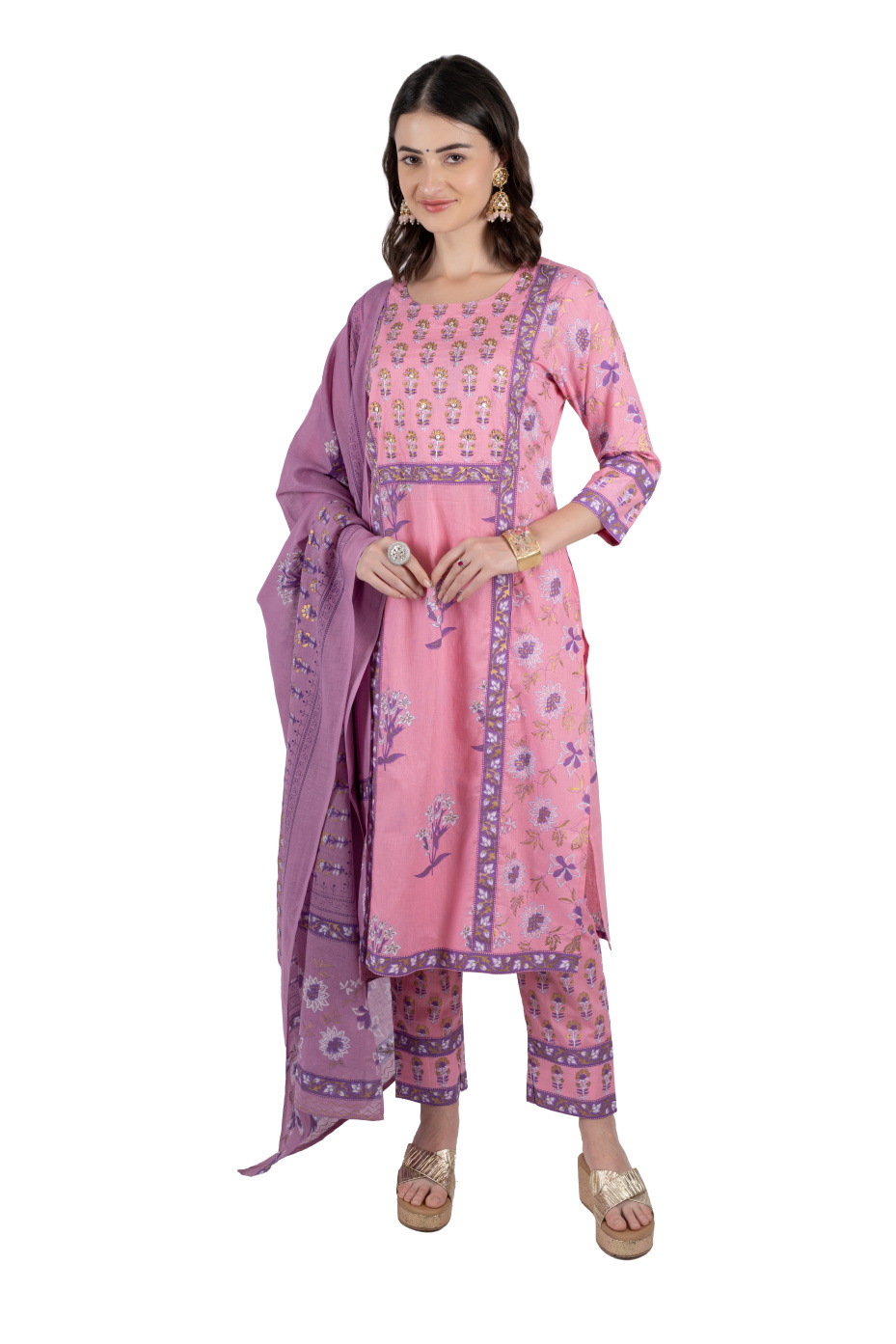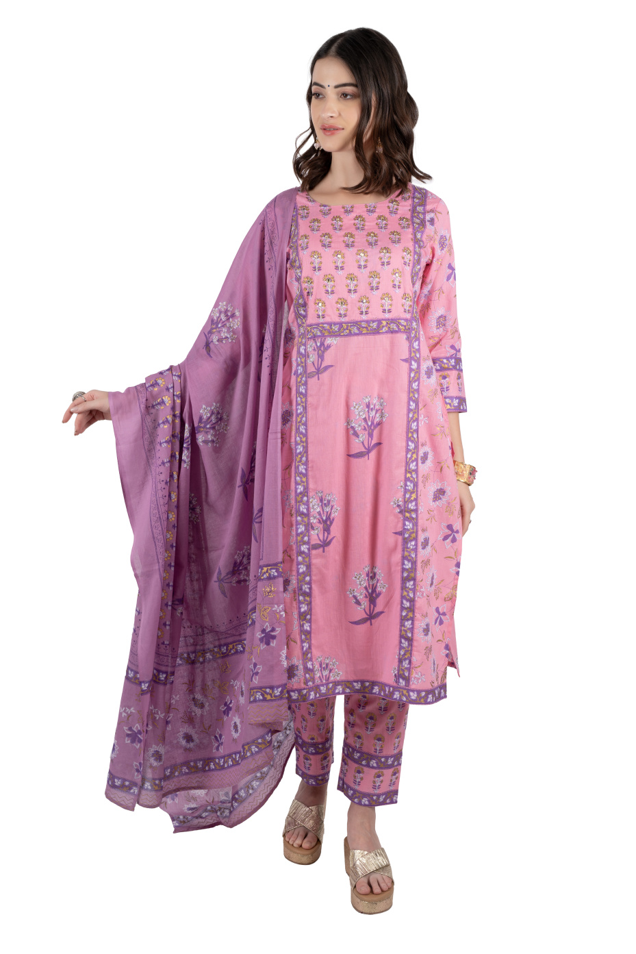 Pink Printed Cotton Embellished Kurta Set With Dupatta