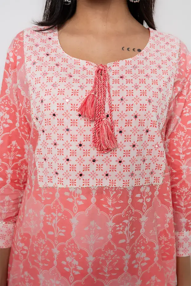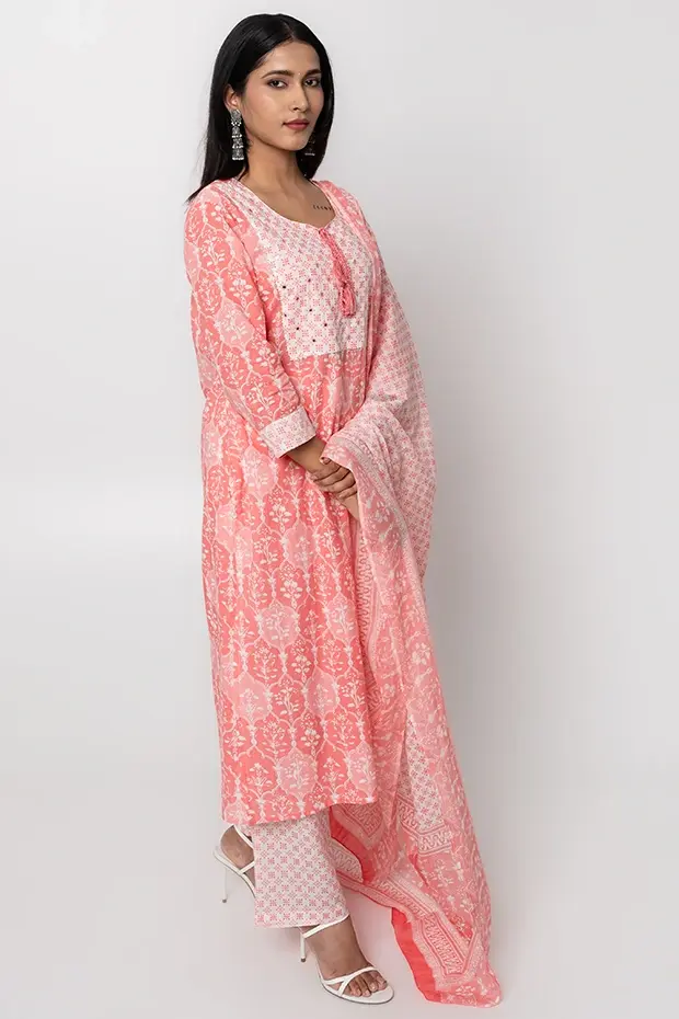 Celebrate the festive season in style in this pink-printed kurta set. It features a round neck with mirror details at the yoke and elbow sleeve. It comes with straight-fit cotton trousers and a dupatta. Made from high-quality, breathable cotton fabric, it ensures long-lasting comfort without compromising style. Level up your festive look by pairing the suit set with oxidized statement jhumkas and white heels.