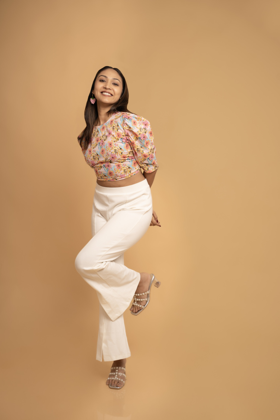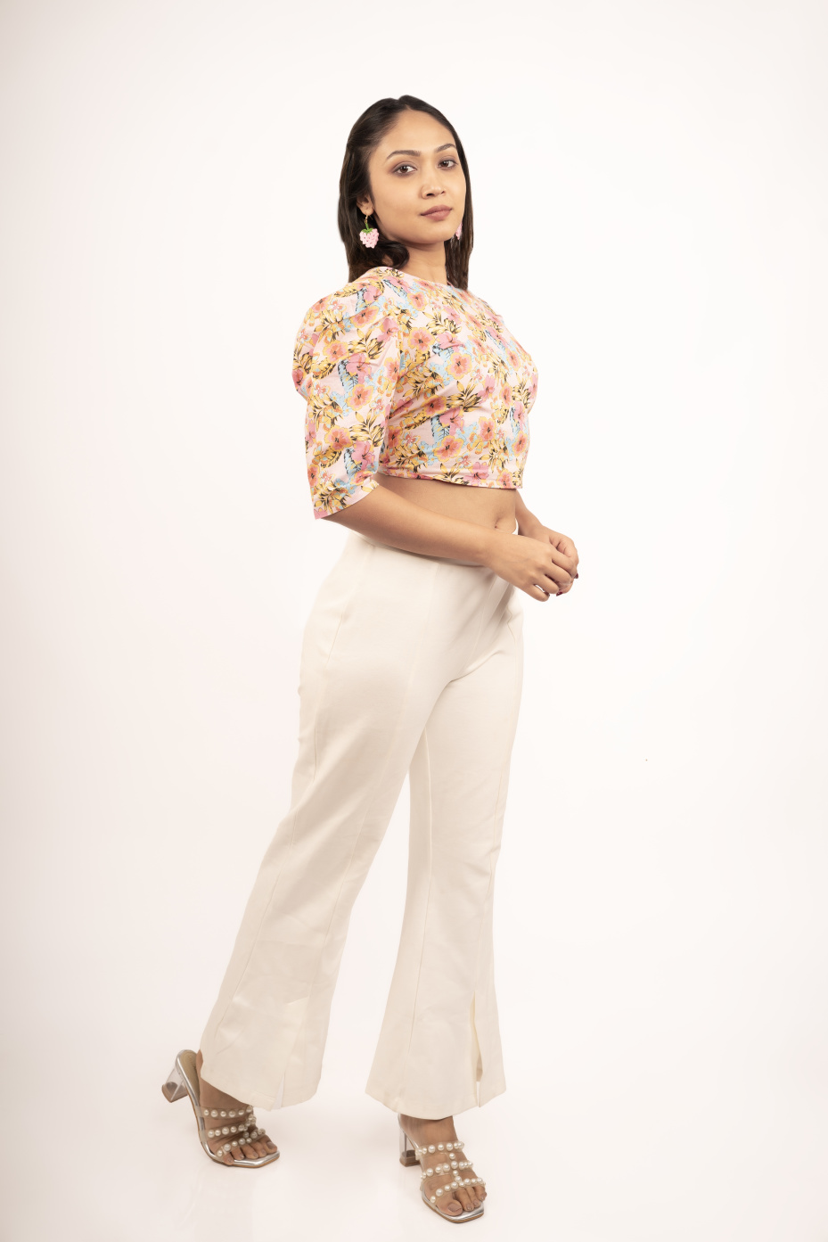 Give your casual wardrobe a perky update with this floral top. It features an all-over floral print, a round neck with elbow puff sleeves, and a cropped fit. Made from high-quality, breathable cotton fabric, the set ensures long-lasting comfort without compromising on style. Style it by pairing it with denim shorts, white sneakers, and sling bag.