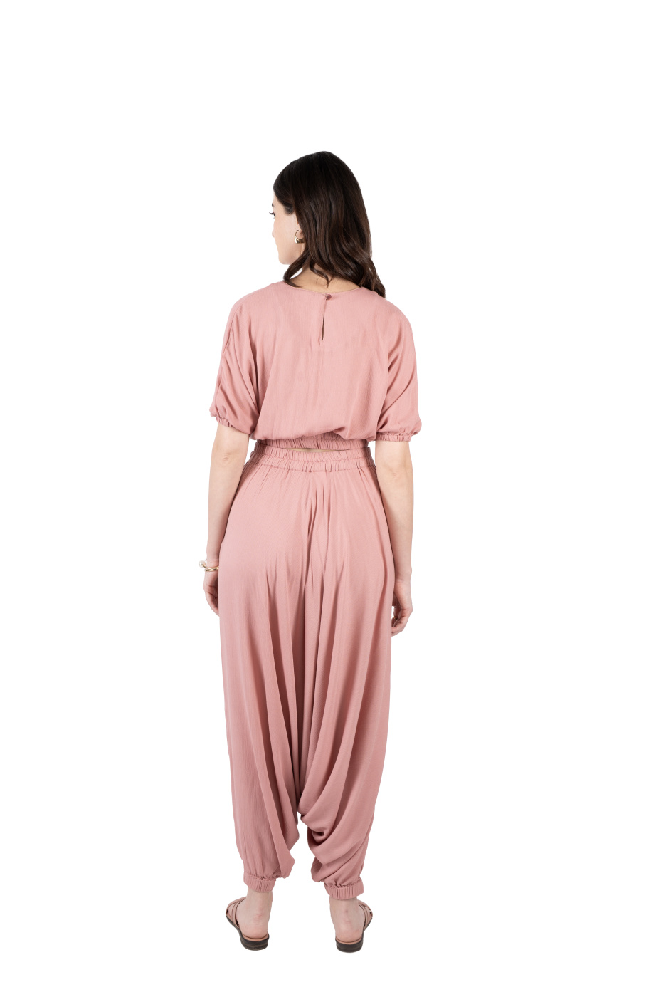 Step out gracefully with friends for a brunch date in this pink dhoti pants co-ord set. The top features a solid all-over pattern, a scoop neck, and batwing sleeves with an elasticated hemline. The bottom features an elasticated waist and ankles. Made from a high-quality rayon fabric that boasts comfort. Pair it with heels, statement earrings, and a sling bag to enhance your look.