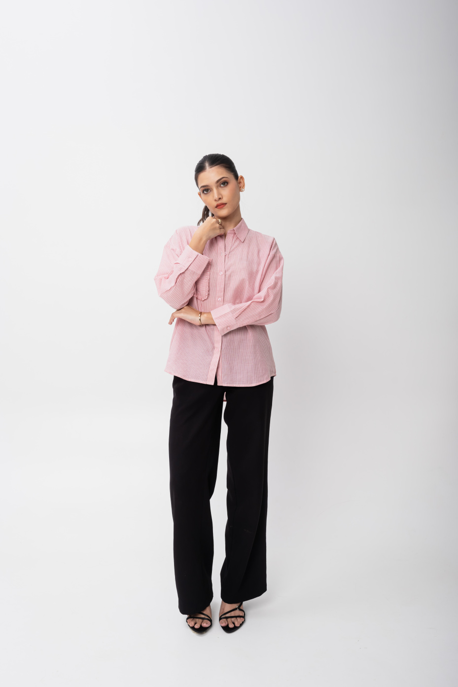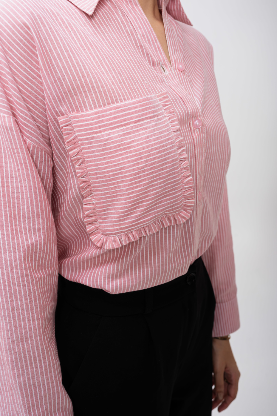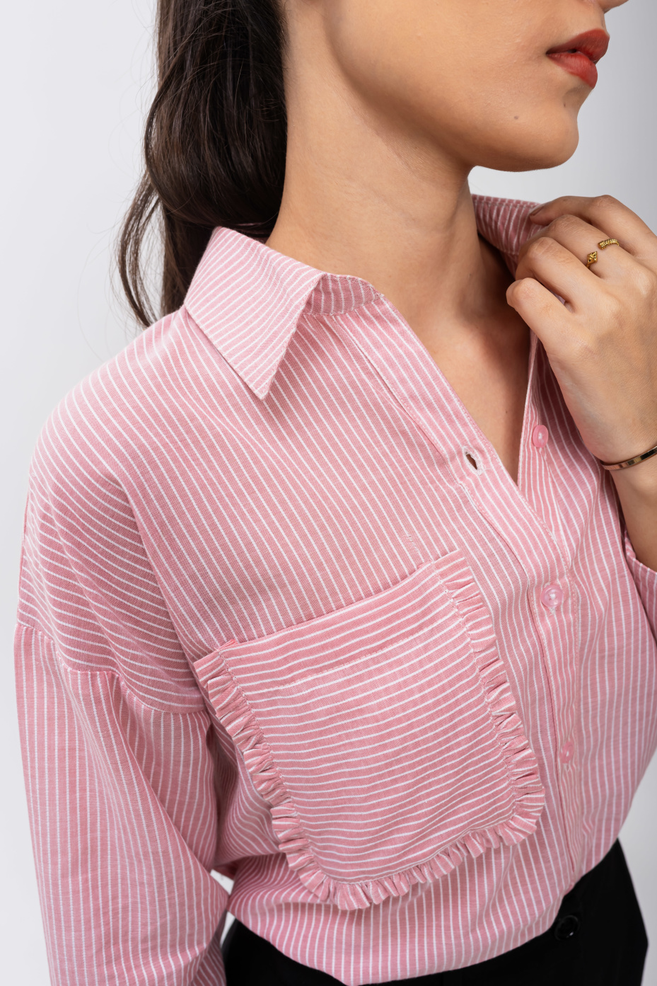 Button up with style in this pink-striped formal shirt. It features a stripe pattern, a collar neck, and full sleeves with a ruffled pocket on the chest. Discover the perfect blend of comfort and style with this cotton shirt.