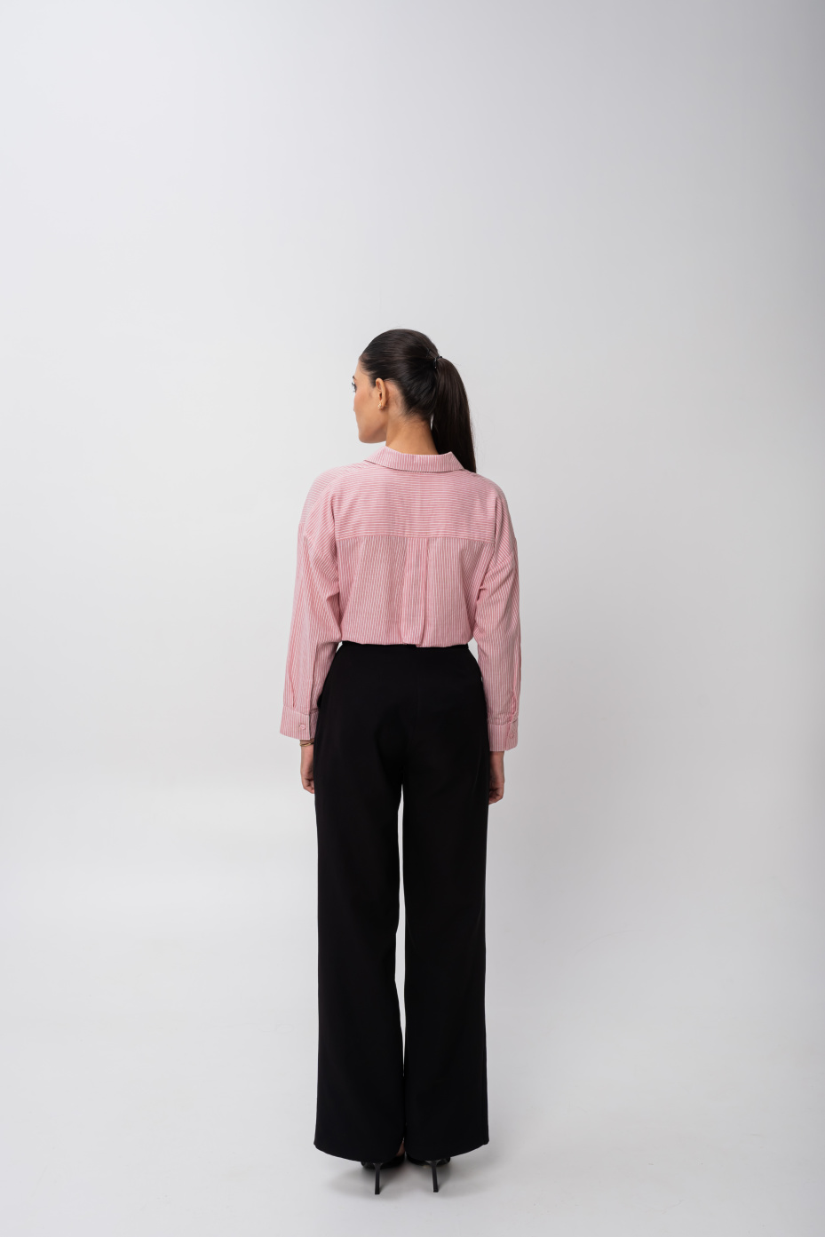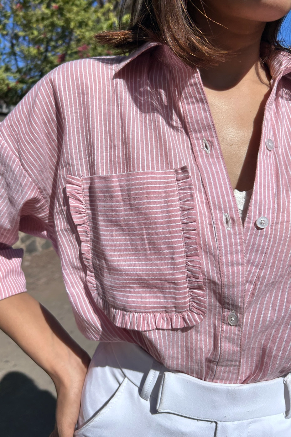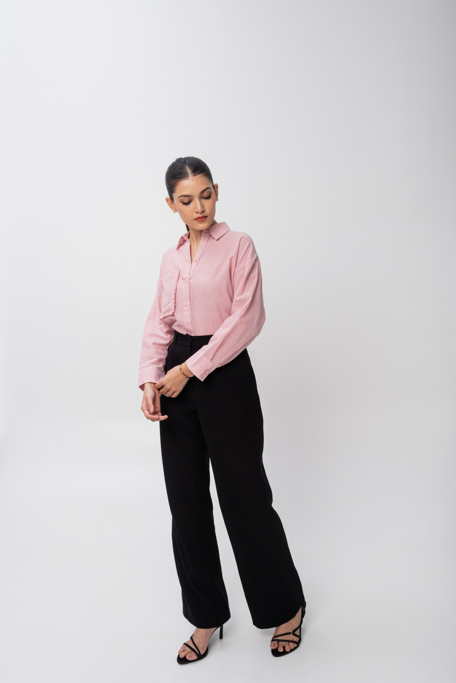 Button up with style in this pink-striped formal shirt. It features a stripe pattern, a collar neck, and full sleeves with a ruffled pocket on the chest. Discover the perfect blend of comfort and style with this cotton shirt.
