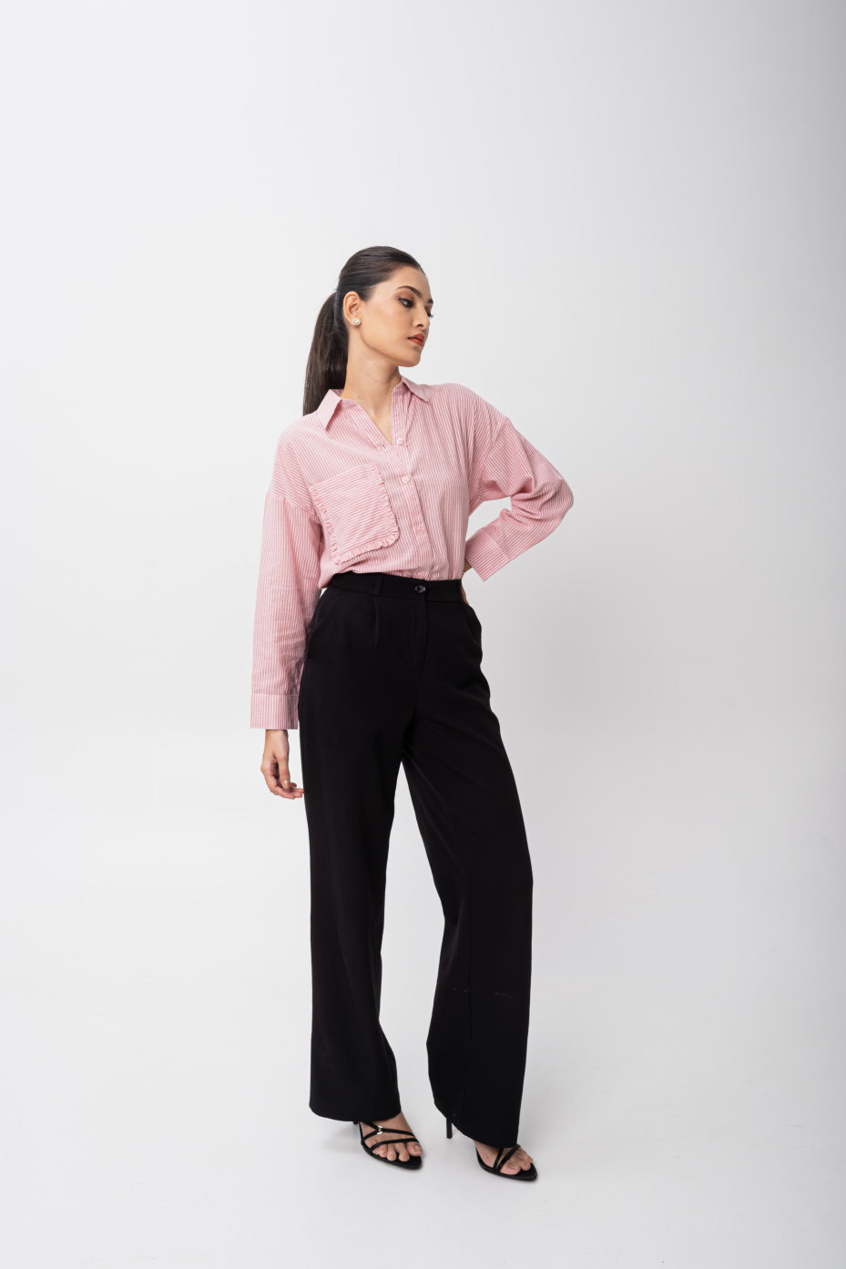 Look for work wear: The ruffle pocket adds a playful, feminine touch to your outfit, so pair it with bold, statement accessories to draw attention to your face and complement the shirt’s unique detail.