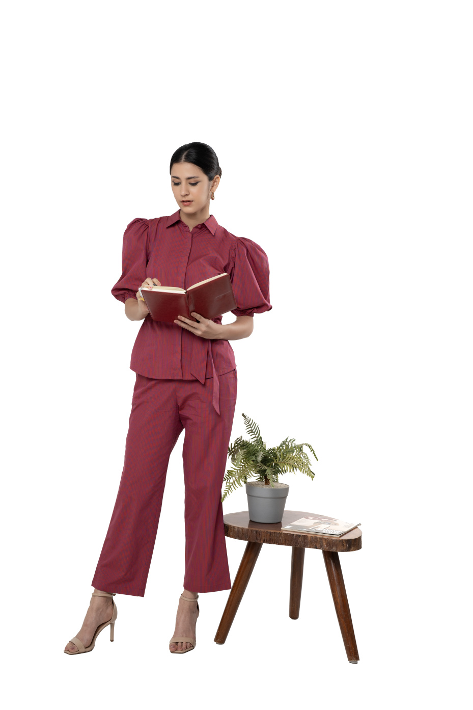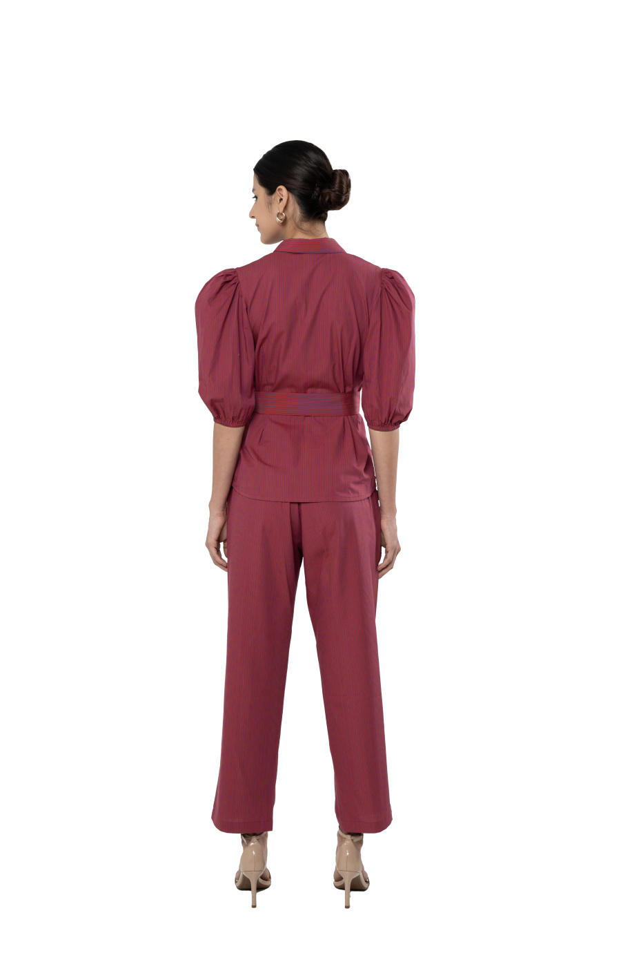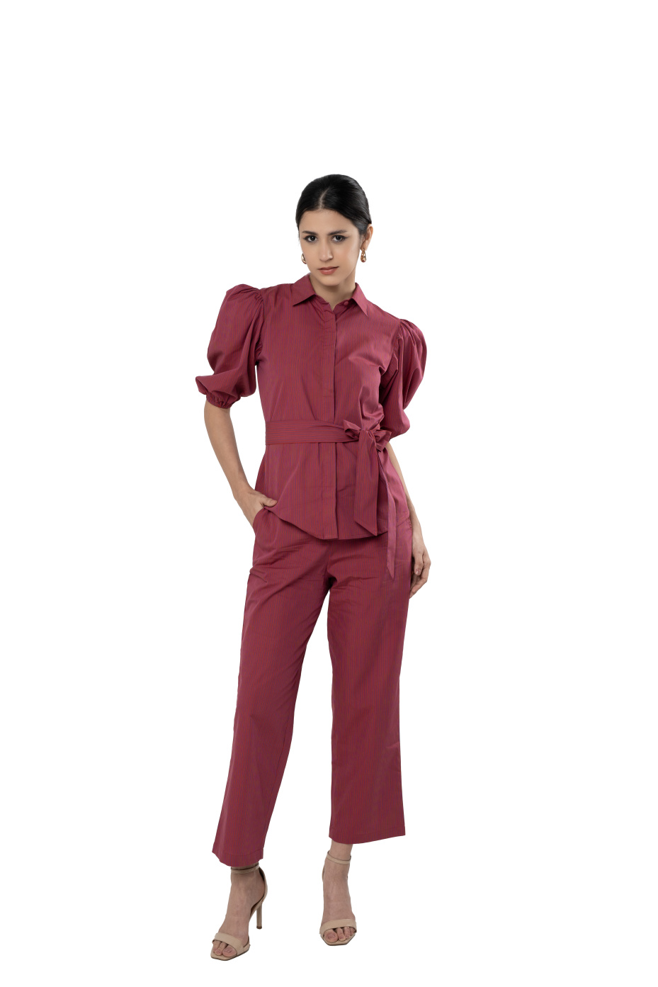Get a sophisticated, office-ready look with this cotton co-ord set. The soft, lightweight fabric will keep you cool and comfortable throughout the day. This pink fine-strip formal co-ord set features a regular collar, puffed elbow sleeves, and a fabric waist belt. Style it individually by pairing the bottom with a white shirt or the top with blue pencil jeans for a sharp look.