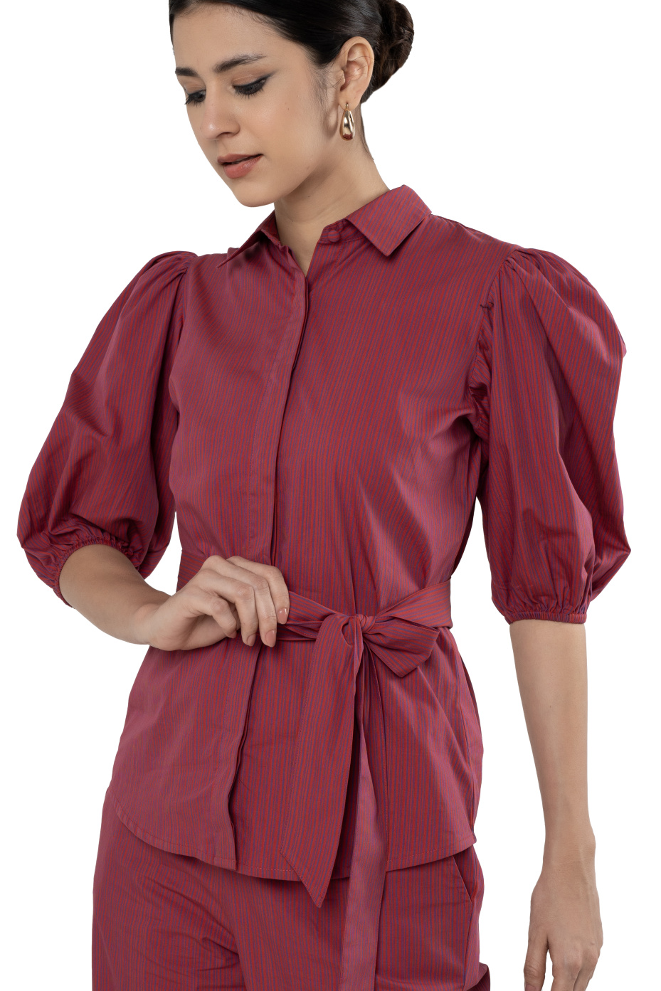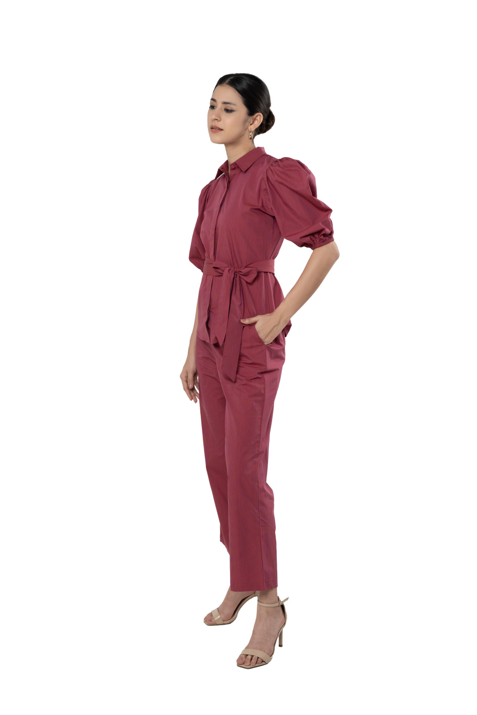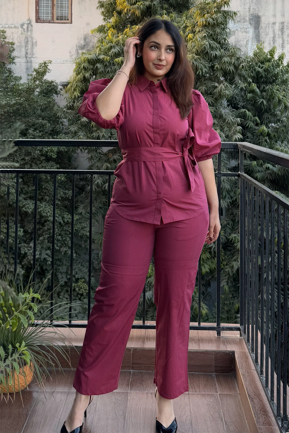 Get a sophisticated, office-ready look with this cotton co-ord set. The soft, lightweight fabric will keep you cool and comfortable throughout the day. This pink fine-strip formal co-ord set features a regular collar, puffed elbow sleeves, and a fabric waist belt. Style it individually by pairing the bottom with a white shirt or the top with blue pencil jeans for a sharp look.