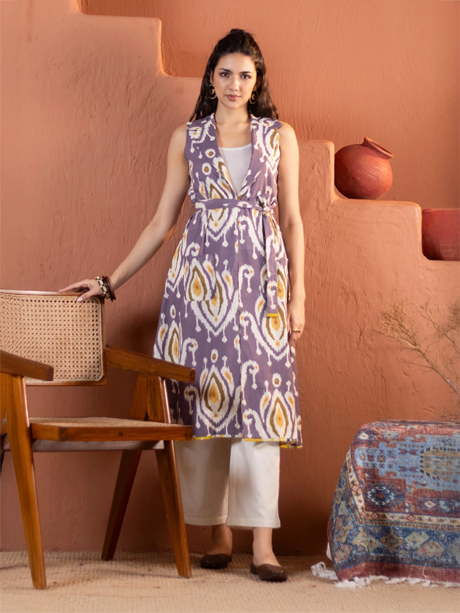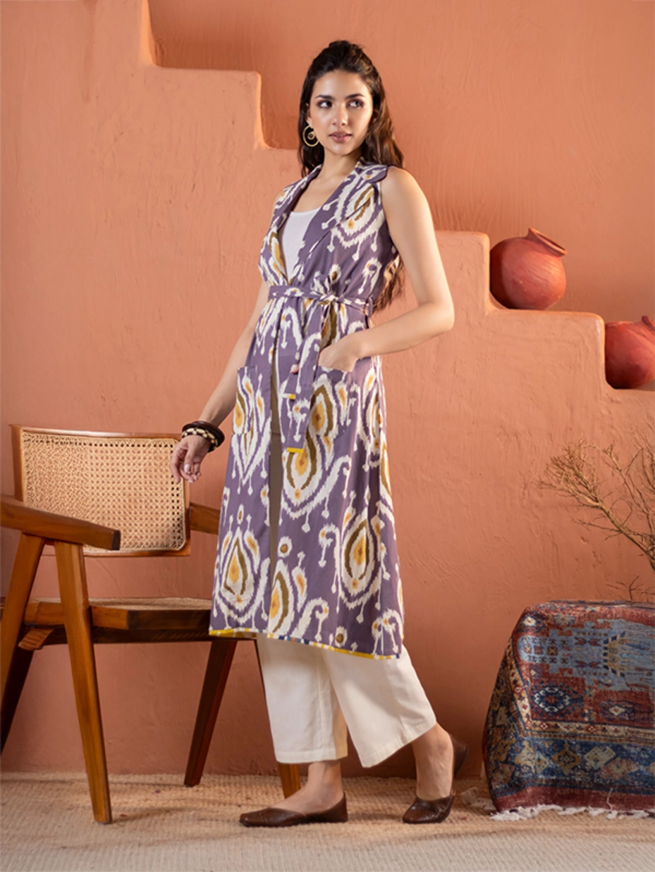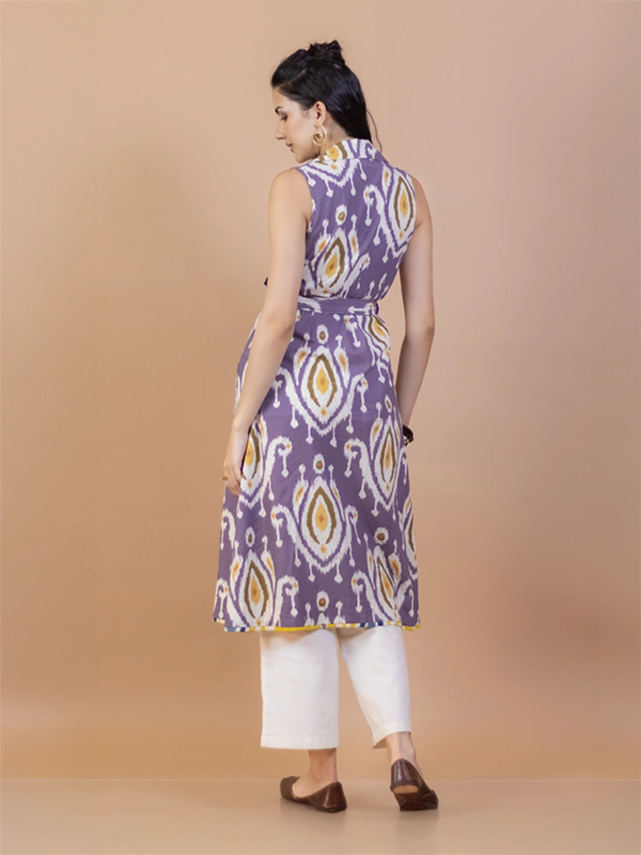 Add a luxe layer with this purple long shrug to your ethnic wardrobe that offers a bohemian vibe. It features an all-over Ikat print, notch lapel collar, sleeveless style, and front tie-up. This captivating ethnic long shrug made from soft cotton fabric ensures you stay comfortable and provides an added layer of style.