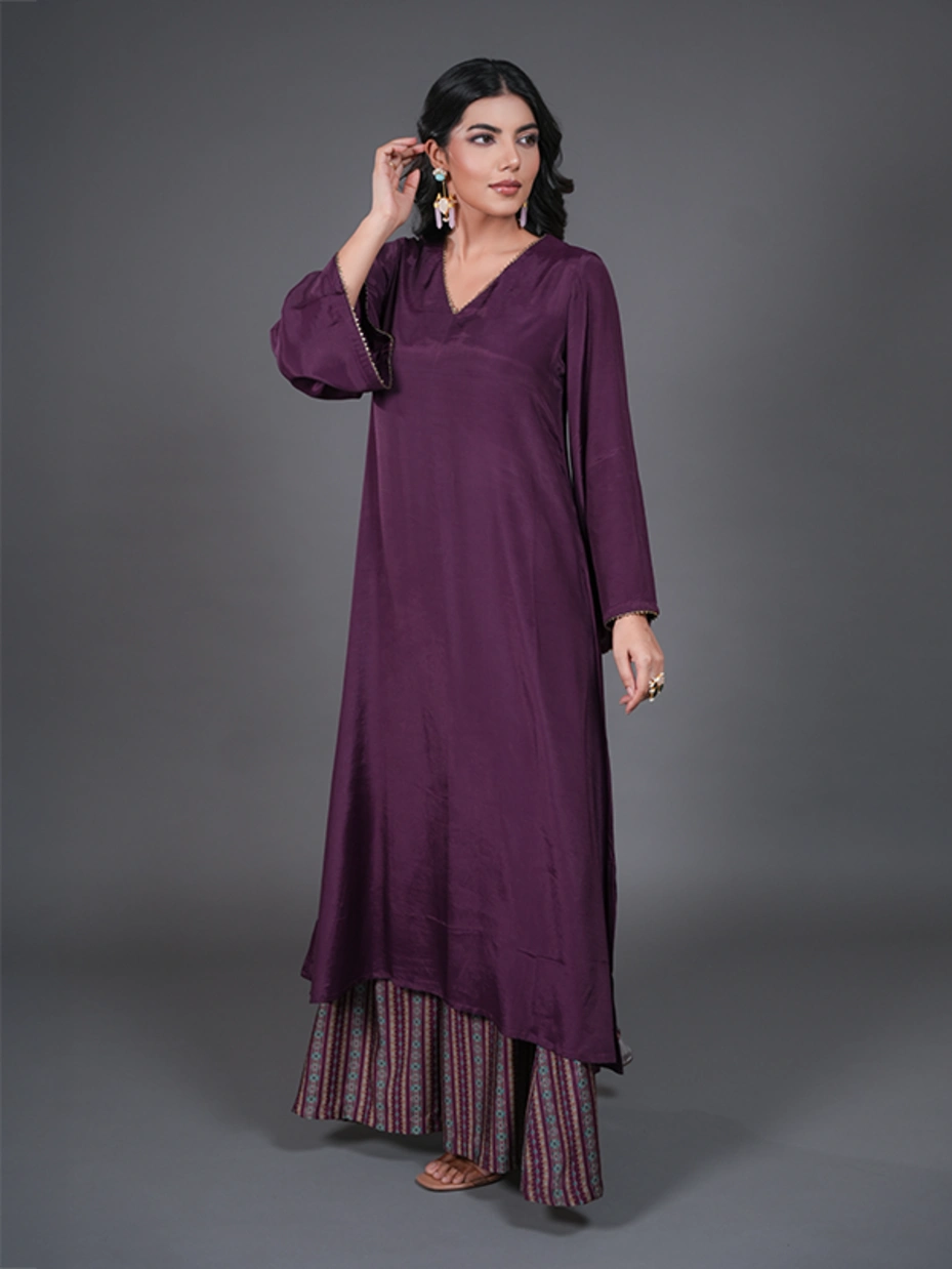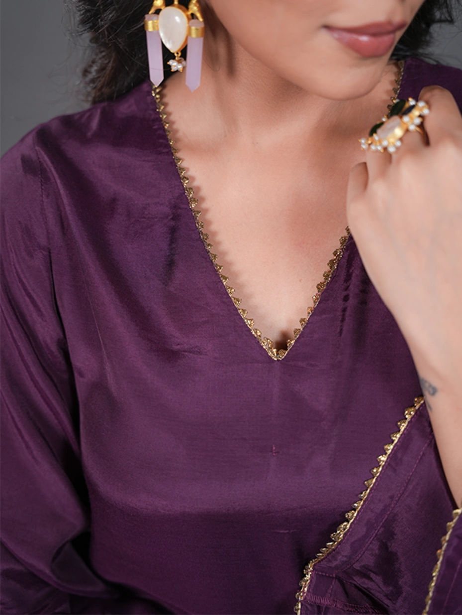 Purple Solid V-neck Kurta Set With Lace Details