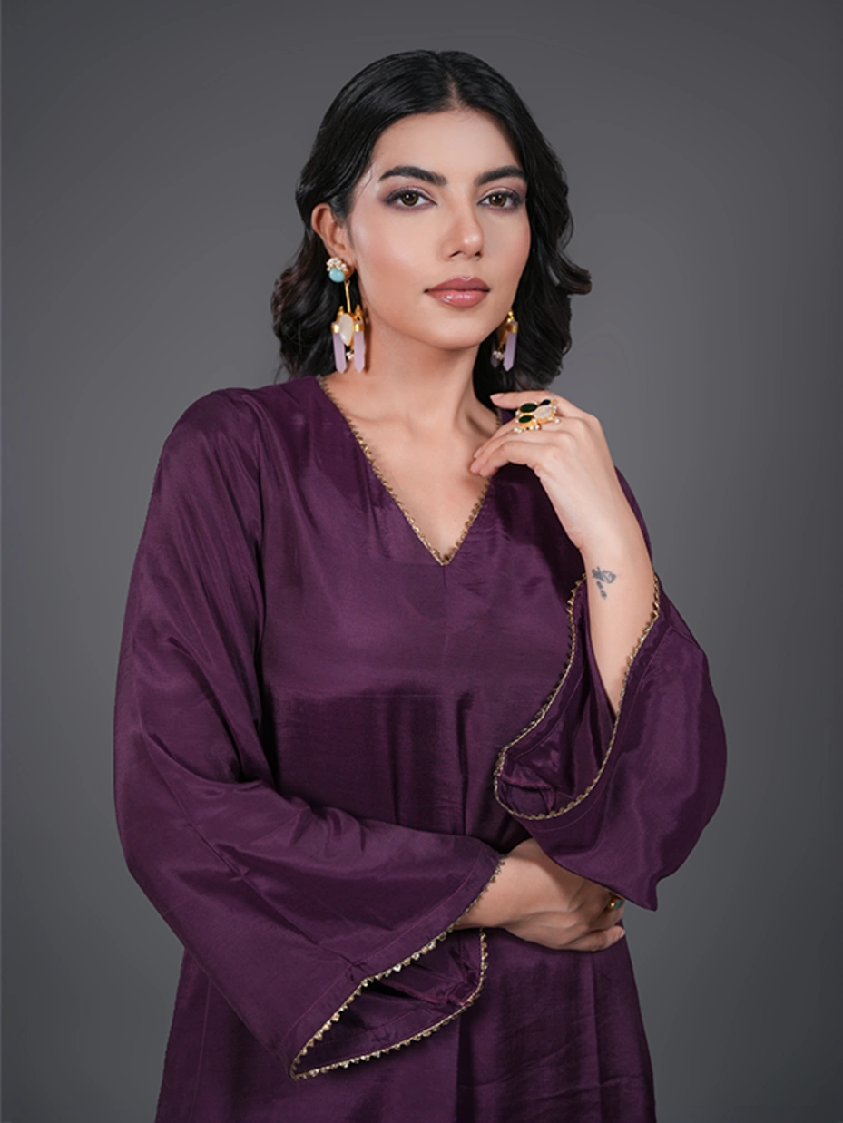 Elevate your festive wardrobe with Purple Kurta Set - a perfect blend of simplicity and elegance. The rich purple hue brings vibrancy, while delicate lace accents add a subtle. Made from lightweight, breathable fabric, this set keeps you comfortable yet stylish for pujas, festive brunches, or evening gatherings.