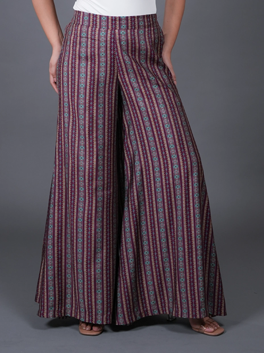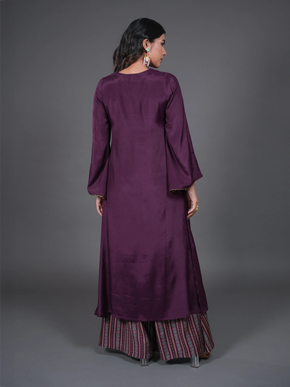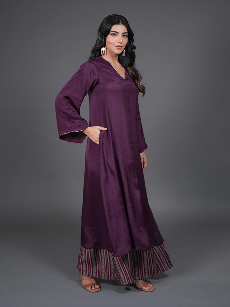 If you are looking for an attire that embraces celebration, then this purple kurta set embellished with samosa lace is your go-to. The kurta set includes a kurta and a palazzo. The kurta features a solid purple color, a V-neck, full sleeves, and samosa lace near the neck and sleeve hem. The pant features a stripe pattern and a flared fit with a two-sided pocket. Crafted from poly cotton fabric to offer lustrous shine and all day comfort.