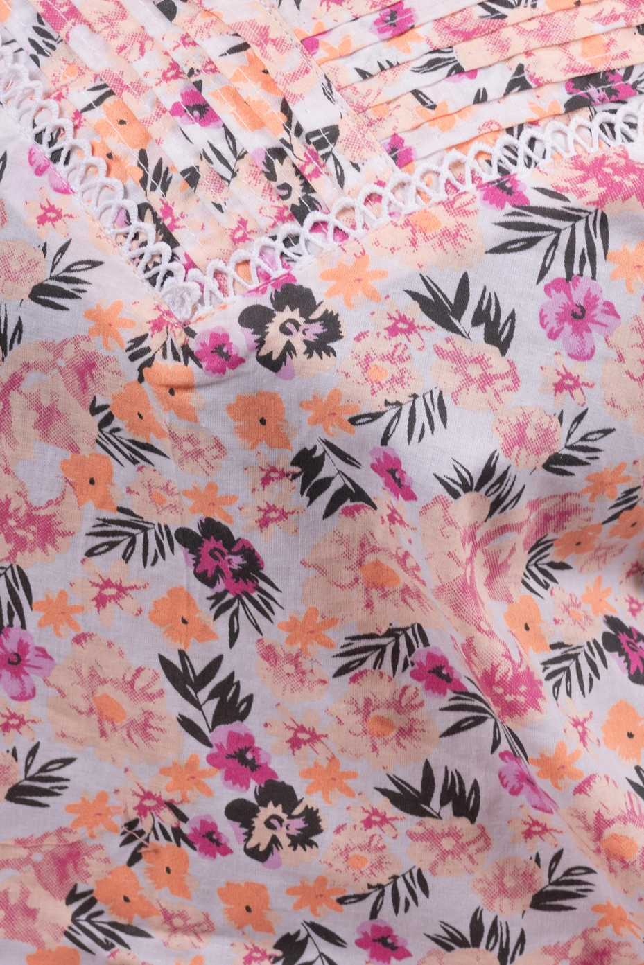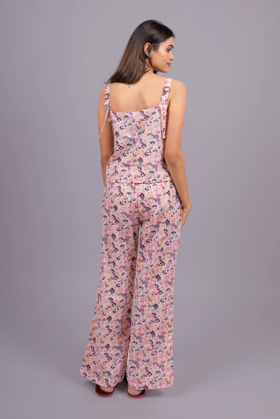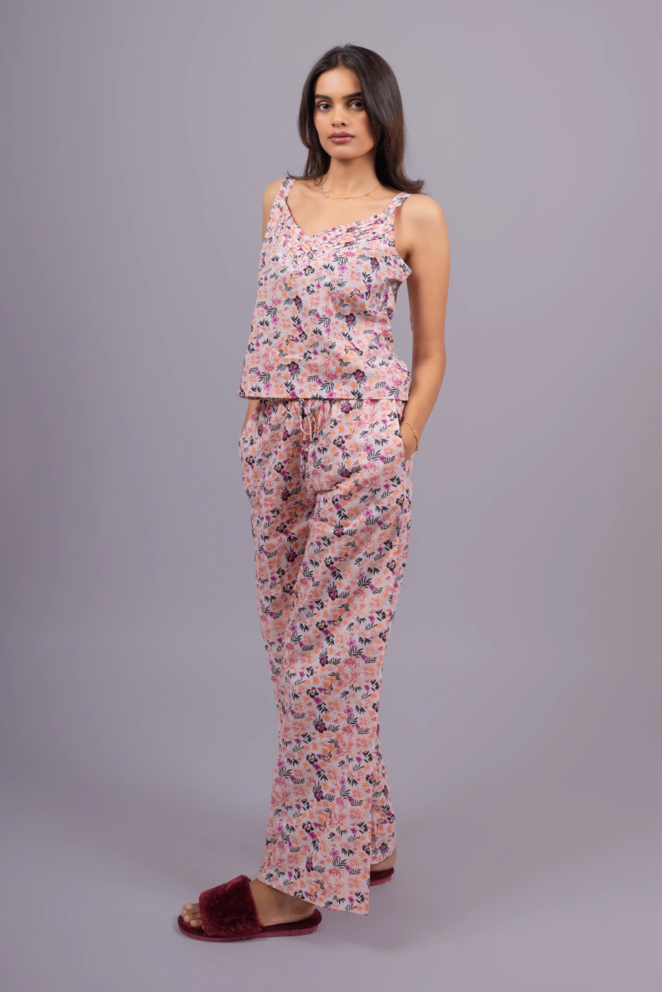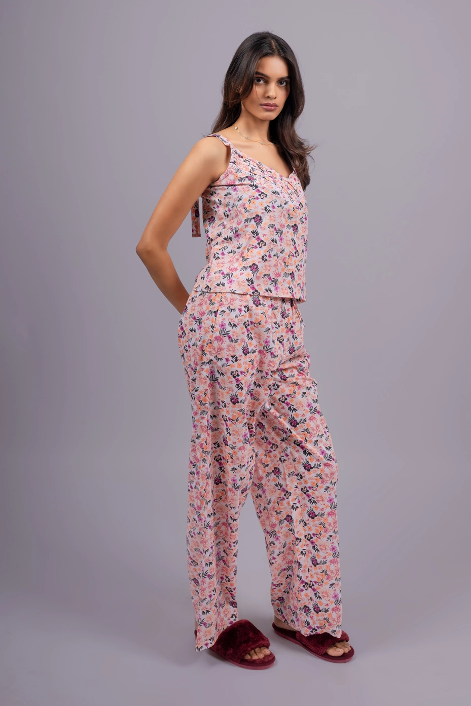 Are you planning to host a pajama-themed dance party at home? Then, this whimsical floral-printed loungewear with lace detail is perfect to dance the night away. The cami top features a V-neck with lace details and a sleeveless style. The bottom features a relaxed fit with a two-sided pocket. Rock and roll in this comfiest matching set made from cotton fabric.